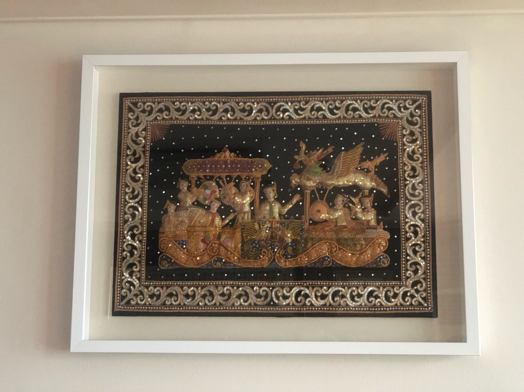 액자가 작품을 한껏 돋보이게 한다. 지난 겨울 미얀마 선생님들이 준 환갑 기념 선물을 반 년만에 표구해서 벽에 걸었다.