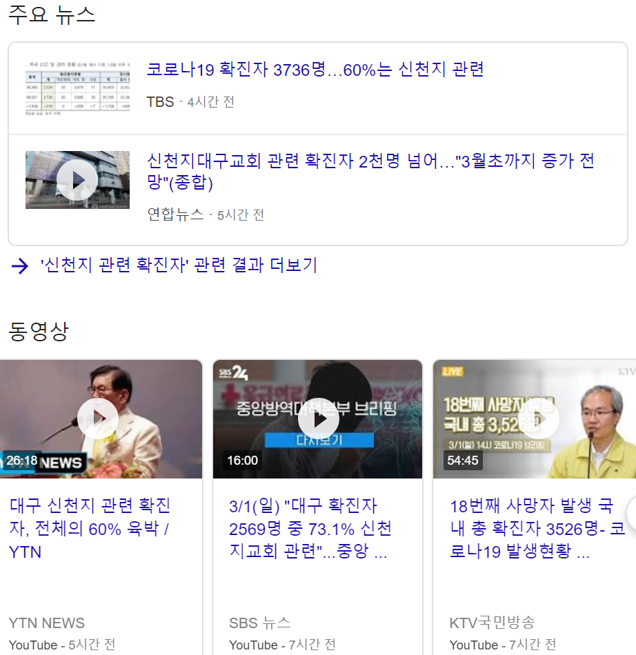 2020년 3월 1일 밤 현재 코로나19 바이러스 확진자가 총 3,736명 그 중에서 신천지교회와 관련있는 사람은 60%이고, 대구만 국한해서 보면 확진자 2,569명 중 신천지 교회와 관련이 있는 사람의 비율이 73.1%라고 한다.(아래 첫 번째 스크랩 참조)