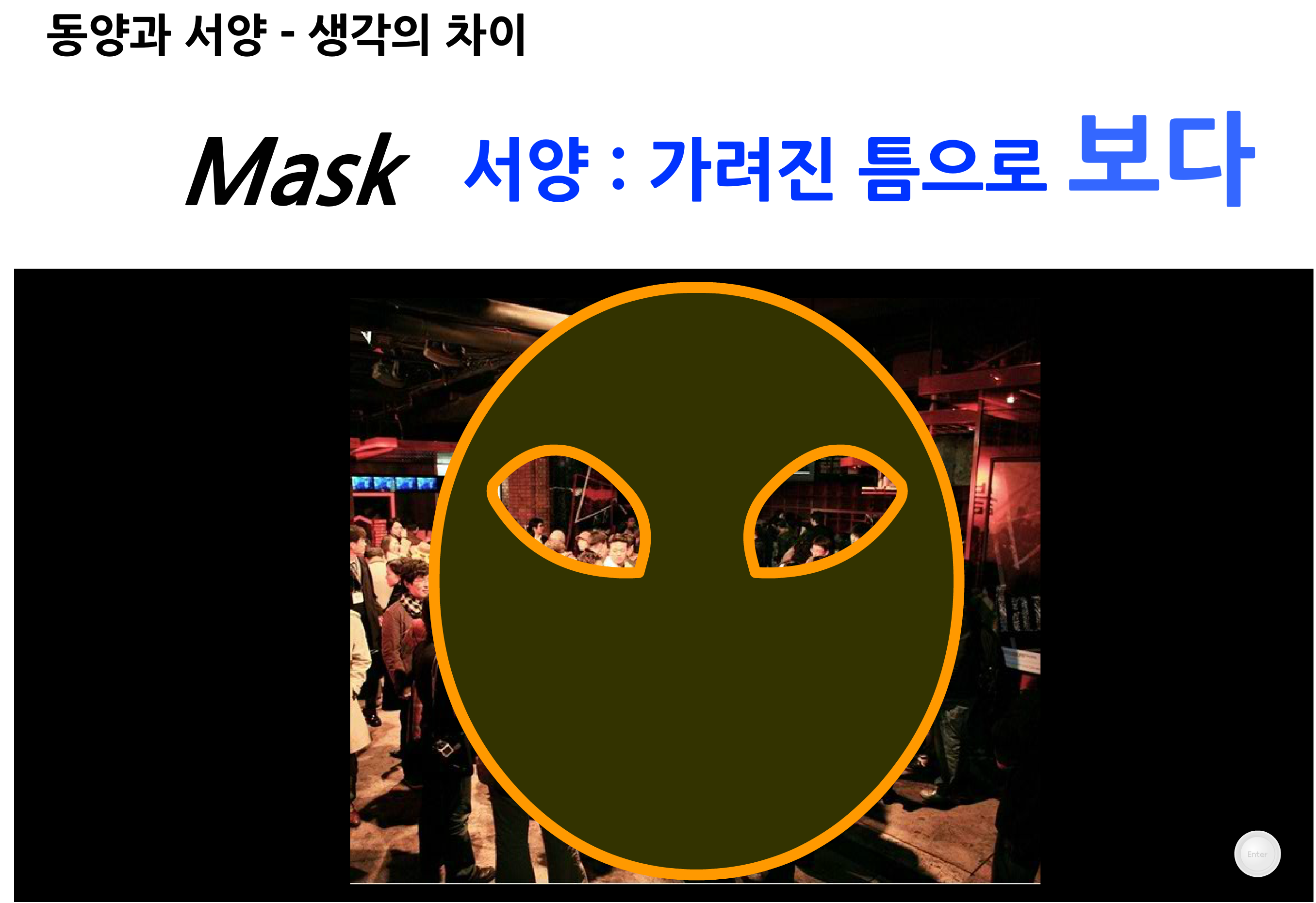 마스크의 의미는 어떻게 다를까? 우리는 마스크를 쓰면 나의 얼굴을 가려서 나를 보호하는 걸로 여긴다. 나의 신분이 노출되지 않게 하고, 남의 침방울이 나에게 미치지 않도록 하는 용도이다. 민낯을 가리는 용도로 사용하기도 하고, 재질이나 색상, 형태를 다양화해서 패션으로 이용하기도 한다.