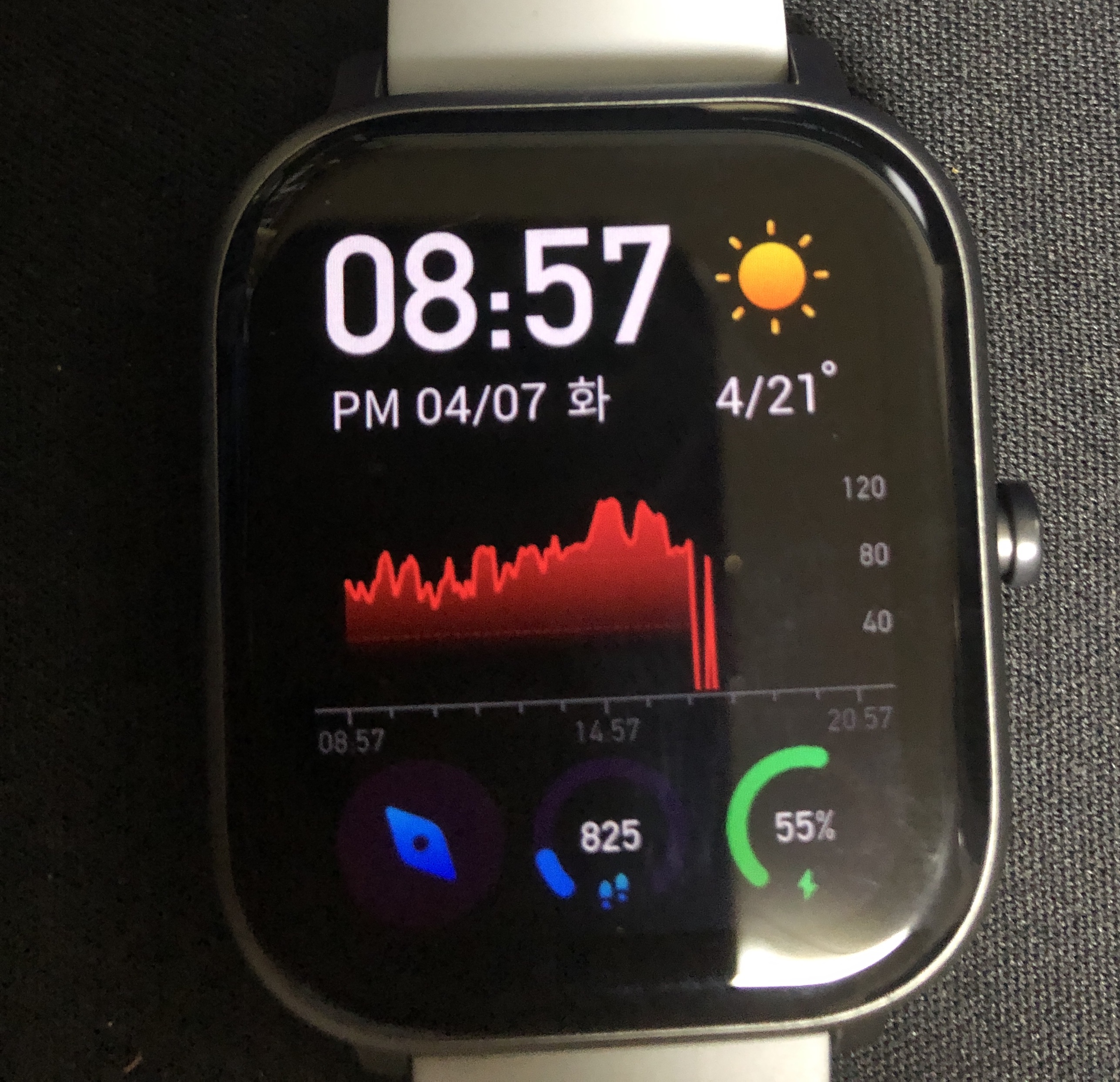 반 년 전 쯤에 구입했던 어메이즈핏빗 라이트 버전 스마트 워치가 블루투스 에러가 생기면서 무용지물이 되어 버렸다. 시간이 미얀마 시간대로 고정되어 버렸다. 몇 달을 고민하다가 그건 다음에 미얀마 가면 미얀마 사람에게 줘버릴 결심을 했다. 대신 어메이즈핏 GTS 버전을 구입했다. 이건 빗 버전보다는 상당히 세련된 디스플레이를 가졌다. 기능도 몇 가지 추가되었다.
