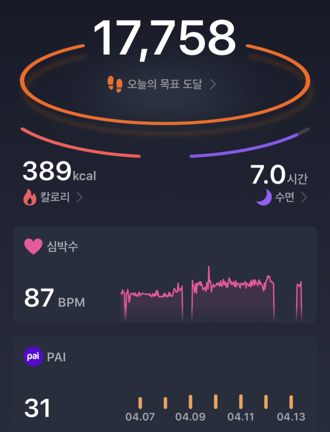 목표 걸음 하루 8천보. 1주일에 이에 도달하는 날이 별로 없다. 카트를 타지 않는 골프장 18홀 라운드 결과 목표의 두 배 이상을 달성했다. 가능하면 이 골프장에 가야겠다. ㅋ