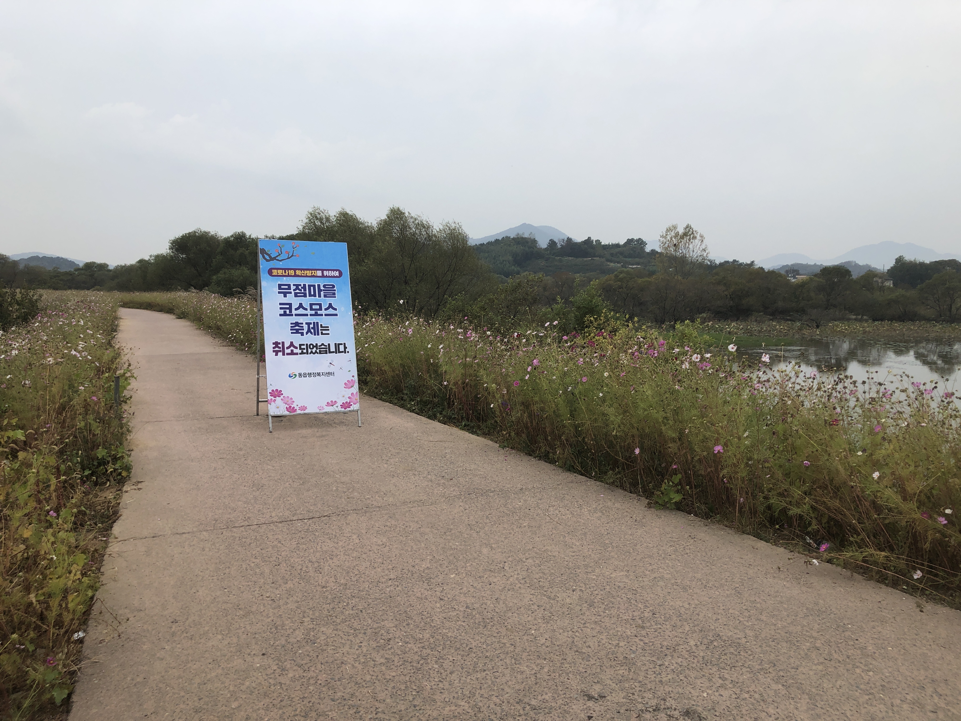 이미 코스모스는 거의 시들었고, 코스모스 축제가 취소되었다는 안내판이 떡하니 버티고 있다.