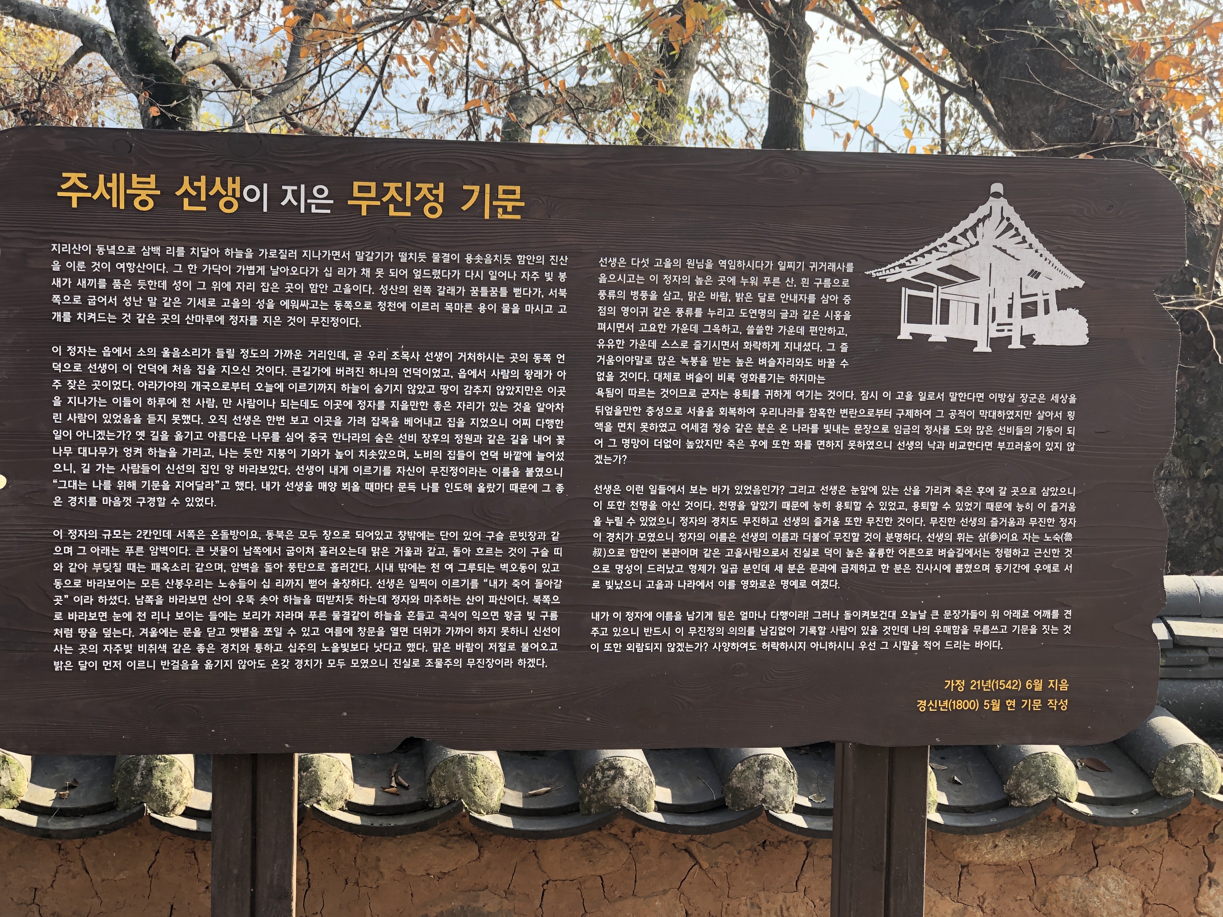 함안면 사무소 소재지 동네를 처음으로 가봤다. 시장통에 있는 국밥집에서 맛있게 점심 식사를 하고 무진정으로 향했다. 이 정자는 조선조에 조삼 선생이 낙향하여 지은 것이라 하는데 주변 풍광이 아기자기하니 상당히 멋지다.