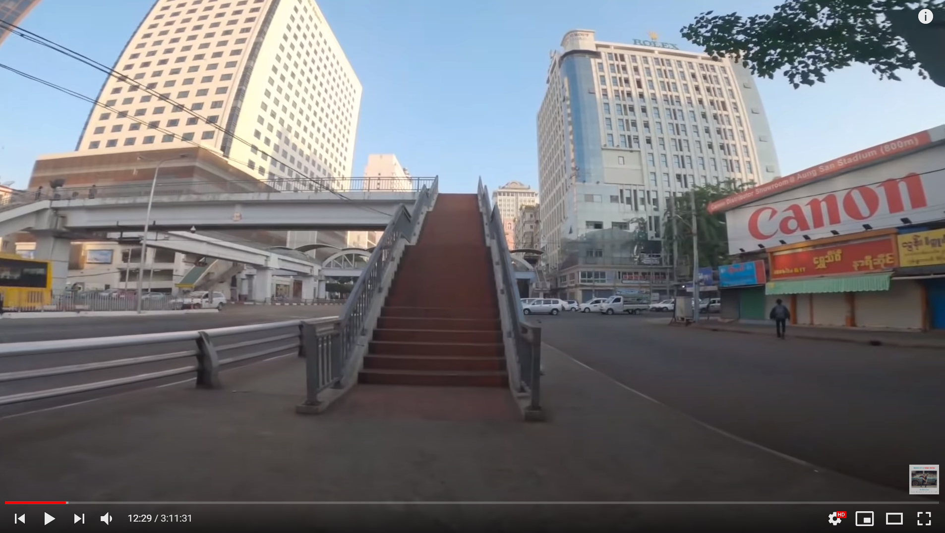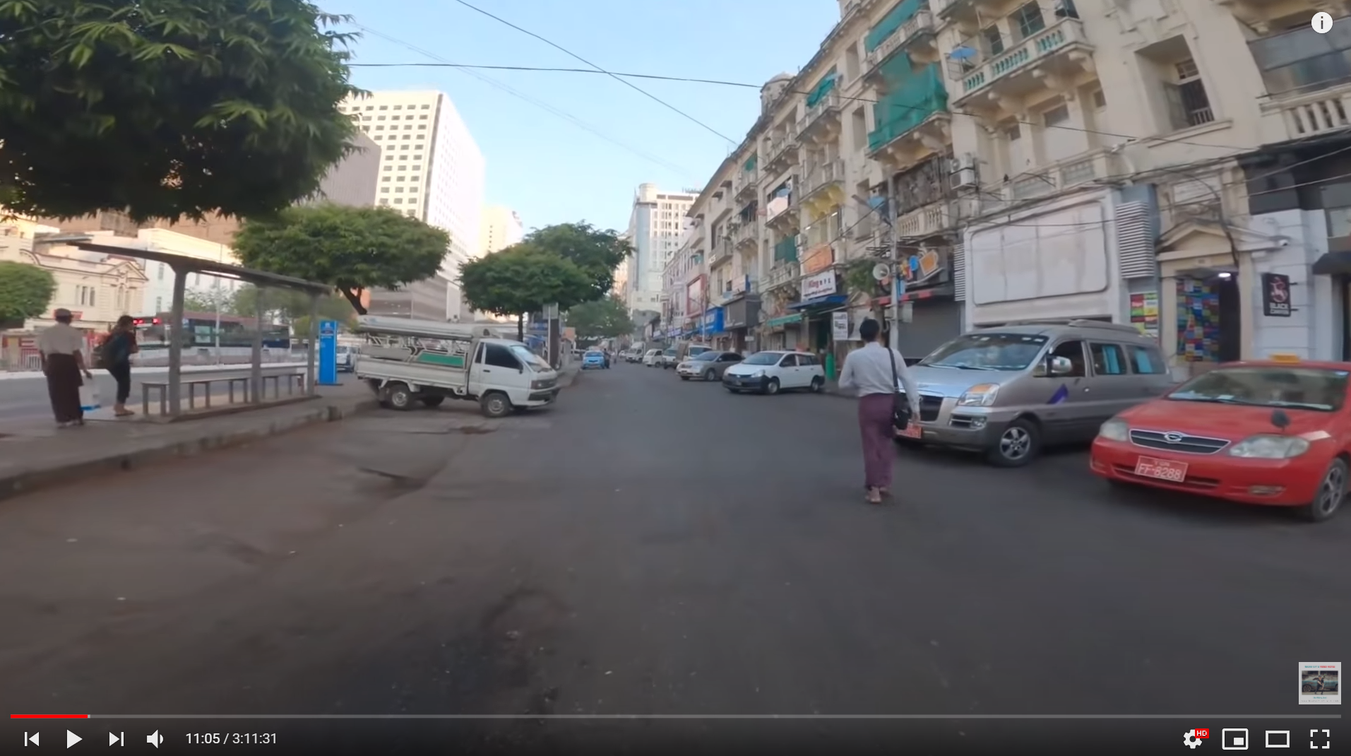 그 중 양곤 시내를 걸어서 투어한 영상에 대한 해설과 소감을 적어본다(동영상 원본에는 해설과 자막 등이 없다). 동영상의 원작자는 쪼 냉 린이며 그의 채널은 다음 주소를 클릭하면 된다.