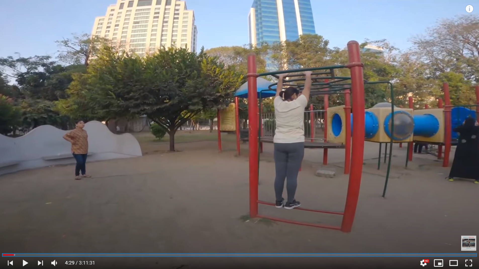 풀만 센터 포인트 호텔(Pullman Yangon Centrepoint Hotel)이 보이고, 시소, 미끄럼틀, 그네, 철봉 등 좀 오래된 버전의 기구들이 있는 어린이 놀이터도 있다(04'10"). 그런데 어른들이 아이들보다 왜 더 많아?