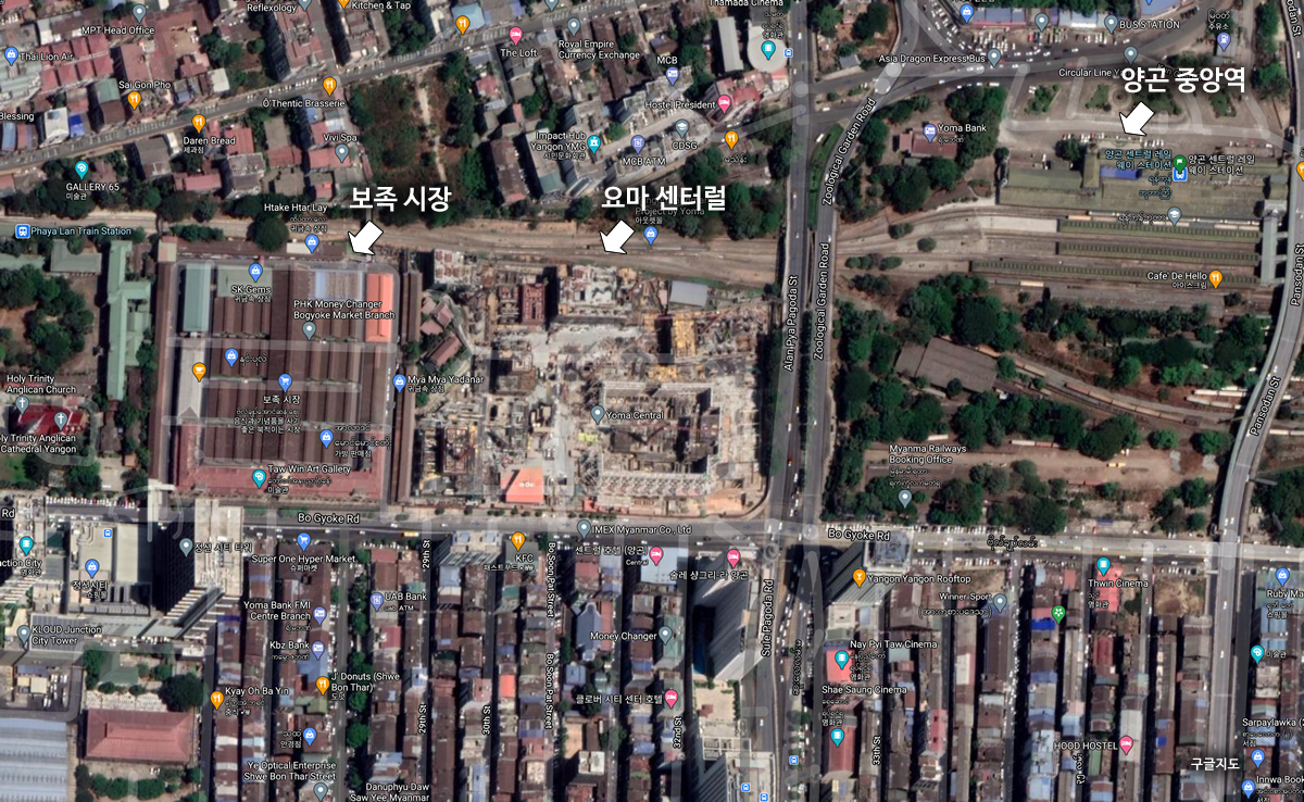 그 옆으로 재개발으로 보이는 큰 공사가 이루어지고 있다(24'10"). 일본 자본이 주도하고 있는 이 사업은 랜드마크 프로젝트로 일컫고 있는데 요마 센터럴(Yoma Central)이라고도 한다. 새로운 양곤의 랜드마크를 만들겠다는 야심찬 사업인데, 일본 기업 미쓰비시가 맡고 있으며, 쇼핑몰 등 다양한 공간이 생길 거라고 한다.