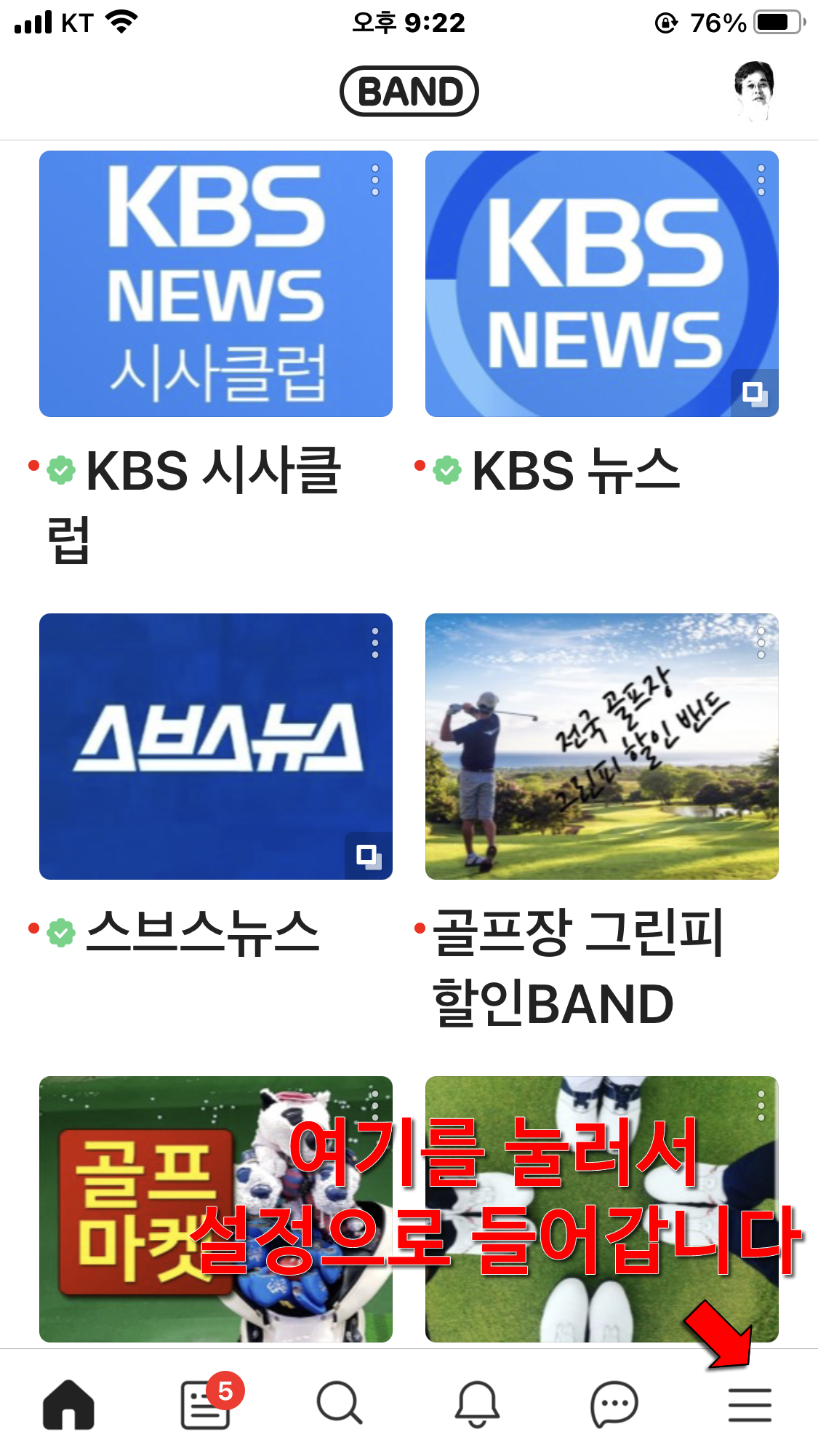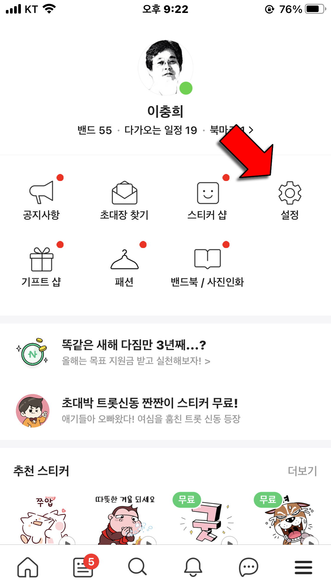 1) 밴드의 홈 화면 아래쪽에 있는 3선 모양의 확장 메뉴를 누릅니다.