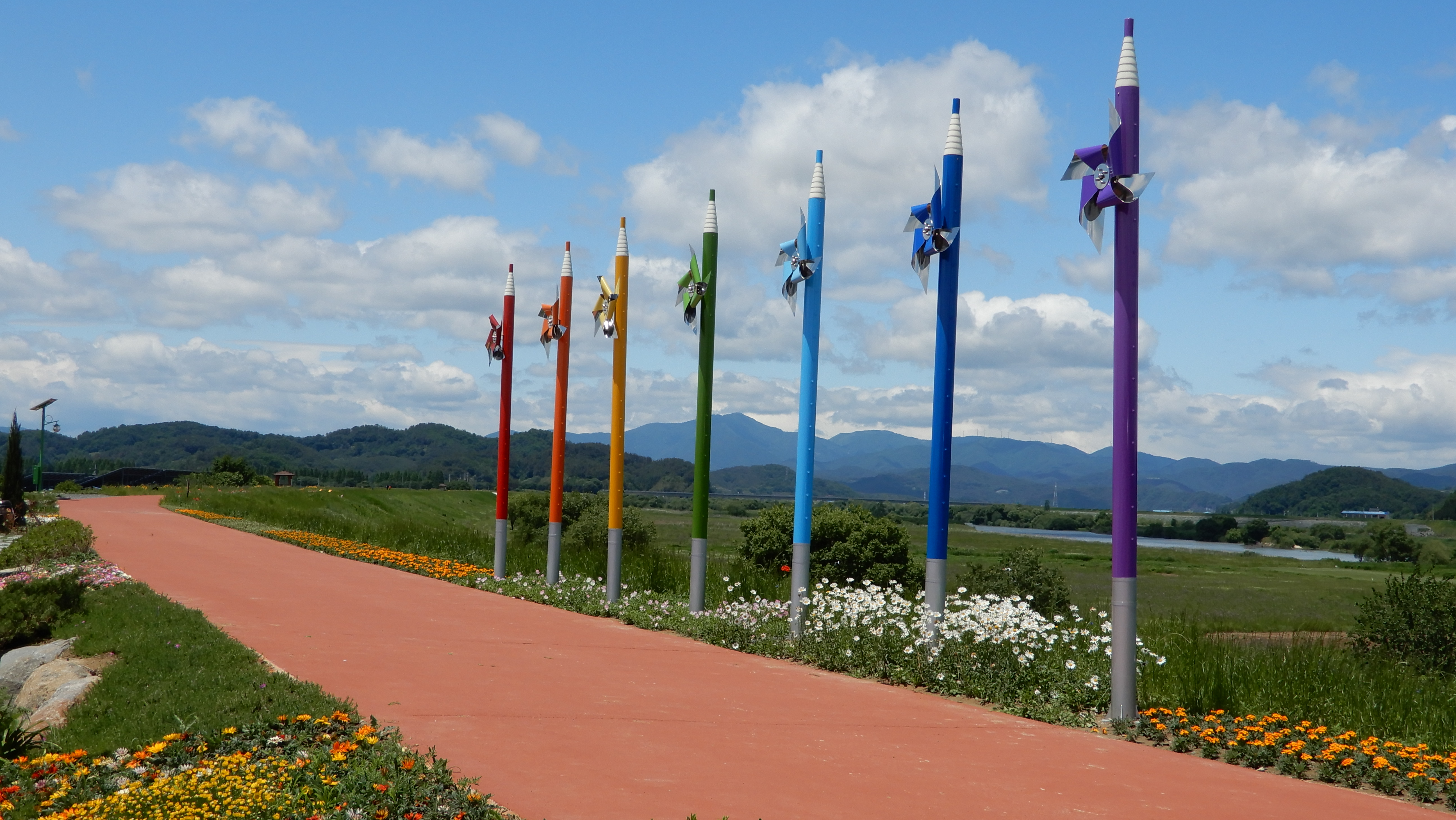 작년까지만 해도 악양둑방은 2.5km 둑방길 양쪽으로 오월에는 양귀비가 구시월에는 코스모스가 유명했다. 둔치에는 밭과 논, 파크골프장과 경비행장이 있었다.