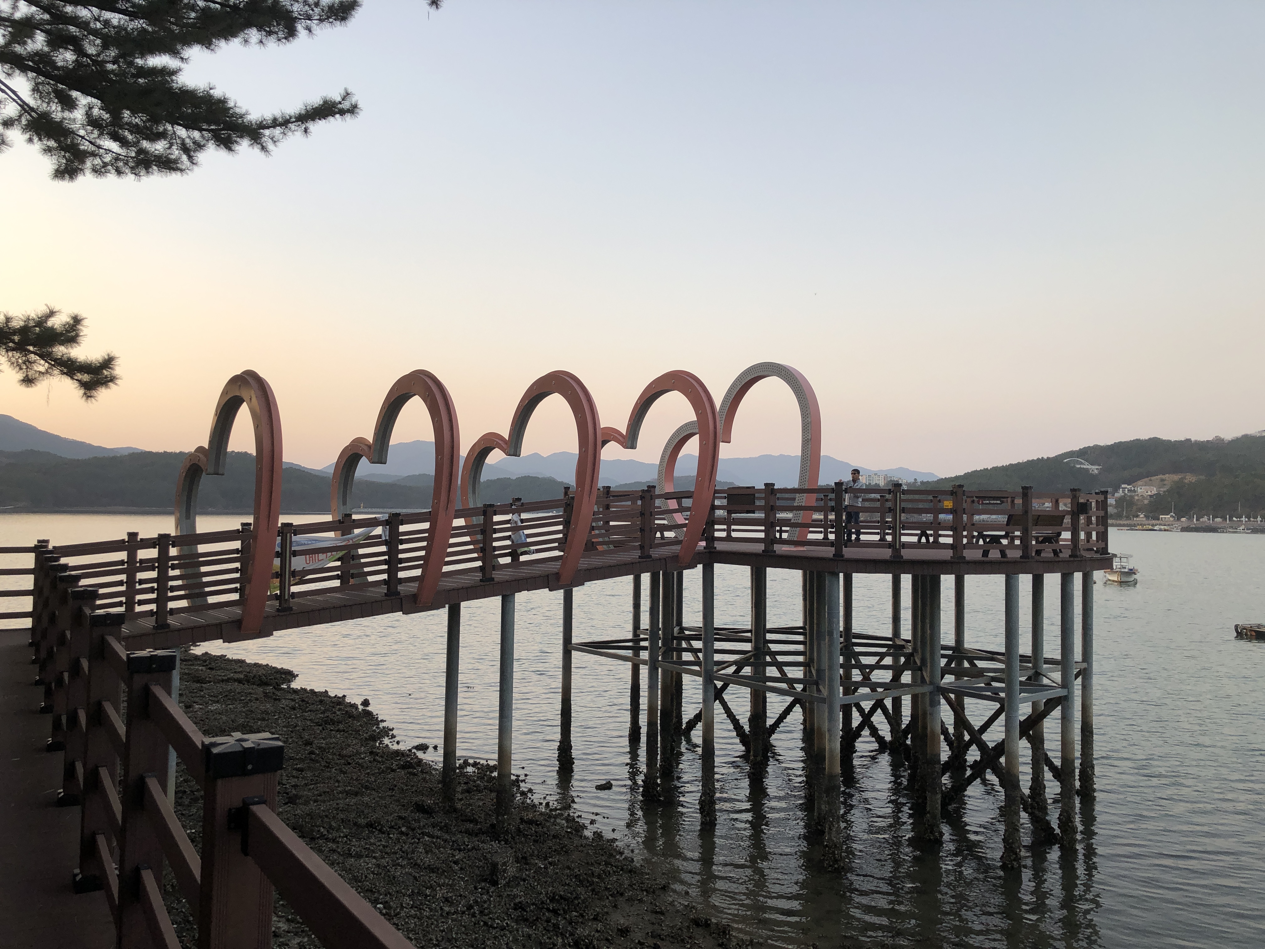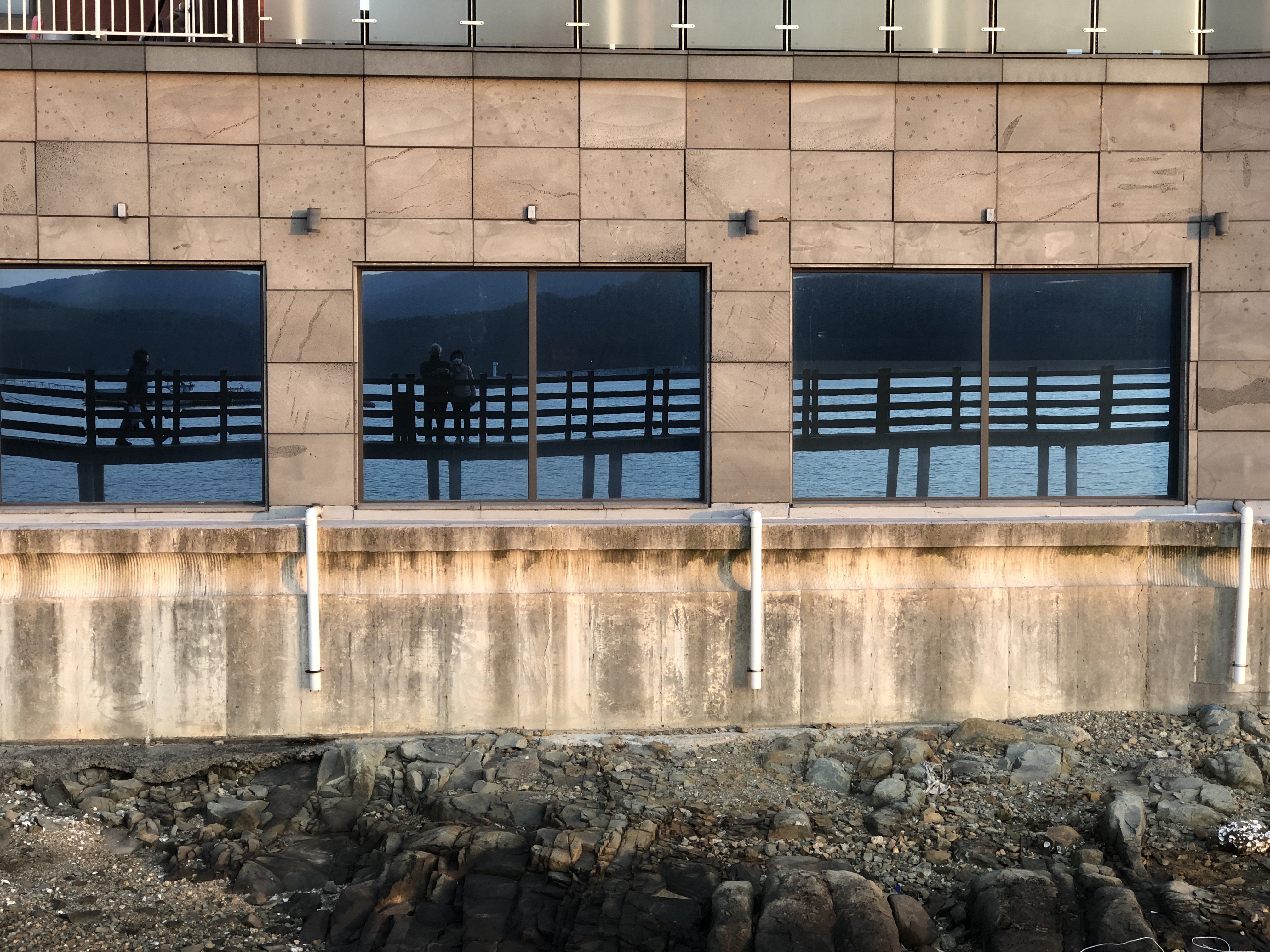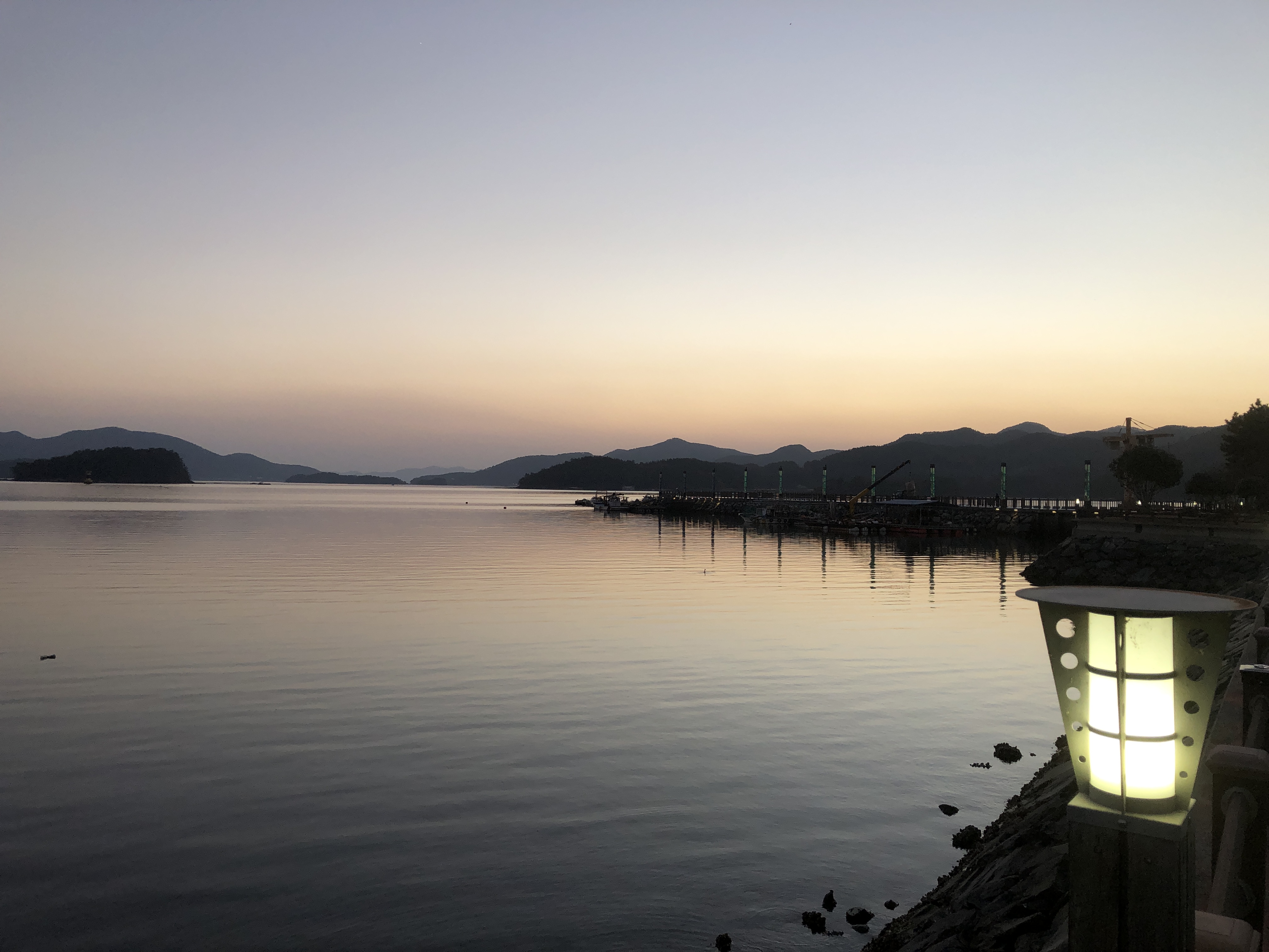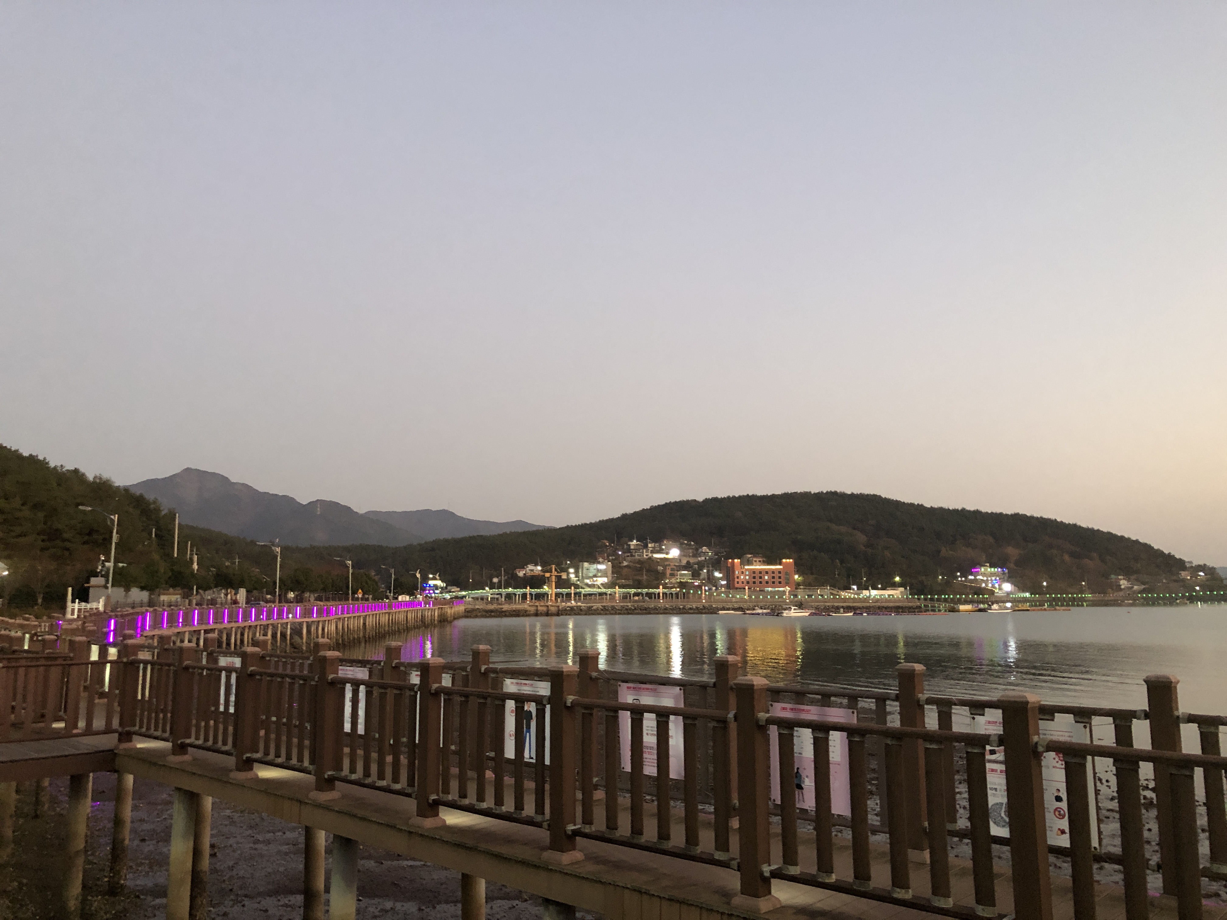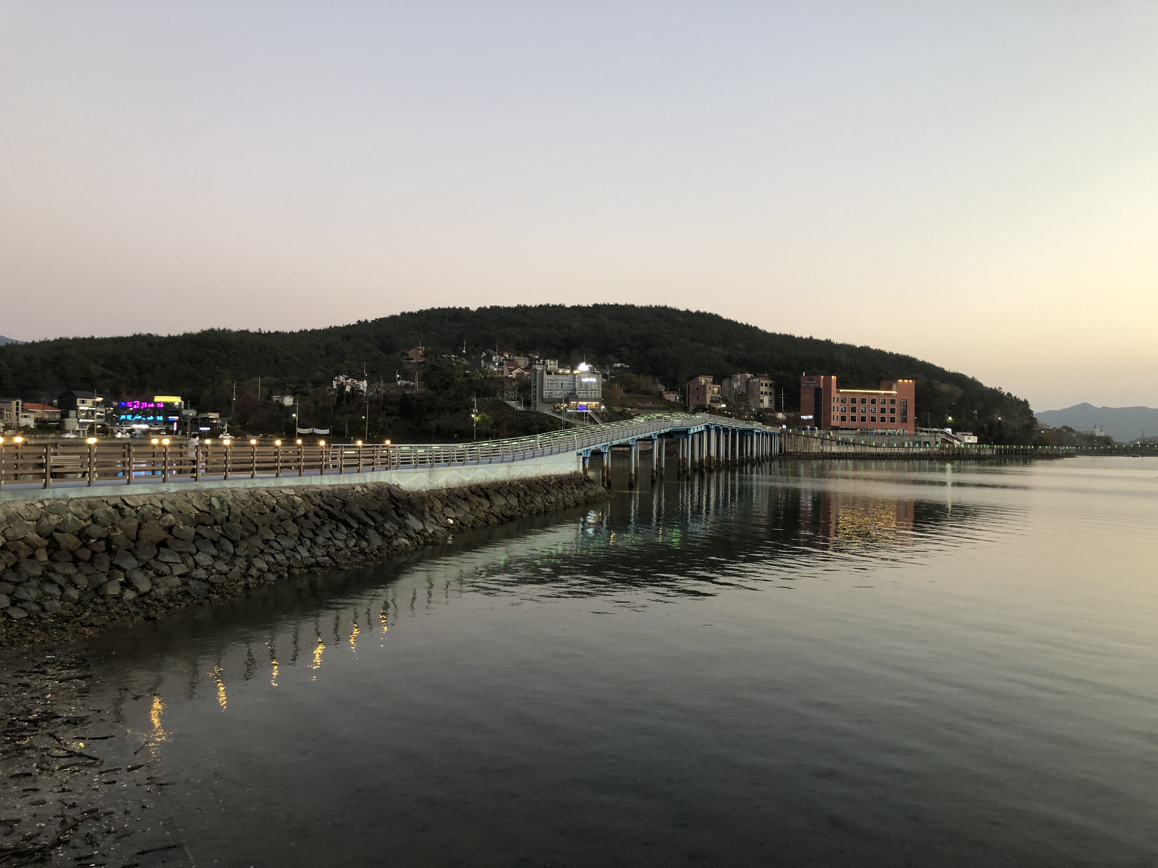 해질 무렵이 되어 서둘러 고성만 해지개 해안둘레길로 갔다. 네비의 정보가 어눌해서 해지개 해안둘레길이 검색이 되질 않아 대신 해지개길을 찾아 갔더니 엉뚱하게 상리 쌍족암으로 가는 길로 안내를 했다. 다시 남포항을 검색해서 갔더니 수협 공판장이 있는 넓다란 매립지가 나왔다. 일단 차를 대고 방파제 쪽으로 걷다가 보니 바다를 가로지르는 다리와 데크길이 보였다.