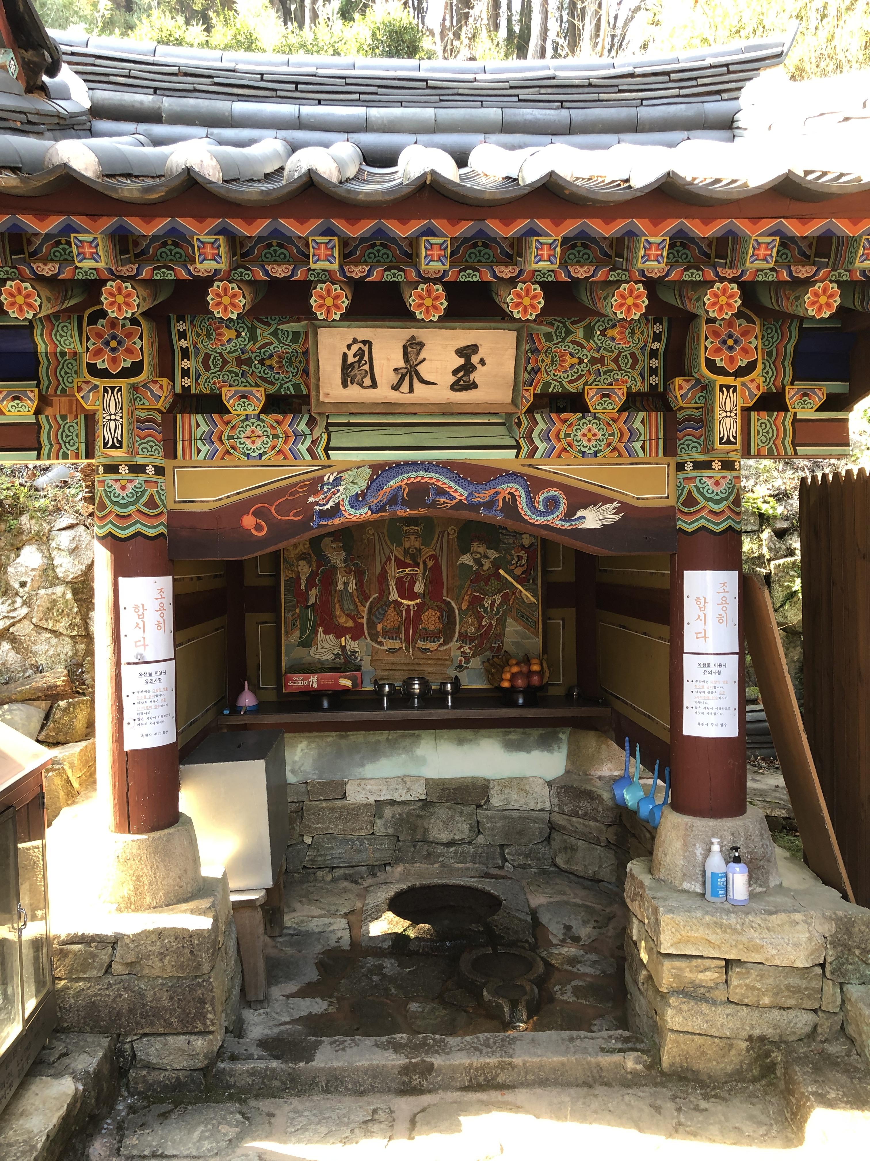 이 절의 이름이 유래된 듯한 샘물. 대웅전과 팔상전 사이에 있는 이 약수는 수질이 다소 변질되어서 조금만 많이 마셔도 설사를 일으키게 되는데, 변비 증세가 있는 사람은 단 한 번의 복용으로 효력을 볼 수 있다고 한다. [출처: 한국민족문화대백과사전(옥천사(玉泉寺)]