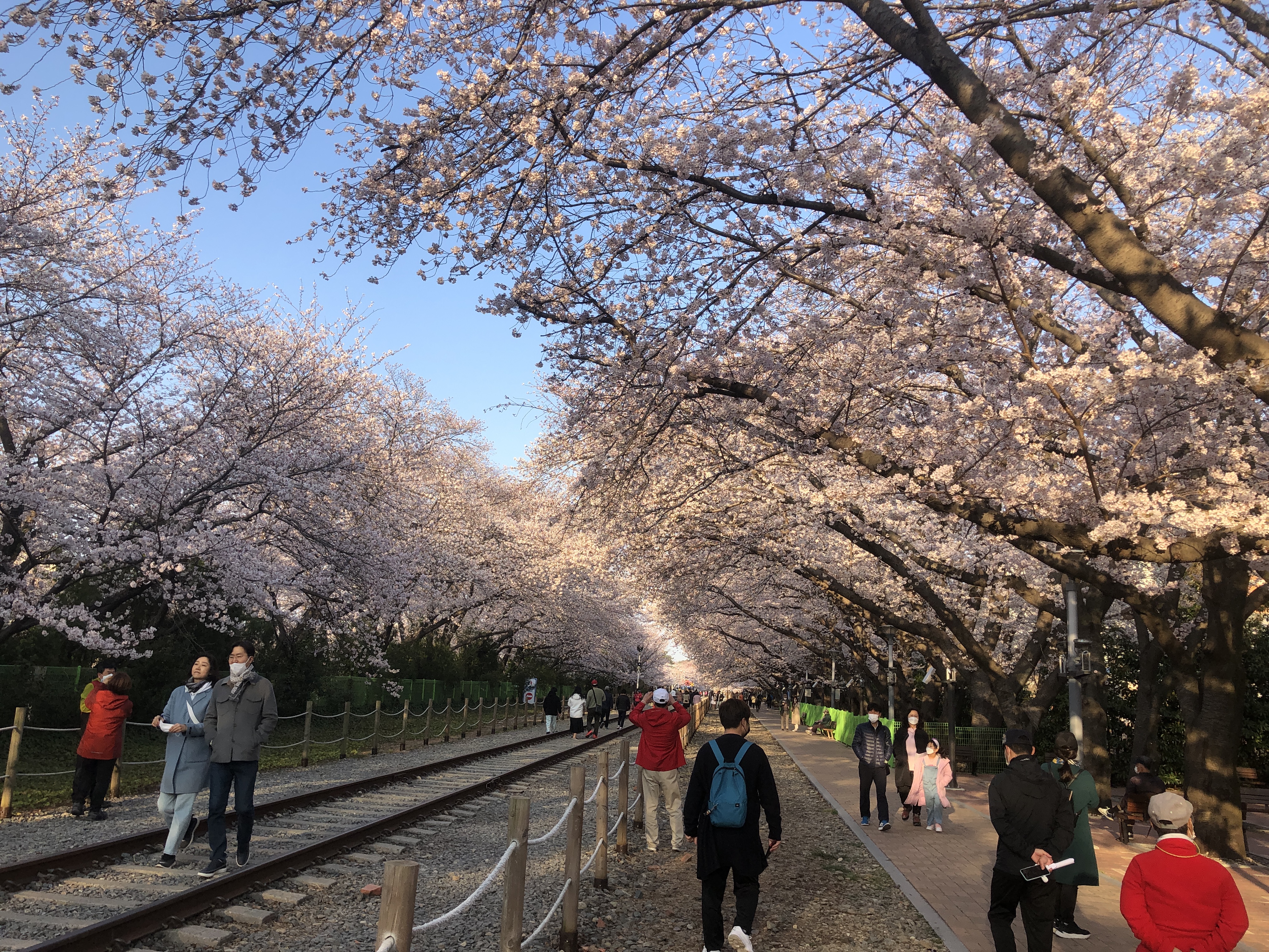 이른 아침, 해뜰녘의 경화역공원벚꽃이 만개하여 철길 위로 벚꽃 터널을 이루면 많은 사람들이 아침부터 북적댄다.
