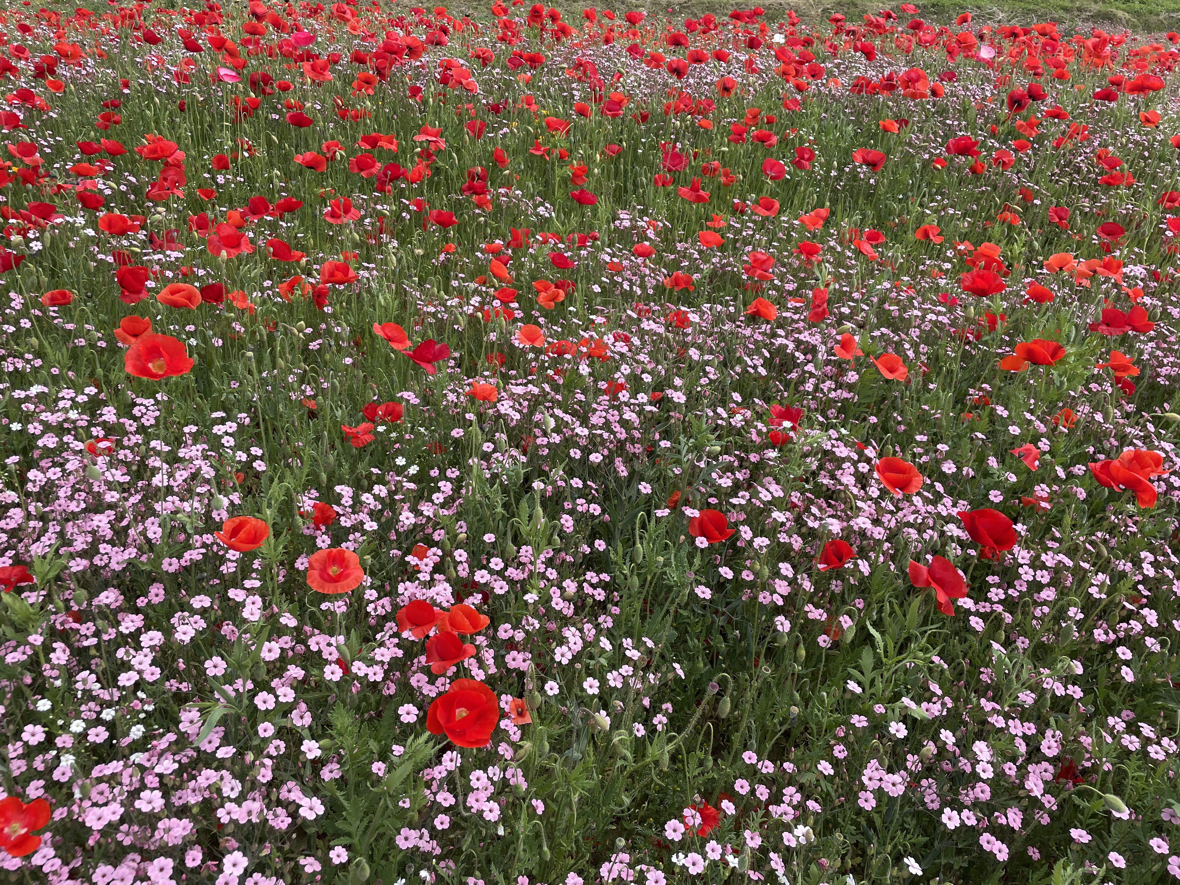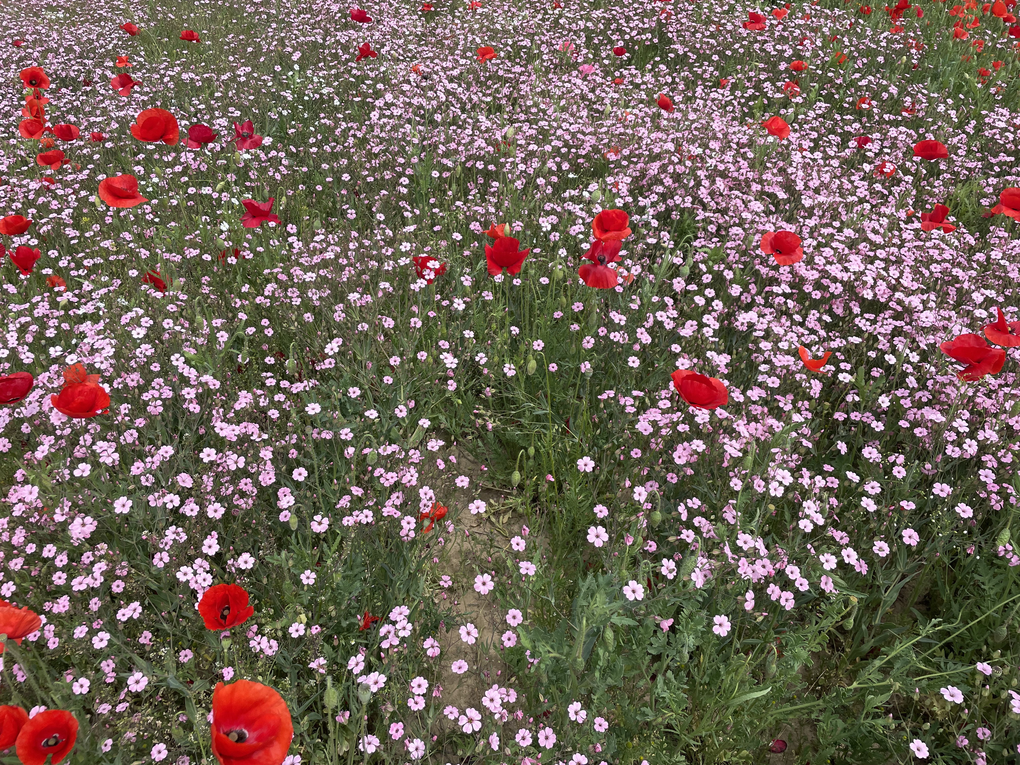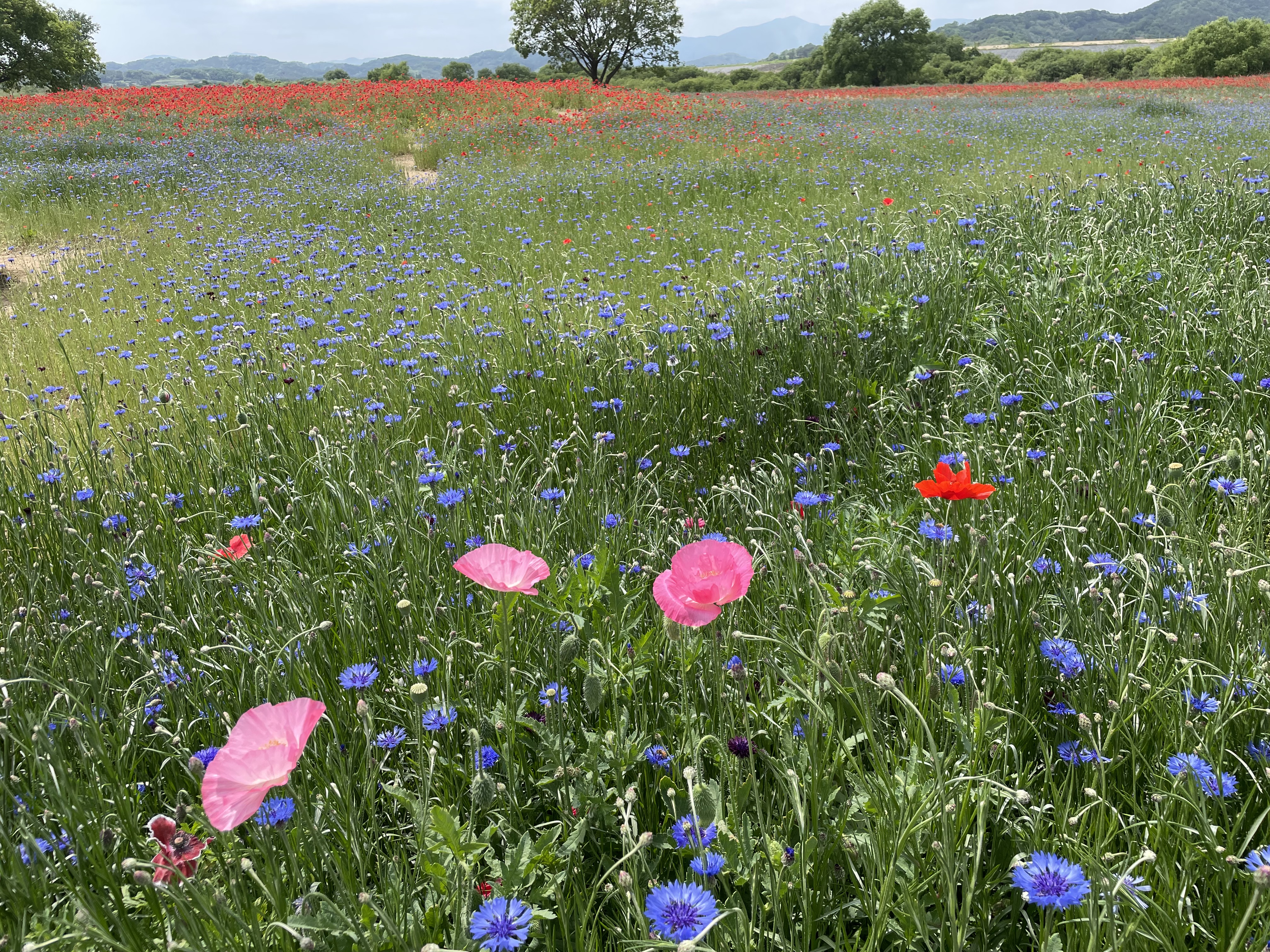 꽃에 목이 마른 아내와 나는 거의 동시에 악양둑방을 떠올렸다. 작년 5월 15일에 큰 처남네와 갔던 기록이 캘린더에 남아 있어 해마다 알려주도록 설정해두었던 터다. 작년은 수레국화가 시들어가고 있어서 아쉬웠다. 그 기억이 되살아나 수목원에서의 아쉬움을 만회하기 위해 악양둑방으로 내달았다.