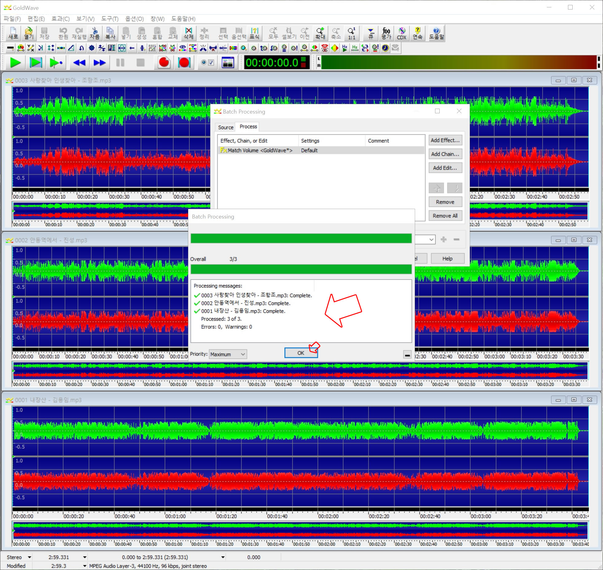골드웨이브를 이용하여 여러 개의 파일을 볼러와서 들쭉날쭉한 볼륨을 일관성있게 한꺼번에 조절해보자.