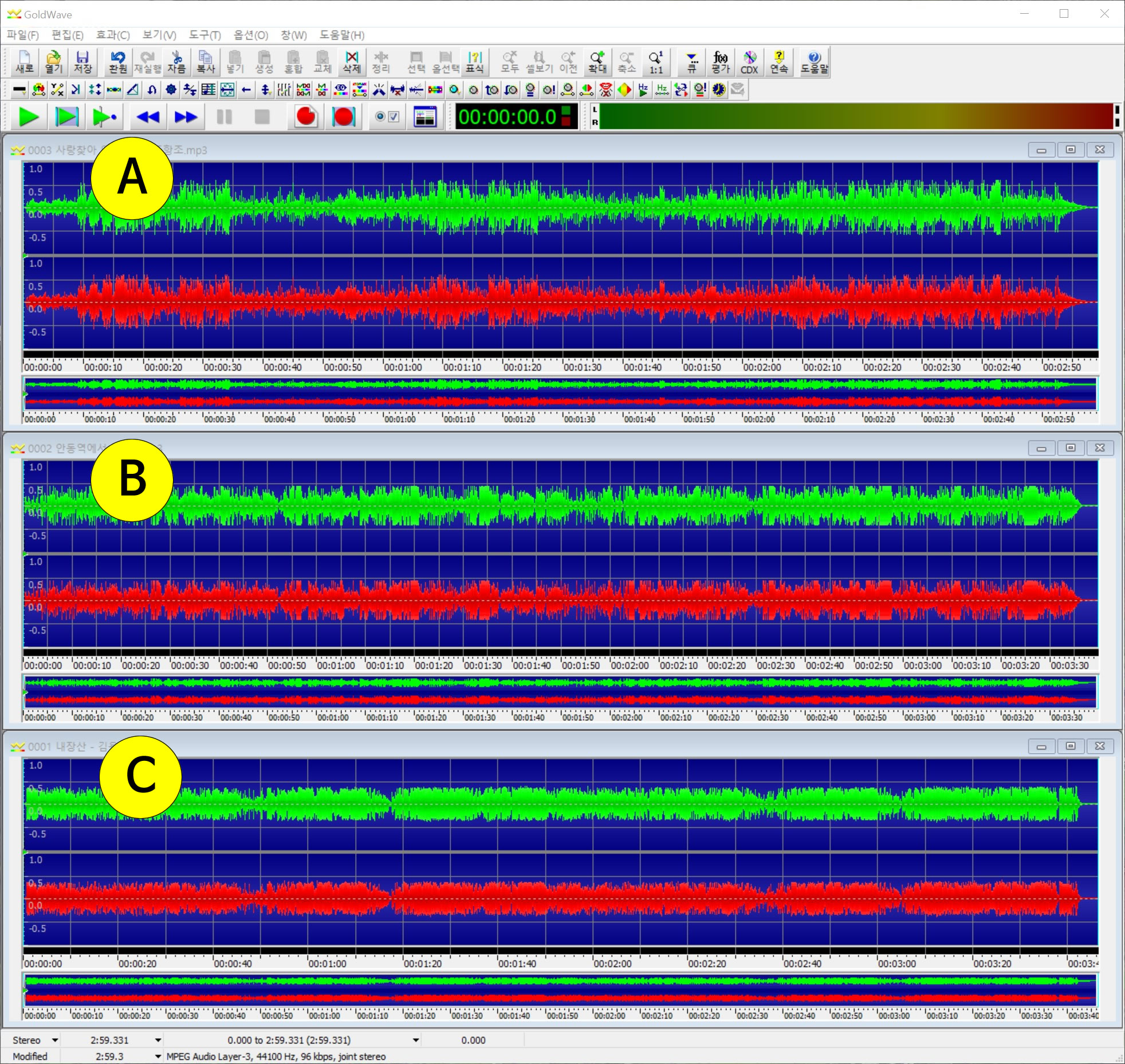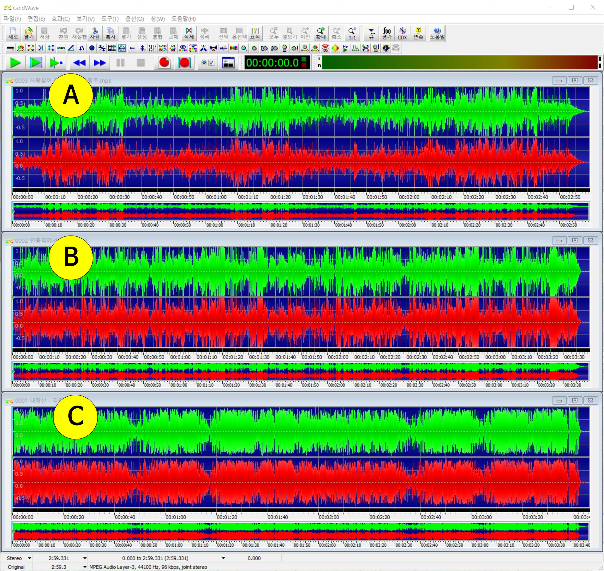 다음 그림은 세 개의 파일을 무작위로 불러본 것이다. A, B, C 세 개의 파일은 그림에서 보이듯이 파형의 모양이 다르다. A가 가장 무난한 모양이며, C는 과하게 높은 볼륨으로 녹음이 되었으며, B 역시 과하게 높은 볼륨이다.