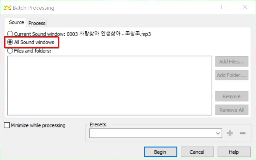 3) [Source]탭에서 [All Sound windows]를 선택하면 현재 화면에 불러놓은 파일을 대상으로 작업을 진행하게 된다.