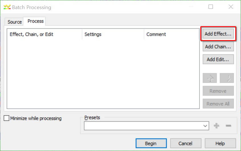 4) [Process] 탭을 누르고 오른쪽에 있는 [Add Effect] 버튼을 클릭한다.