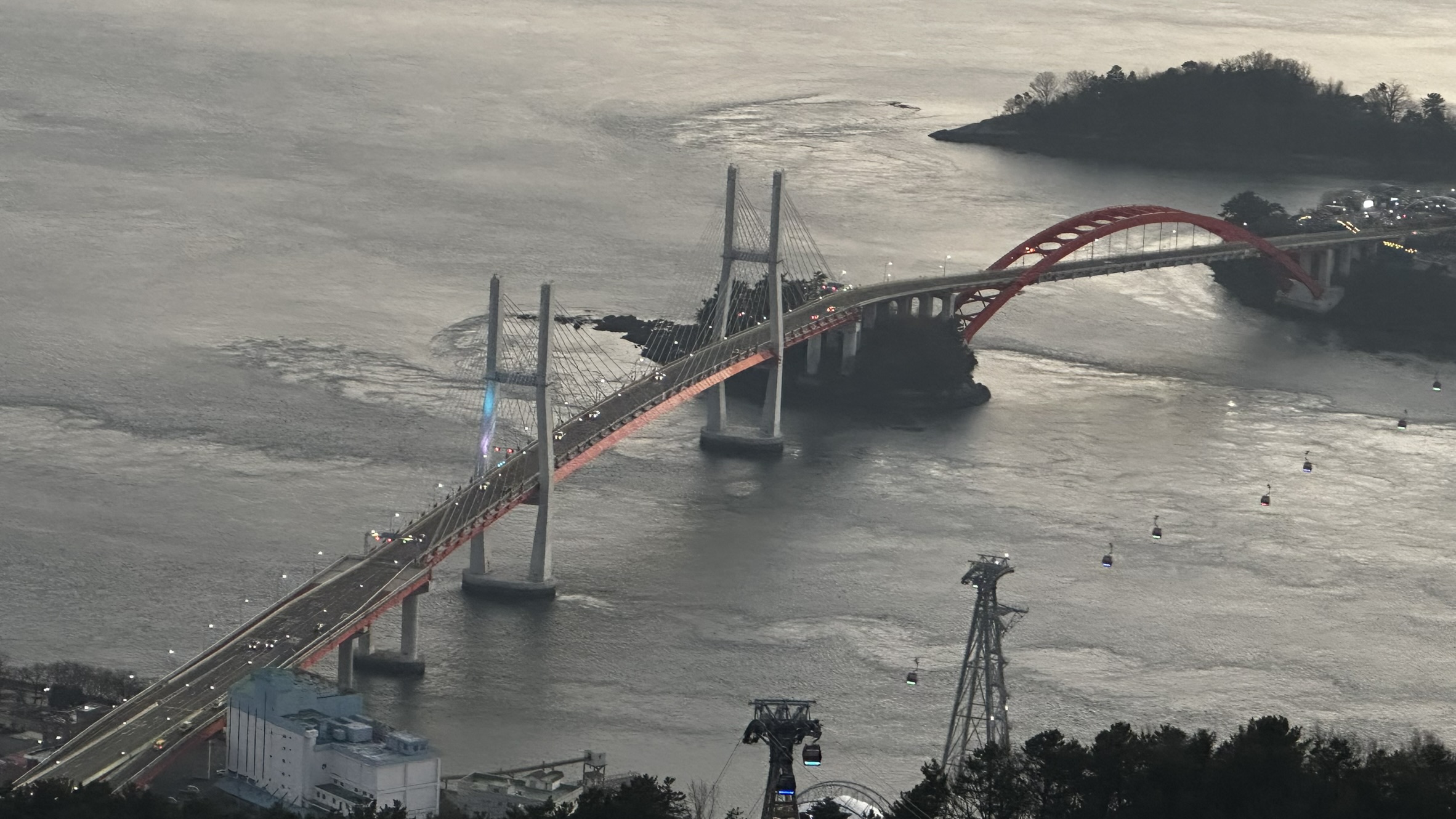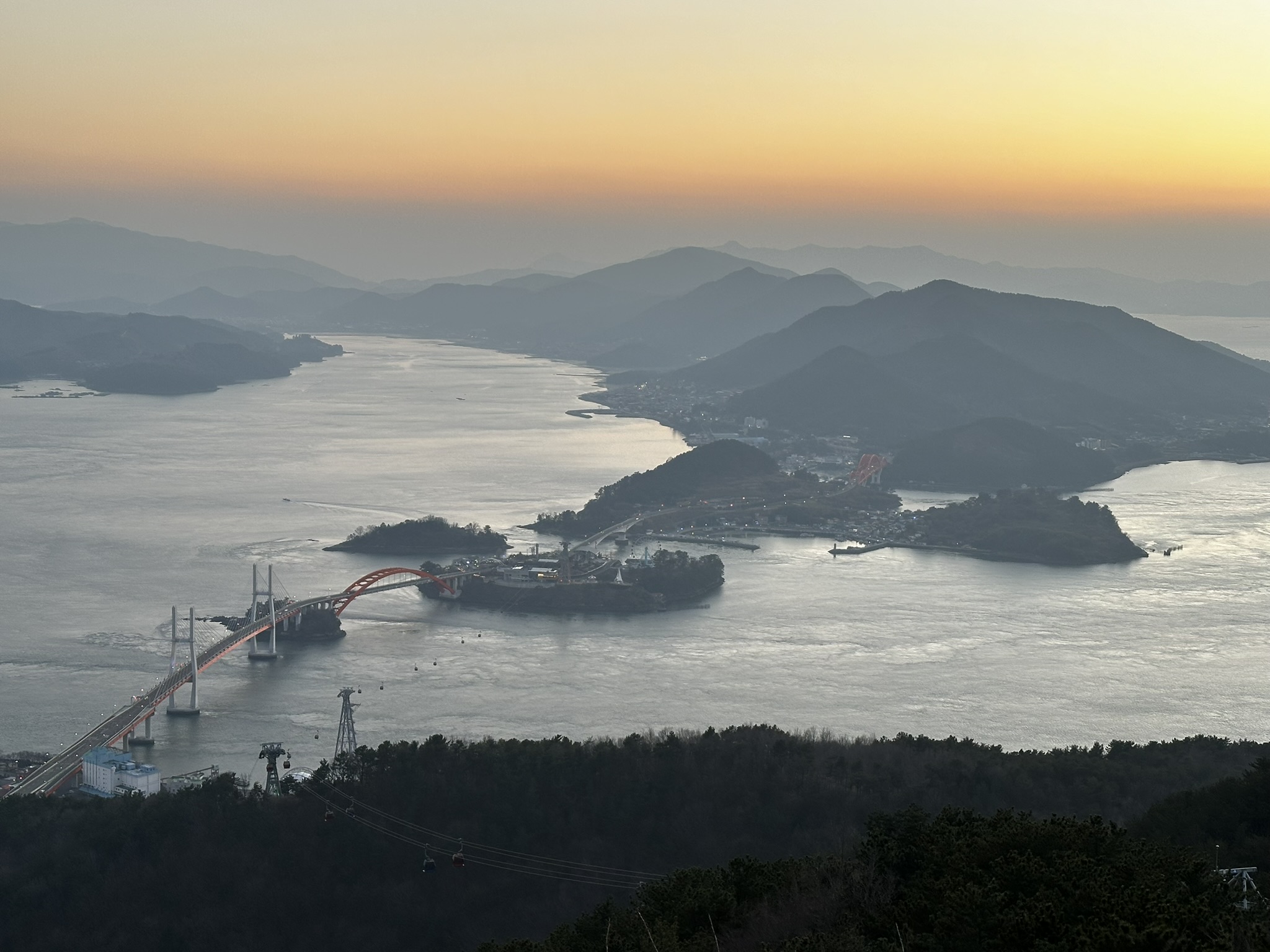 노을이 어둠 속으로 사라지면 삼천포대교에 조명이 들어온다. 다리를 건너는 차들과 바다 위를 오가는 케이블카의 빛이 또다른 절경을 만들어낸다.
