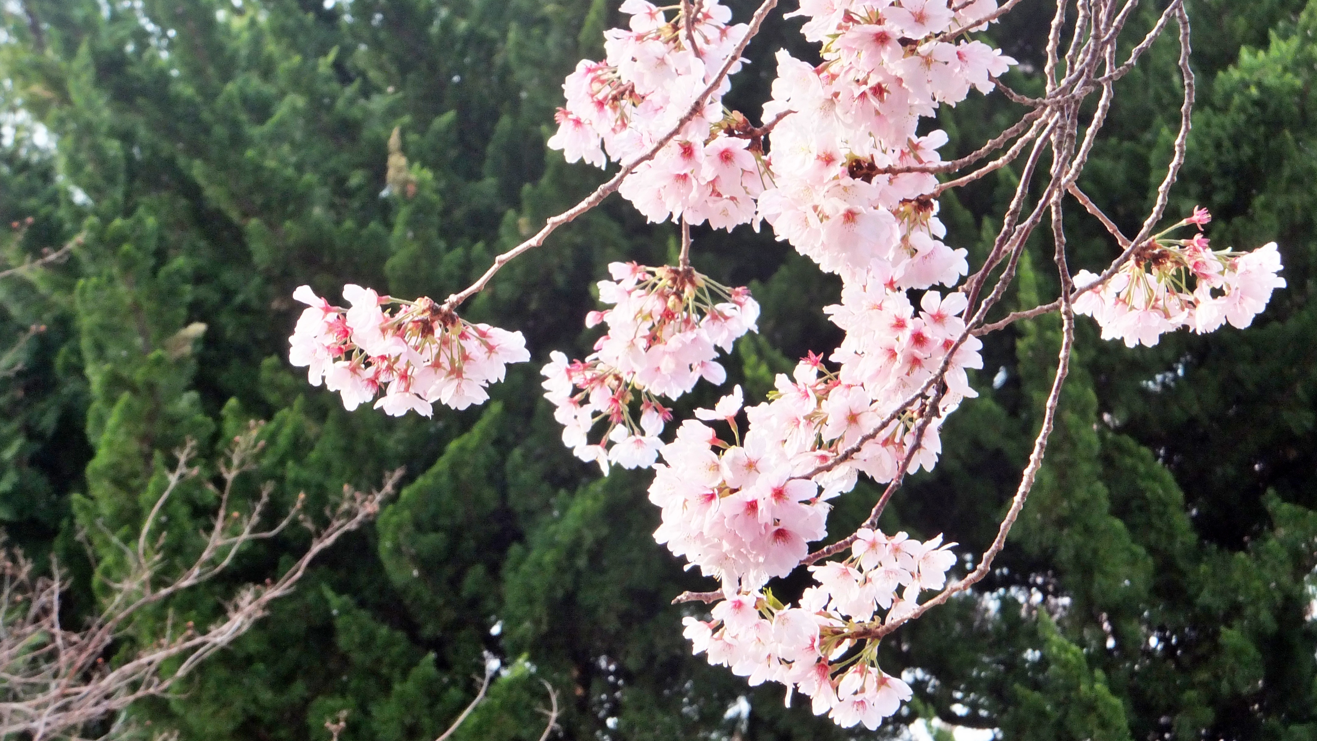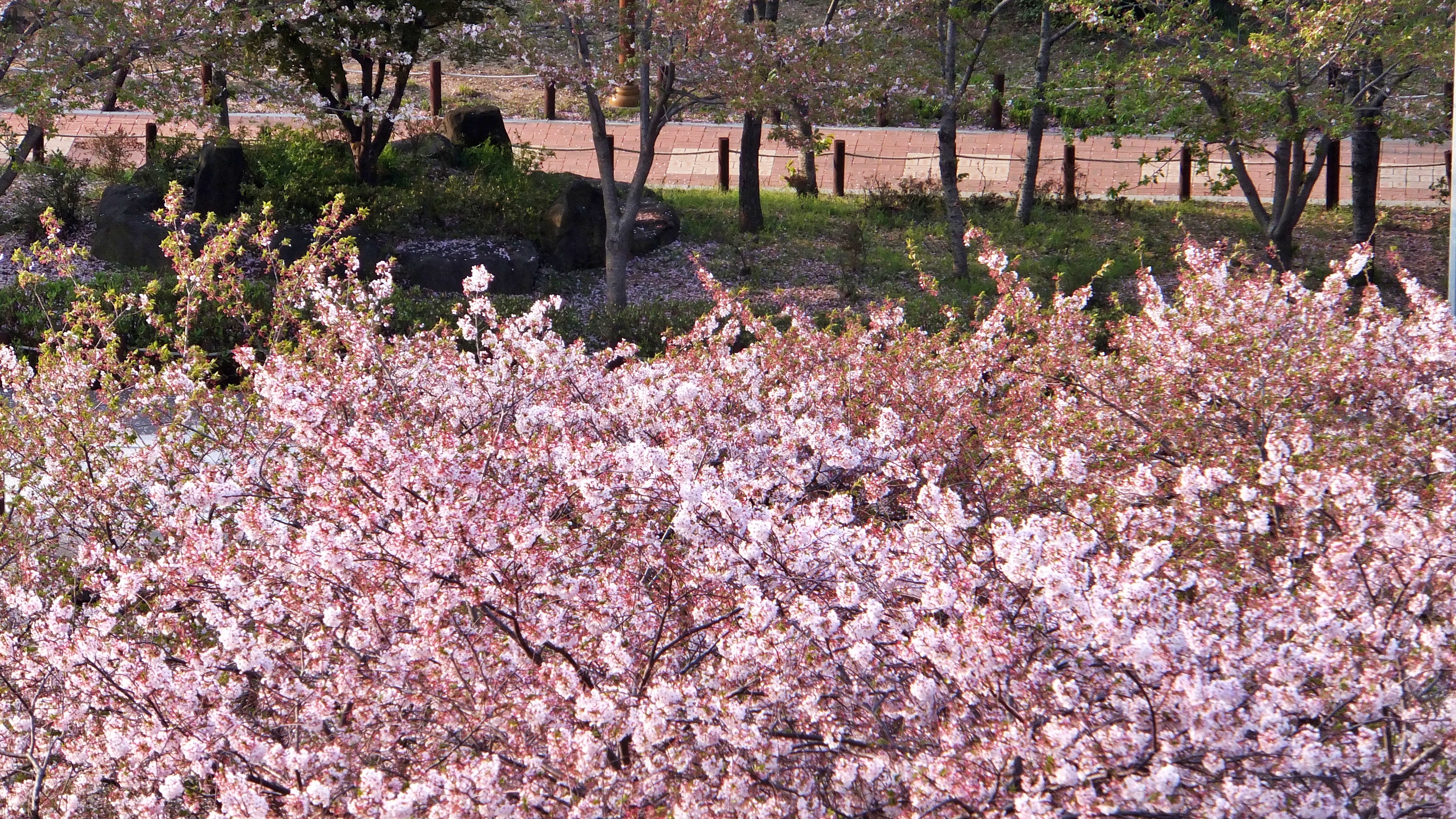 4월 9일, 꽃은 분홍색으로, 새순이 꽃의 세력을 꺾어가고 있다.