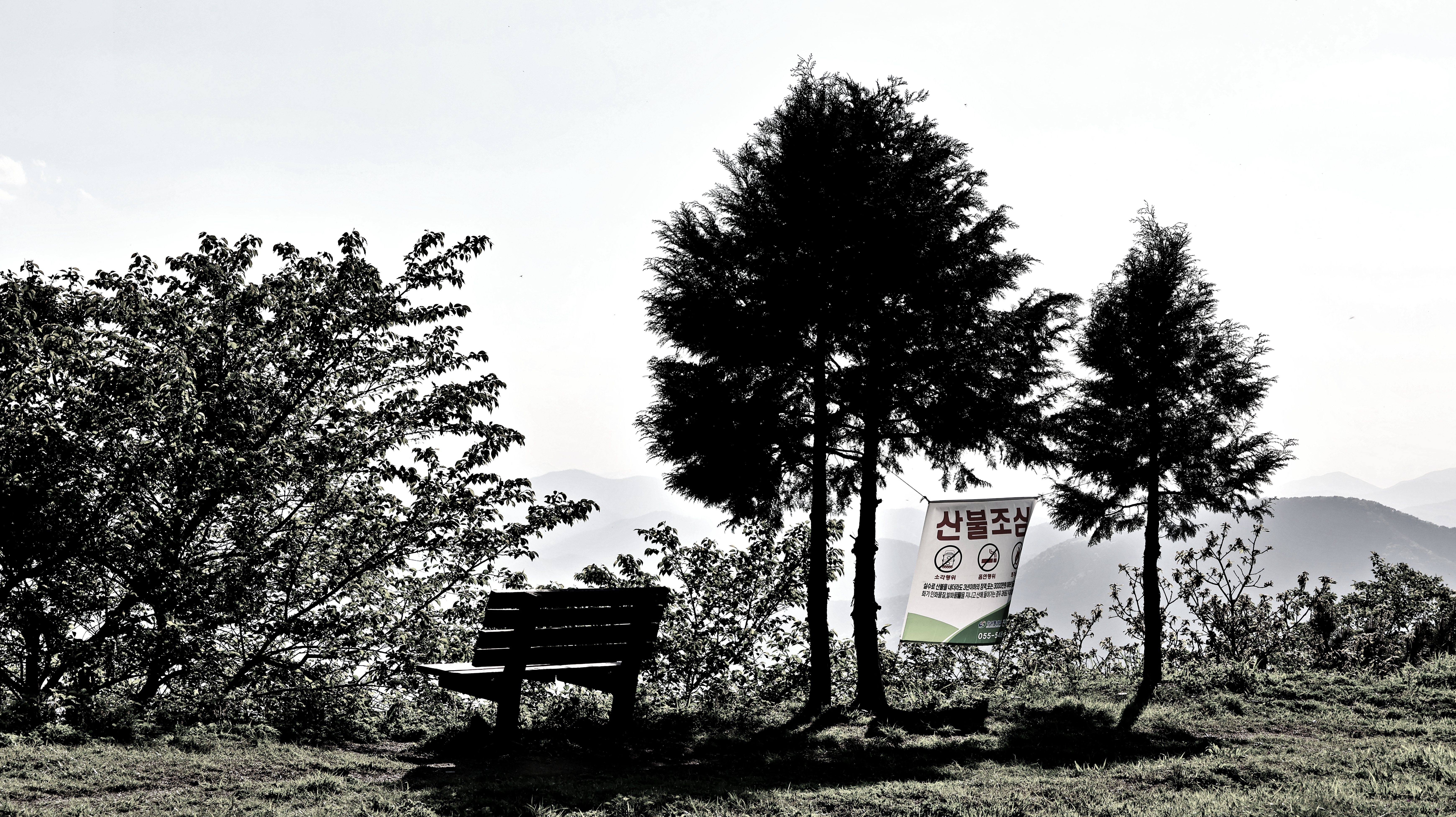 휴식을 위한 의자와 산불조심 현수막. 아무렴 조심해야지. 설마 여기서 쉬면서 담배 피우는 사람이 있을라고?