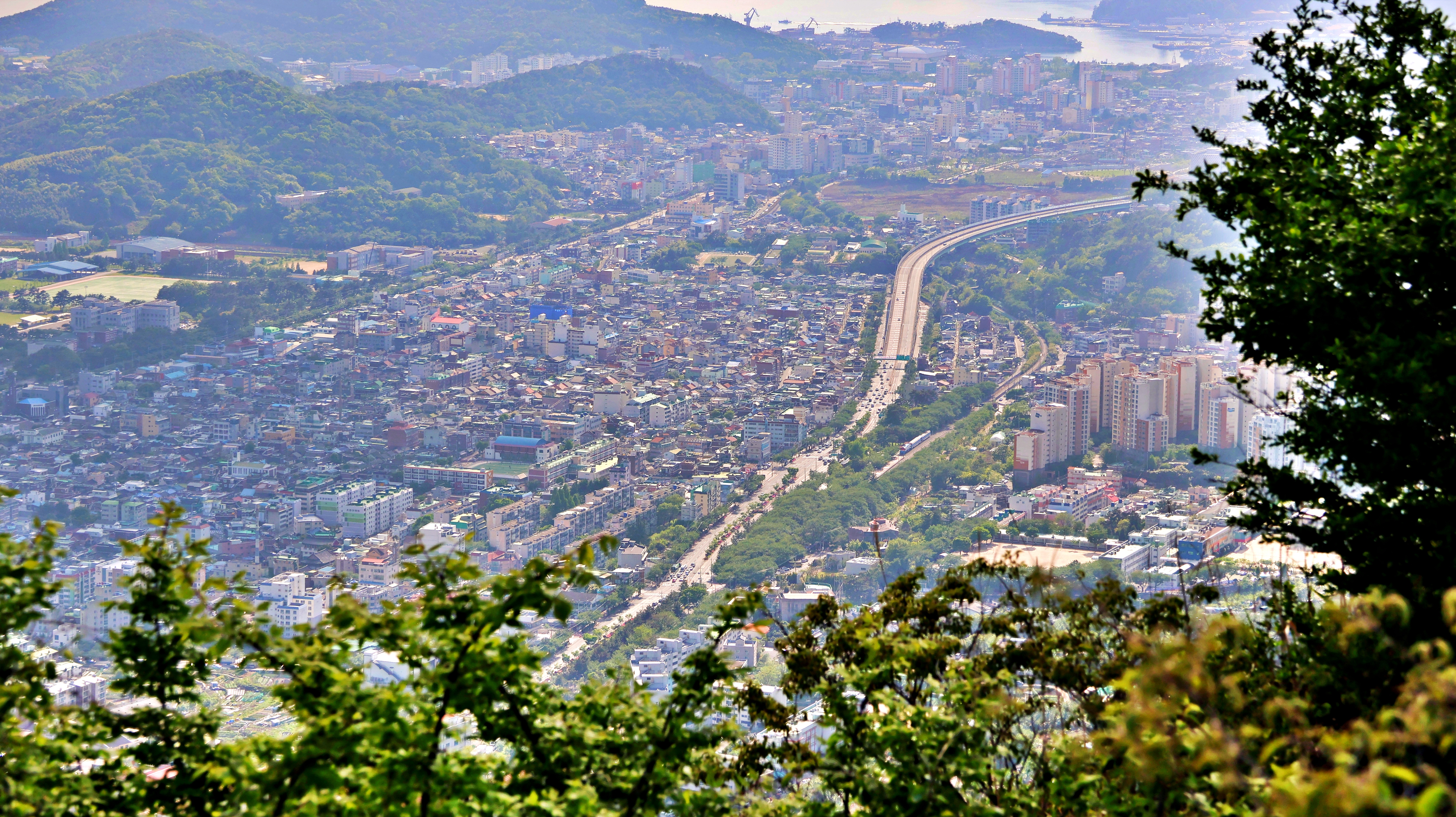 왼쪽 끝자락의 아파트 단지가 있는 곳이 생긴 지 얼마 안된 동네 자은동, 붉은 아파트들이 있는 곳은 석동, 그 너머로 진해구청과 풍호동, 가운데 쪽은 한산대와 진해항, 그 오른쪽으로 경화동, 시가지를 관통하는 도로가 국도 2호선, 그 끝이 진해 구 시가지, 오른쪽 산 자락 아래로 새로 난 국도 2호선 우회도로, 맨 오른쪽의 우뚝한 봉우리가 덕주봉과 장복산이다.