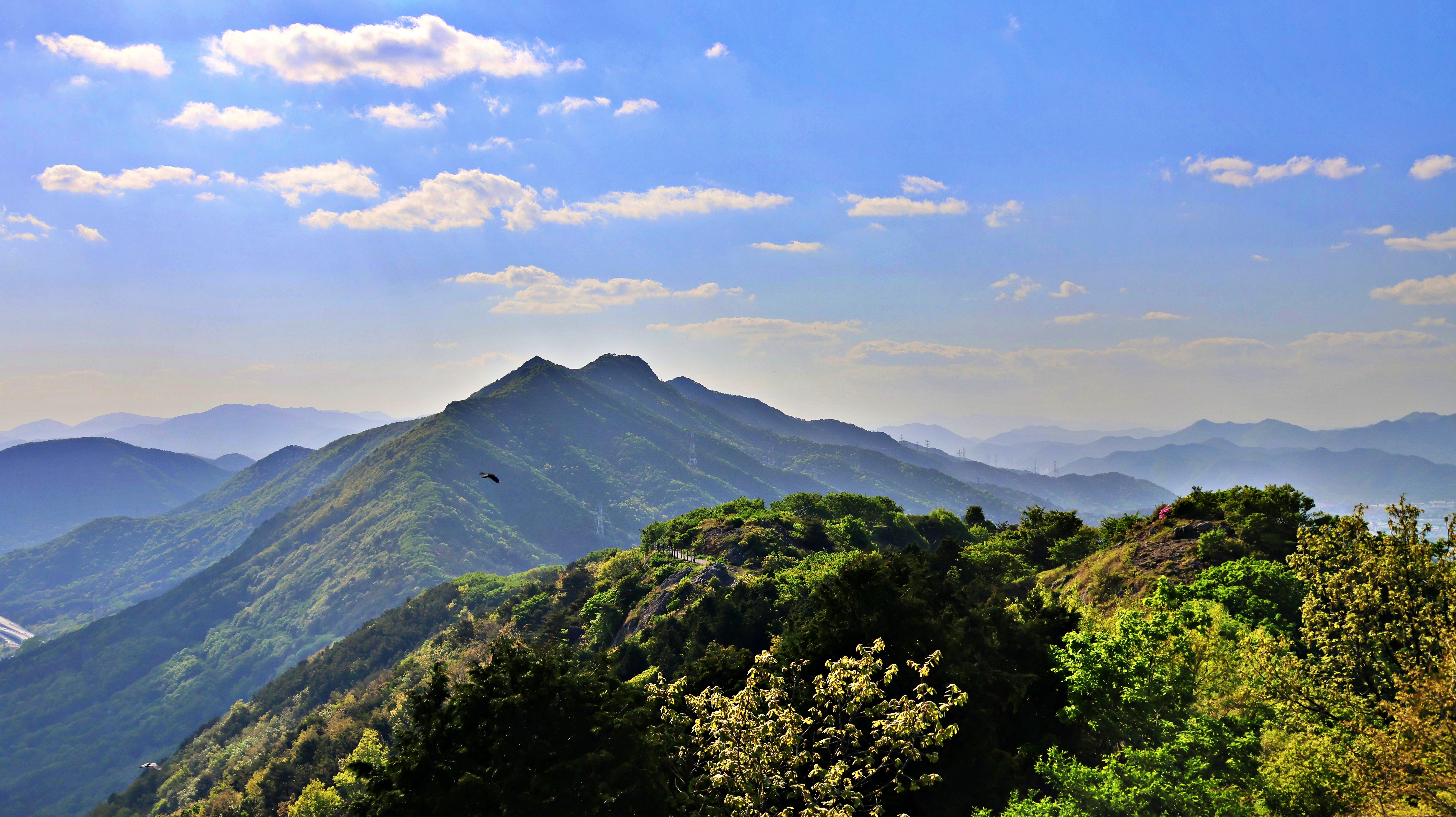 덕주봉과 장복산. 왼쪽 진해 방면은 다림질을 한 듯, 오른쪽 창원 쪽은 주름을 잘 접어놓은 모양이다.
