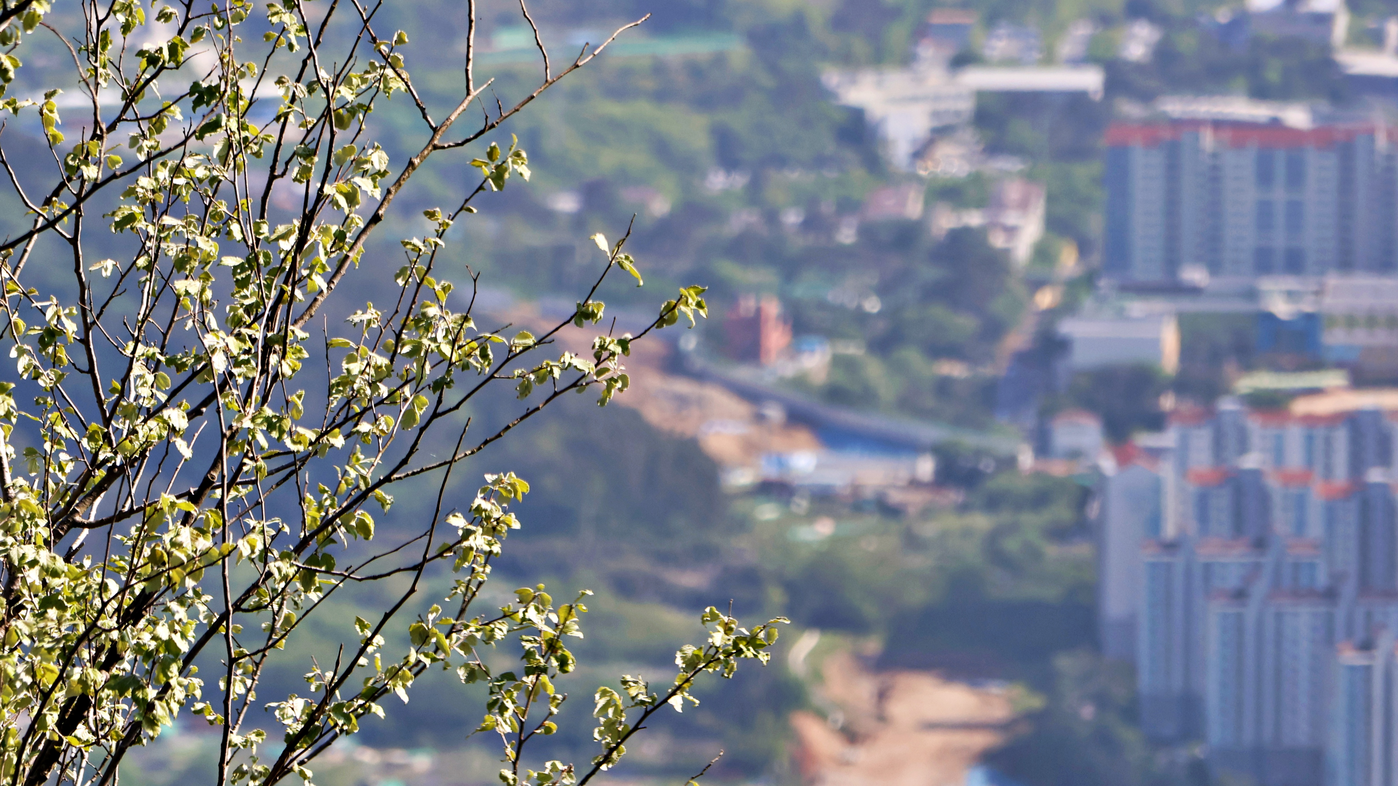 자은동 아파트 밀집지역 근경으로 편백이 숲을 이루고 있다. 자연의 숲과 인간의 숲이 대조적이다.