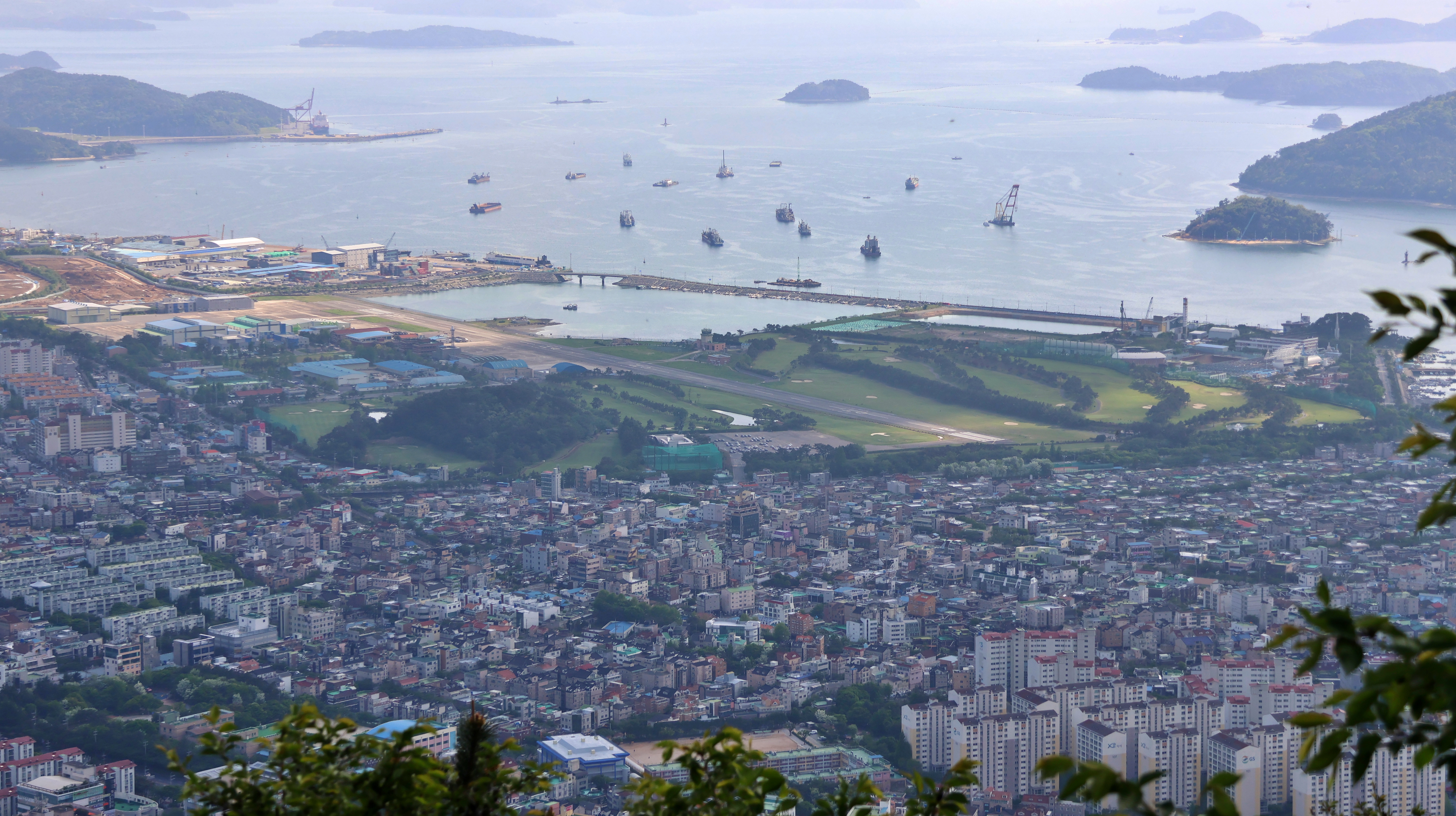 해군체력단련장 한산대와 진해항이 보인다. 낮은 주택들이 밀집해 있는 곳이 이동, 아파트가 밀집해 있는 곳은 석동이다.