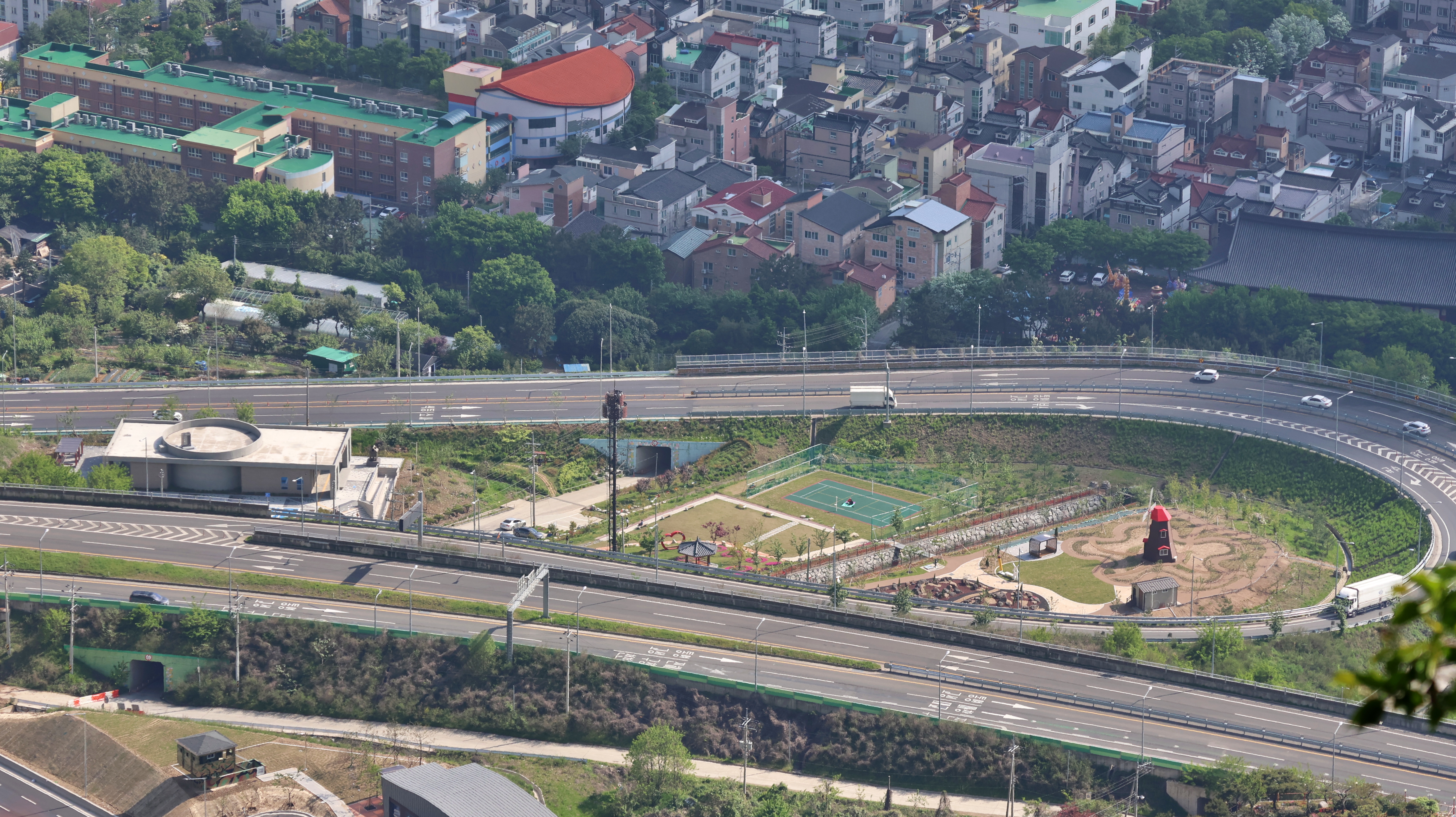 지난 3월 말 개통된 진해와 창원을 이어주는 제2 안민터널(정식 명칭은 석동터널) 앞 나들목이다. 복잡한 차로의 가운데에는 작은 공원과 체육 시설이 만들어져 있고, 가운데 큰 냄비같은 것을 품고 있는 건물은 이 곳을 건설할 당시 출토된 유물을 보관, 전시하고 있다.