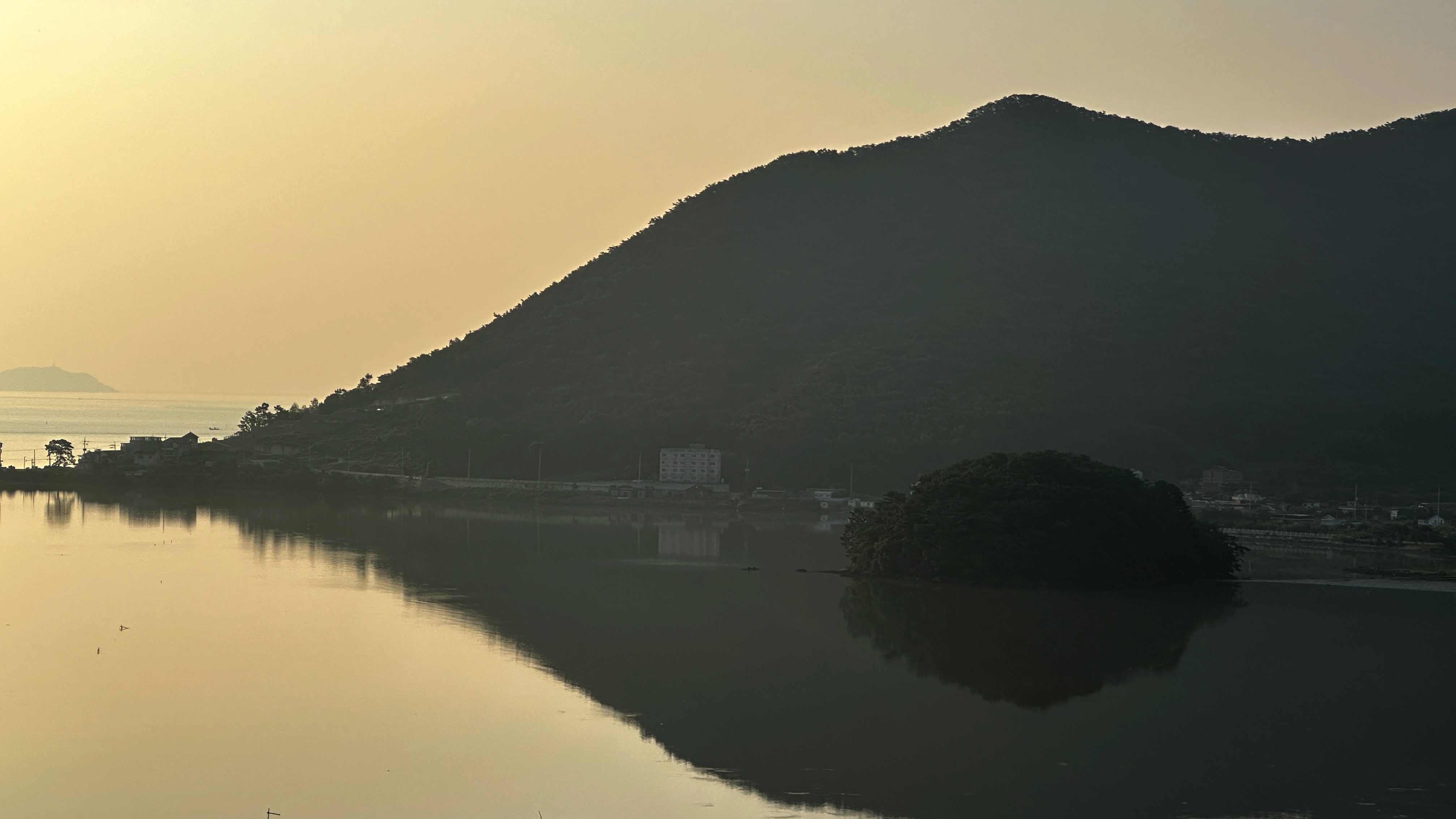 동선 교차로를 거쳐 거제와 연결되는 국도에 오르자마자 동선과 눌차도가 한눈에 조망된다. 왼쪽이 눌차도이고, 오른쪽 산자락 끝이 동선이다. 동선방조제가 둘을 이어주고 있다.