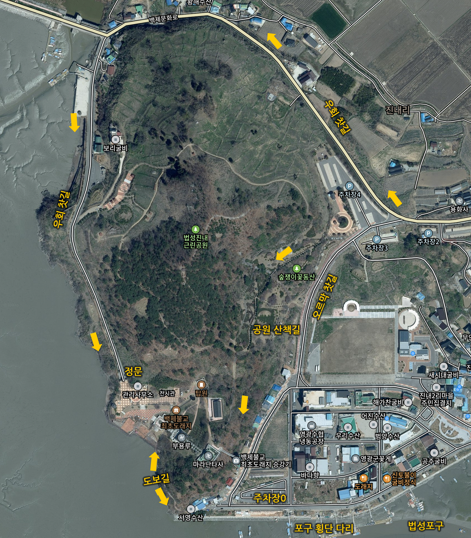 '법성숲쟁이꽃동산'이라고 소개된 소공원이 있어서 가봤더니 꽃이 없다. 그러데 올려다보니 산꼭대기 불상이 우뚝 솟아있다. 그 앞에는 그곳으로 오르는 승강기가 큰 규모로 서 있고. 그곳이 바로 '백제불교 최초 도래지'였다. 승강기는 잠겨 있고, 10층 높이쯤 되는 가파른 길을 오를 것을 생각하니 오늘의 남은 여정이 걱정이 되어 지나가는 우선 주차장을 찾았다. 주차장4(그림 참조)에 차를 대고 두리번거리면 길을 찾아봐도 오르막길만 보여서 마침 지나가던 동네분에게 찻길을 여쭈었더니 아주 친절하게 답을 주셨다. 야산을 돌아서 정문 쪽으로 갔다. 그곳에는 주차장이 없었다.