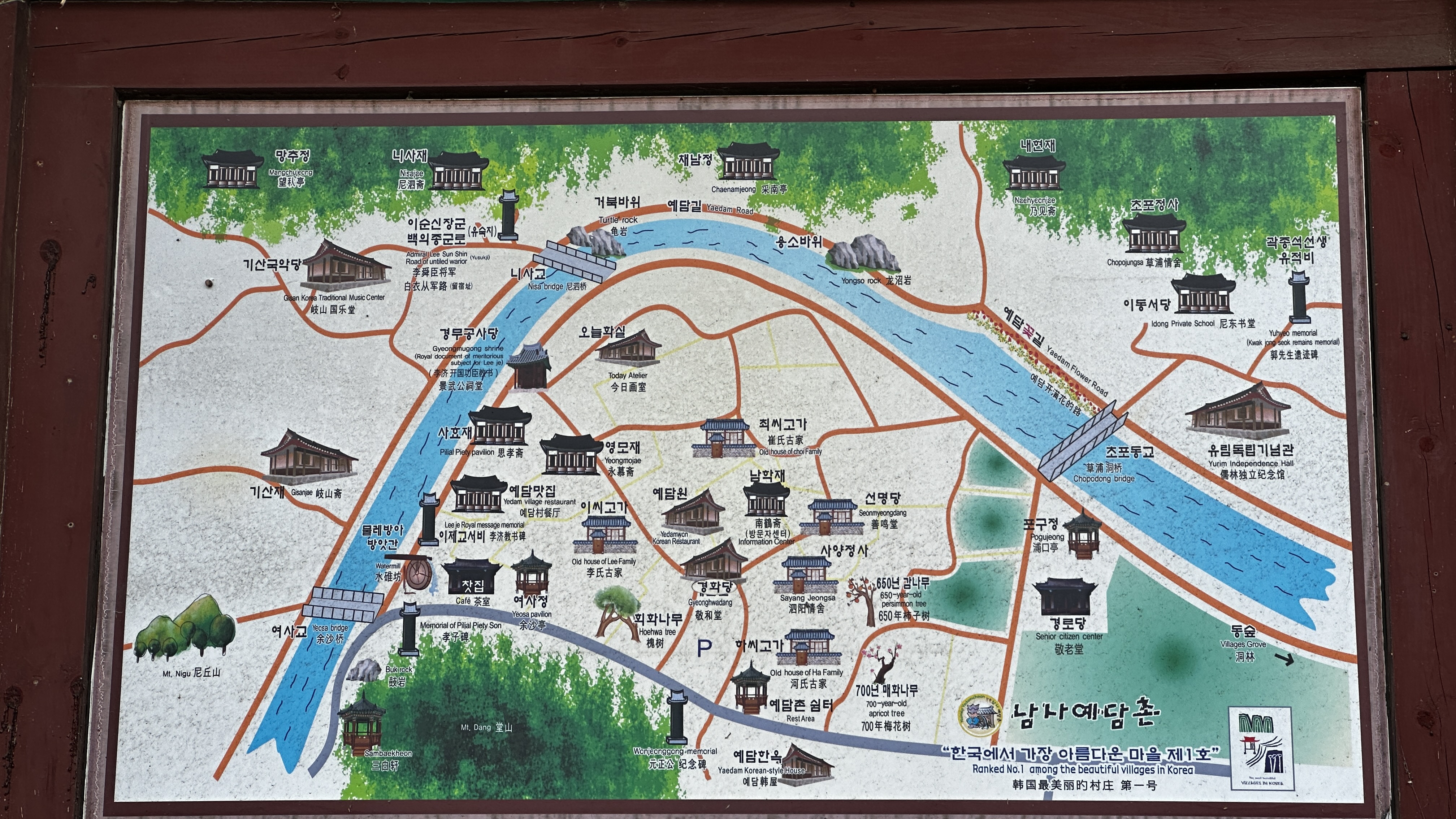남사천이 휘돌아 나가는 산중의 편평한 옥토에 몇몇 성씨들이 모여서 저마다 가문의 기와 지와 예를 뽐내며 선의의 경쟁을 하면서 살았고, 지금도 살고 있는 마을. 대한민국 아름다운 마을 제1호로 선정된 고풍스럽고 구석구석이 예쁜 마을이다.
