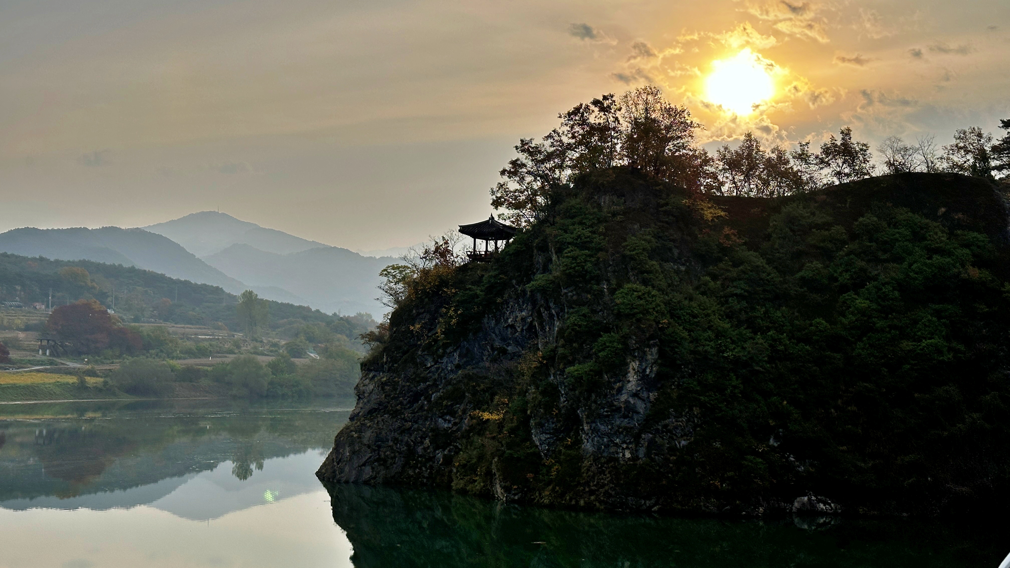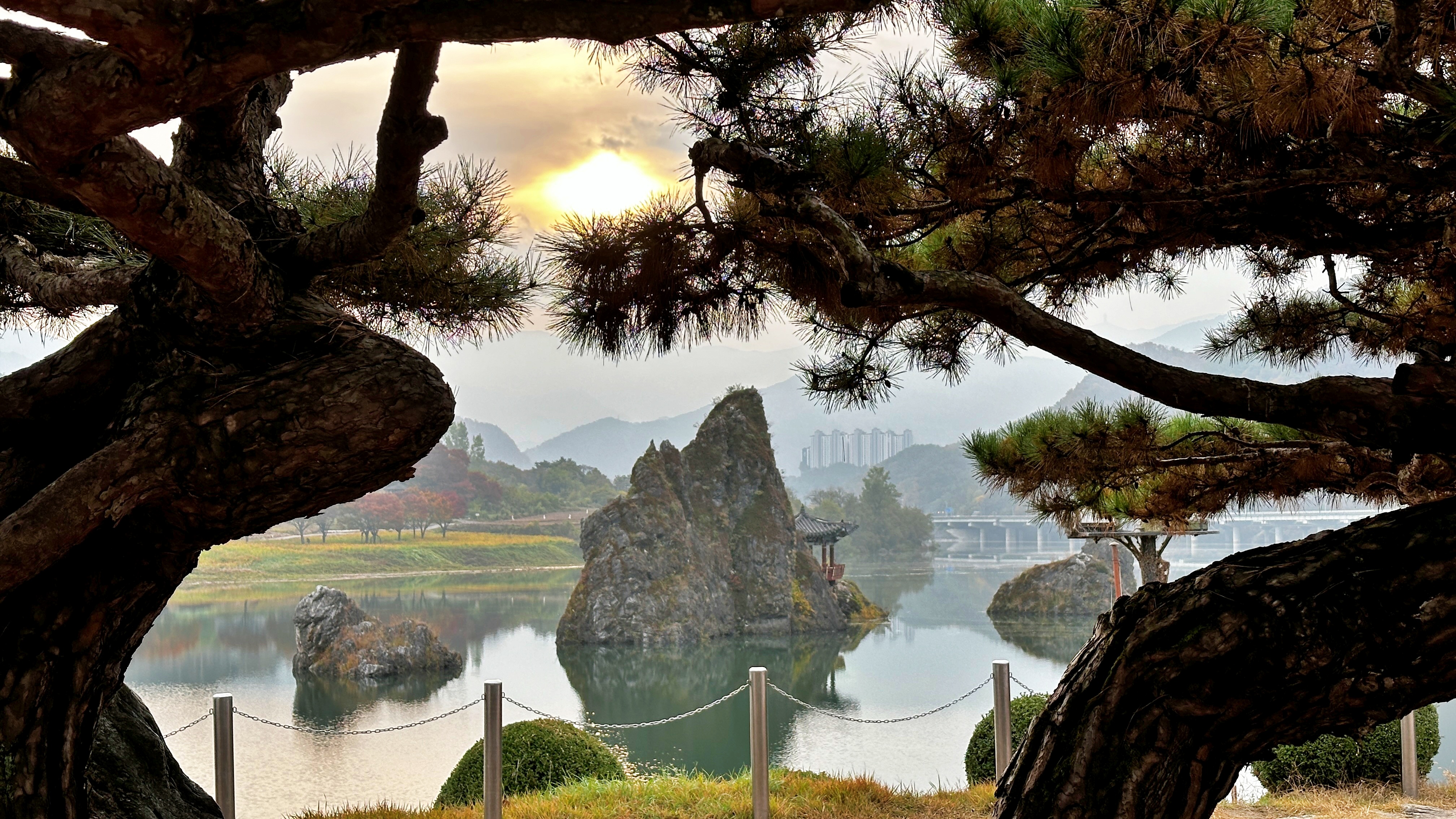 다시 도담삼봉. 잘 생긴 소나무 사이로 중천에 뜬 해가 보인다.