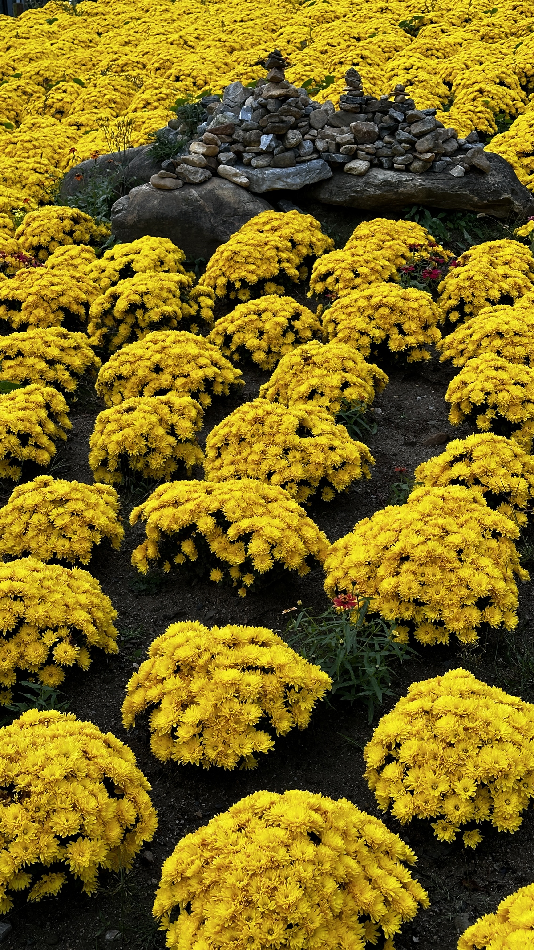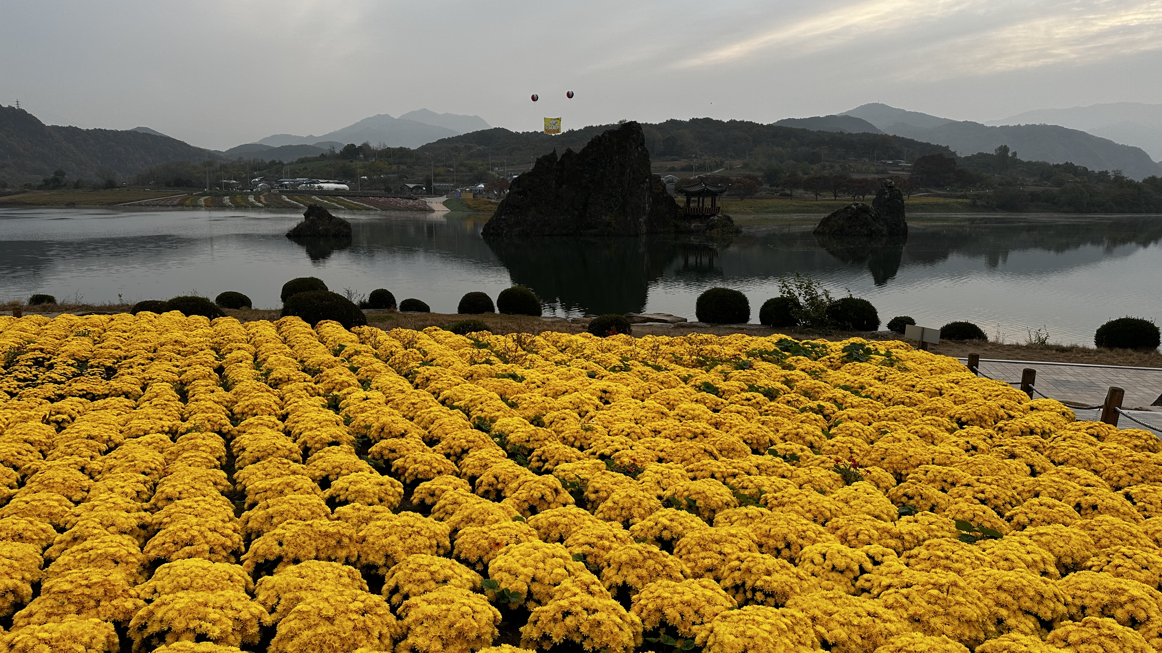 해는 7시가 넘어도 보이질 않고 하늘의 구름만 붉은 색으로 변하고 있다. 국화 빛이 햇빛보다 더 화사하다.