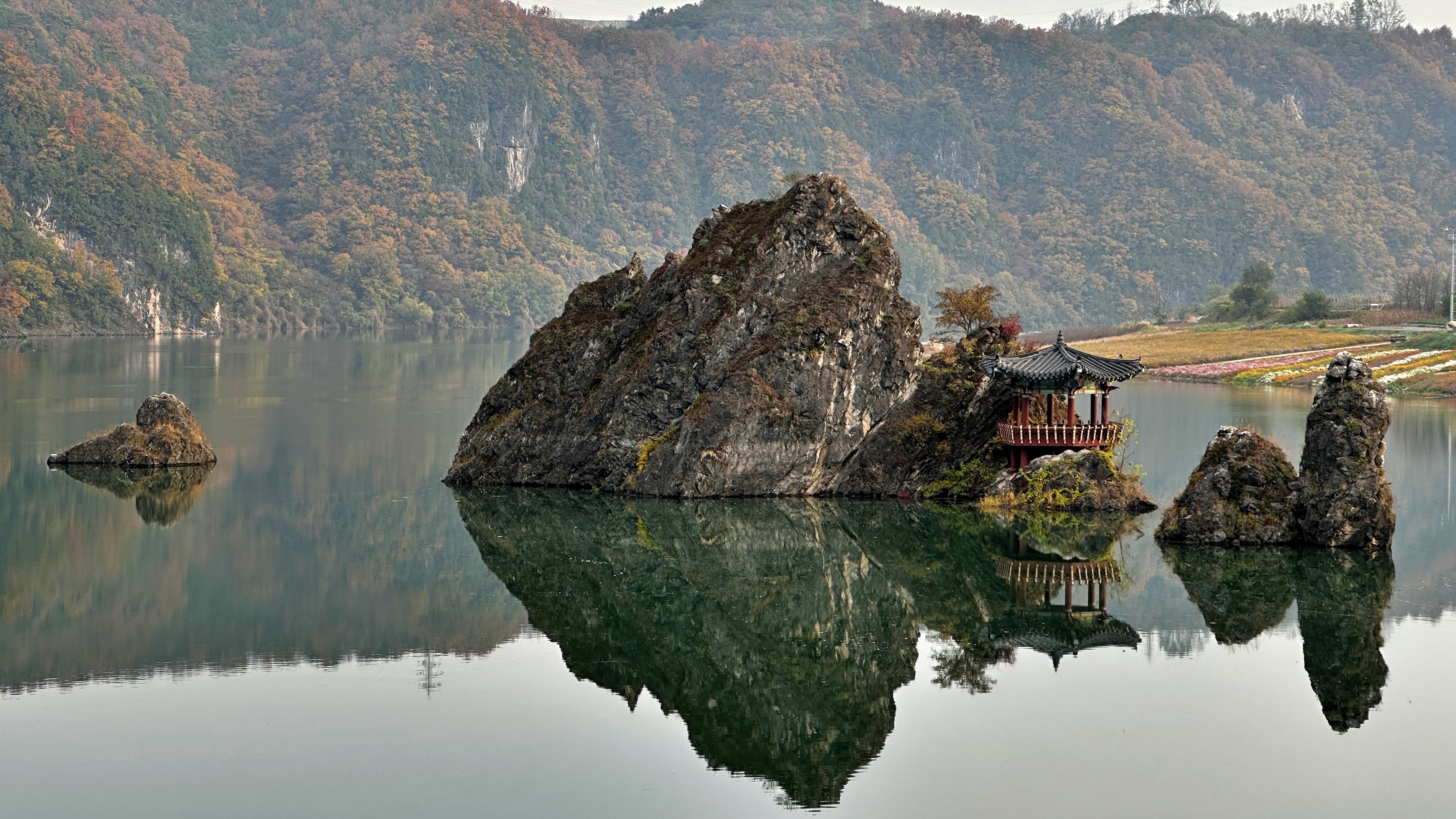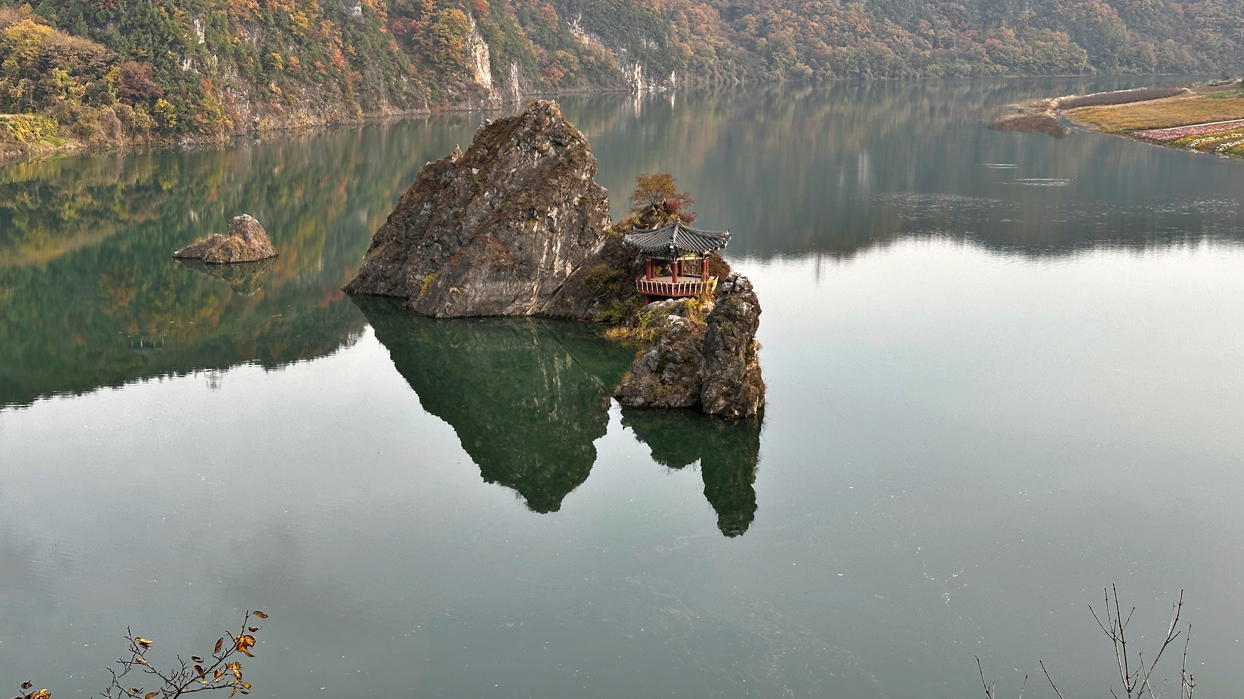도담삼봉터널 앞 다리 아래로는 작은 하천이 단양강으로 이어지는데 이름이 매포천이다. 이곳에 생태공원을 꾸며놓았다. 석회석이 낀 물색이 초록빛을 많이 띄는데, 단풍 반영이 더 선명하게 보인다.