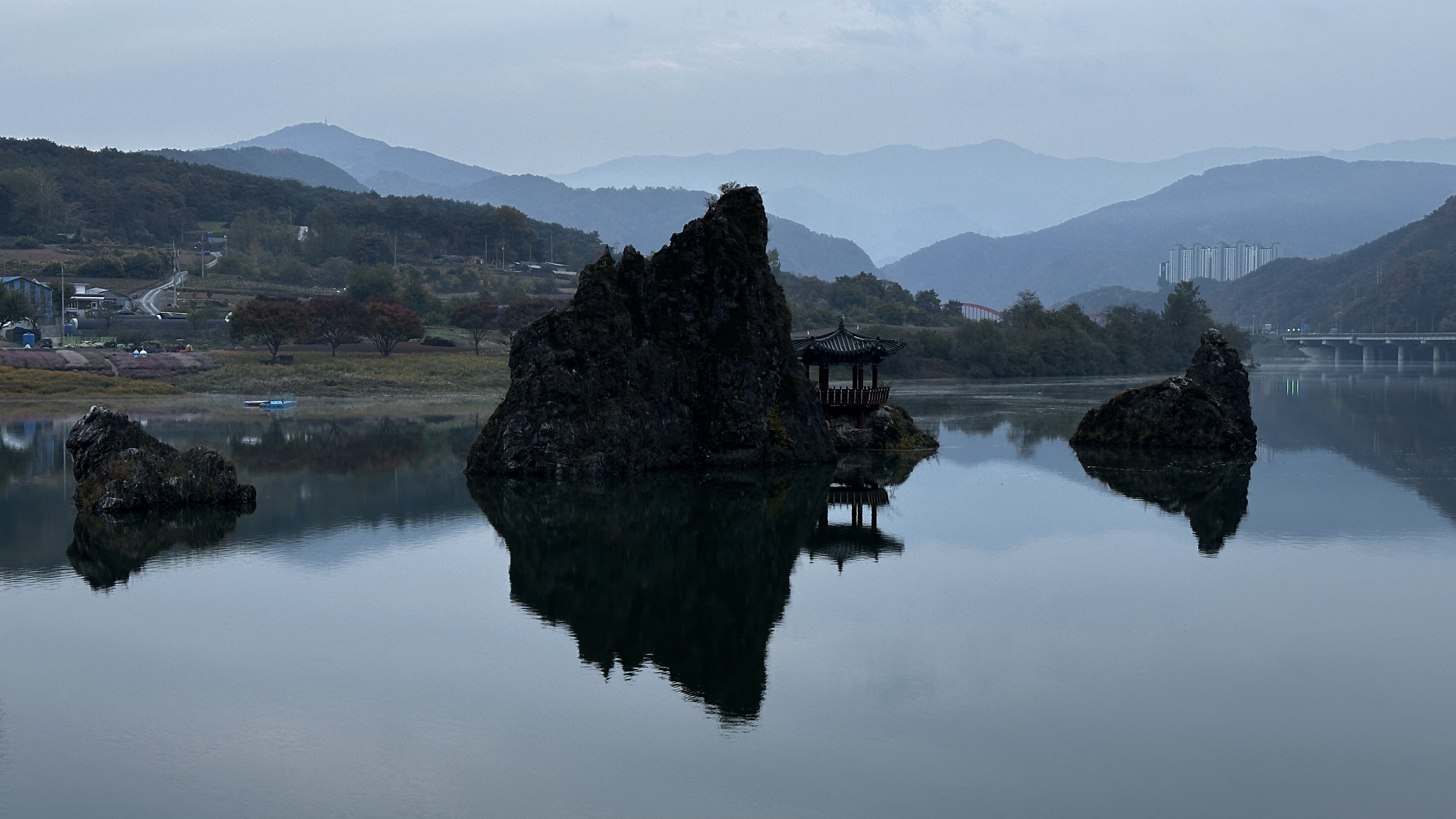 충주호(충주댐으로 생긴 호수를 지자체에 따라 달리 청풍호, 담양호 등으로 부른다)의 물이 차 도담삼봉의 강변 주차장이 물이 잠기는 현상을 보았다.