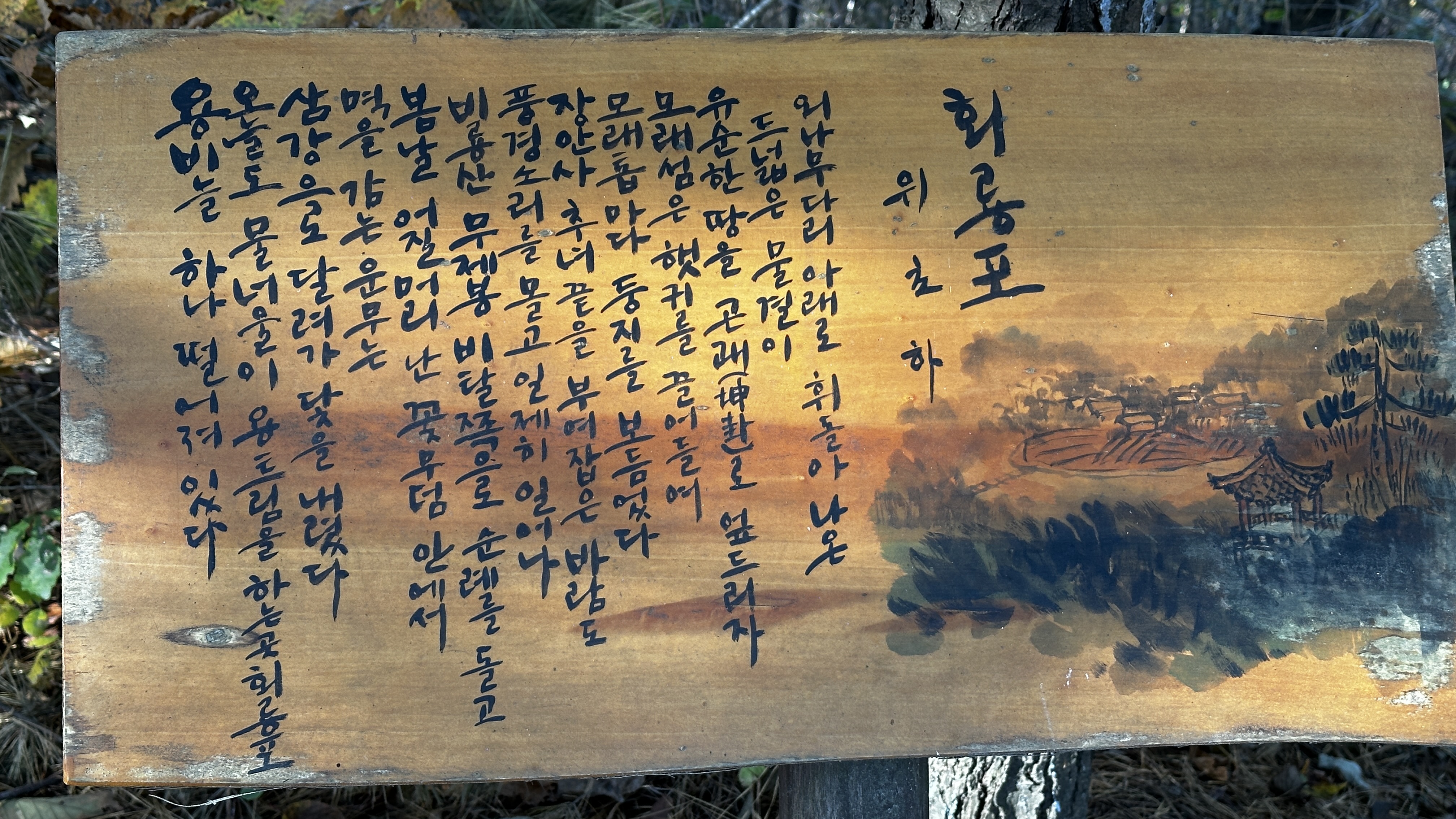 회룡대는 차를 몰고 장안사 주차장으로 가서 걸어서 몇 분이면 닿을 수 있다. 이곳을 오르는 길가에는 유난히도 많이 나무판에 새긴 시화가 많다. 이 시화들을 보는 것도 하나의 재미다. 회룡포 마을 안에도 군데군데 있다. 그 중 한 편이다.