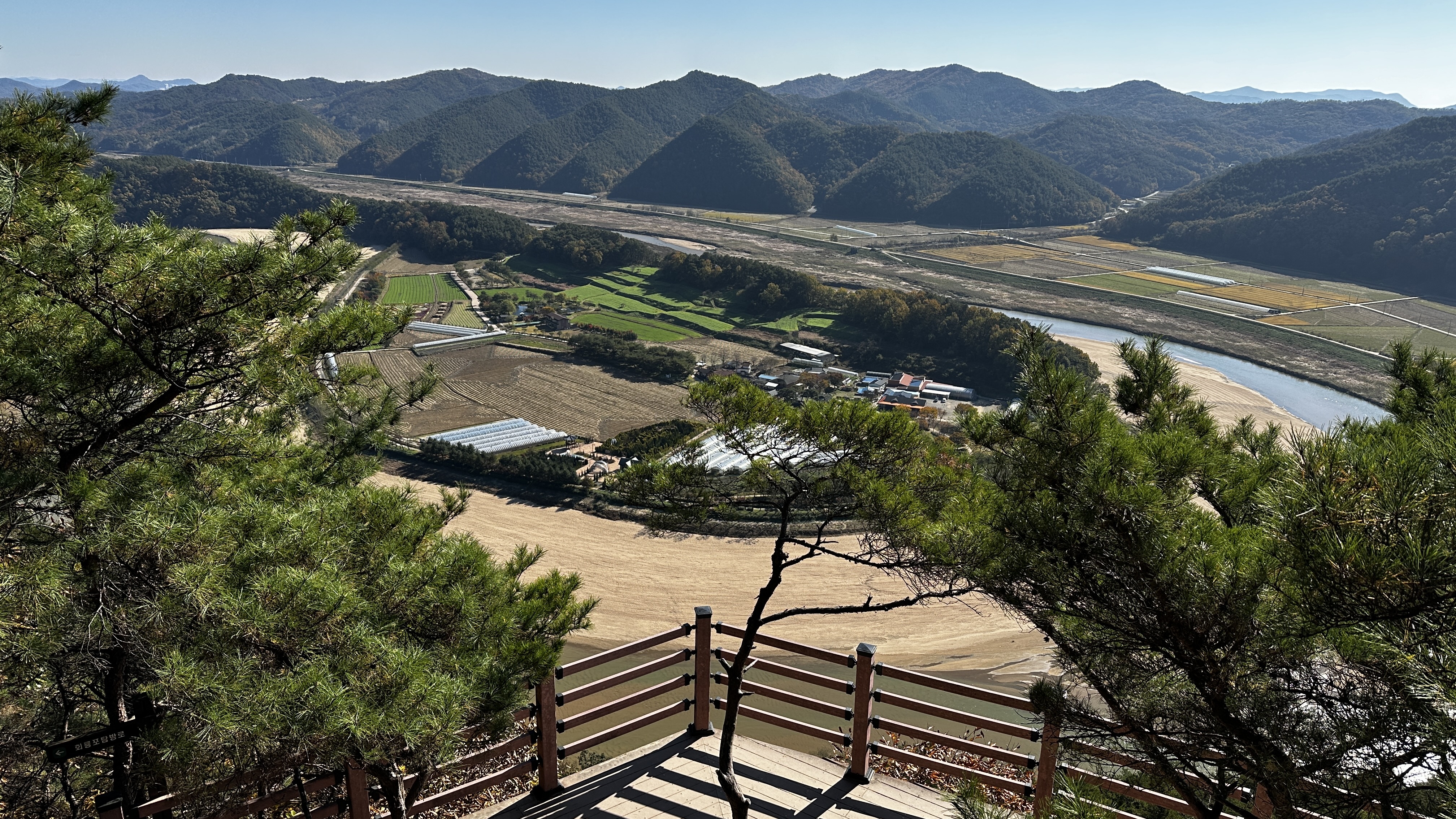 회룡대는 제법 많은 사람들이 찾는 곳인 것 같다. 전망을 할 수 있는 데크가 있고, 정자도 있다. 올라서서 내려다볼 때는 몰랐는데 내려와서 마을에서 올려다보니 아찔한 지형에 세워져 있었다.