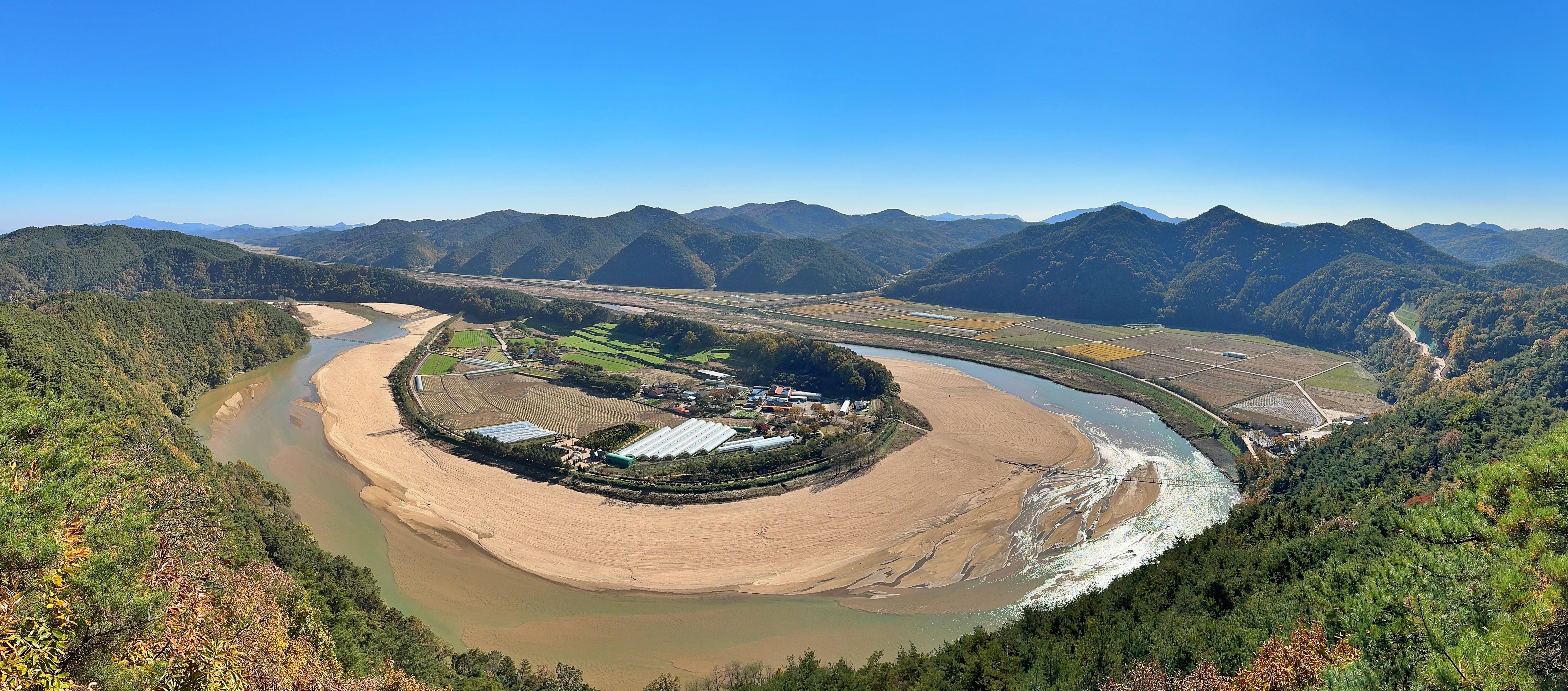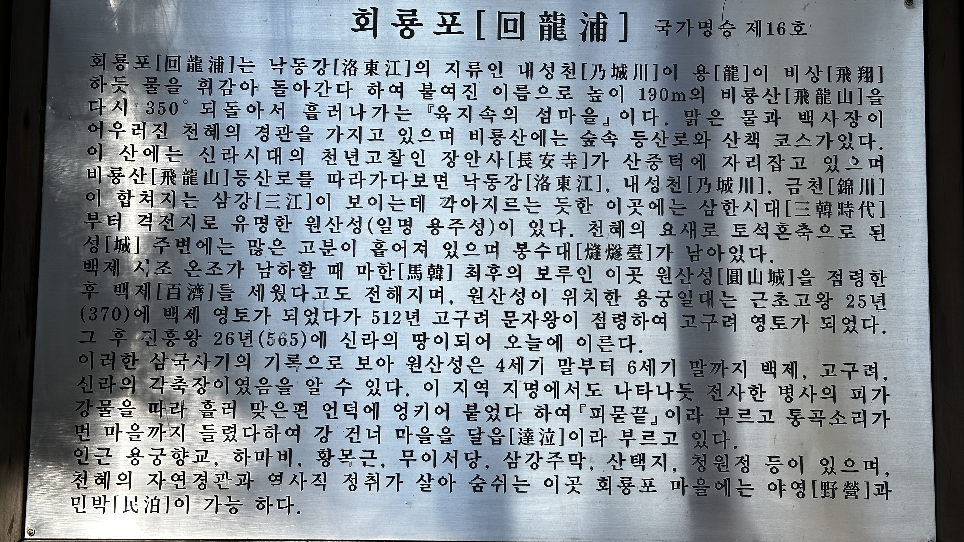 애초에는 내려오는 길에 충주호 유람선을 타고 구담봉, 옥순봉을 둘러볼 생각이었는데 갑자기 아침 기온이 영하로 내려가는 바람에 그 계획을 접었다. 칼 바람 쐬면서 경치 구경이란 생각만으로 몸이 얼어붙는 느낌. 해서 전날 지인이 전화 통화 중에서 알려준 회룡포를 들리기로 했다. 회룡포는 내세울 관광지가 몇 안 되는 경북 예천에 있다.