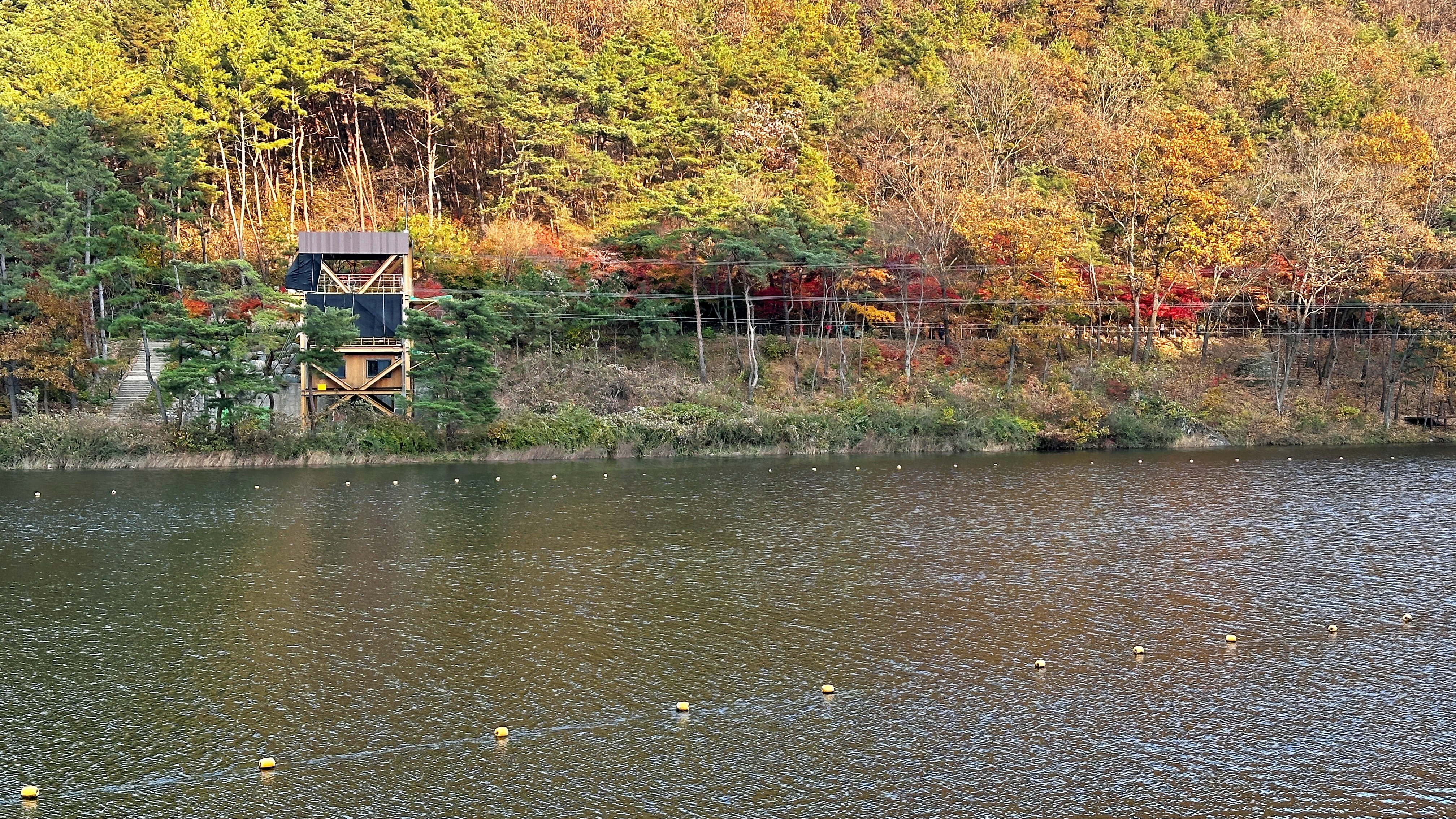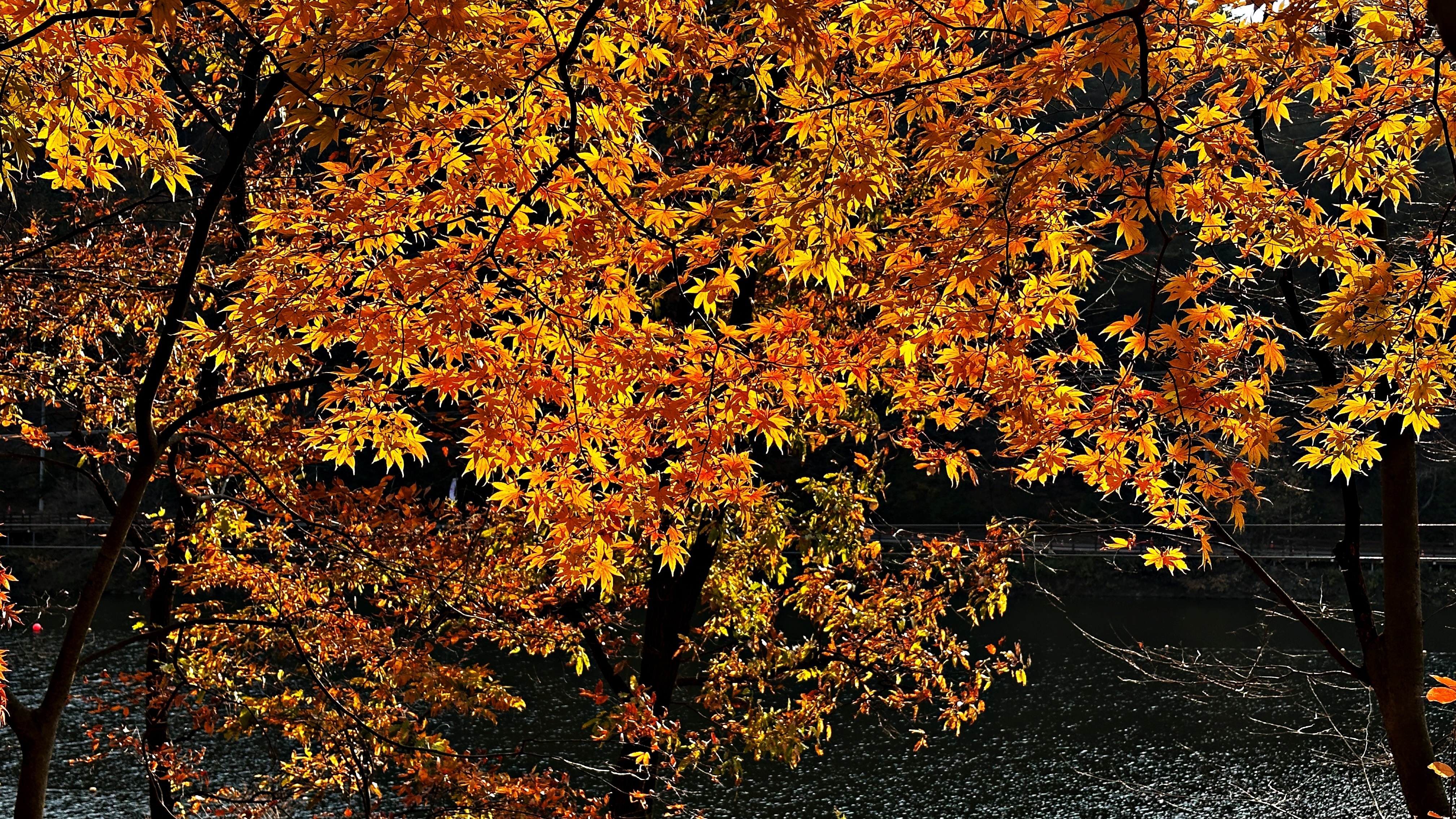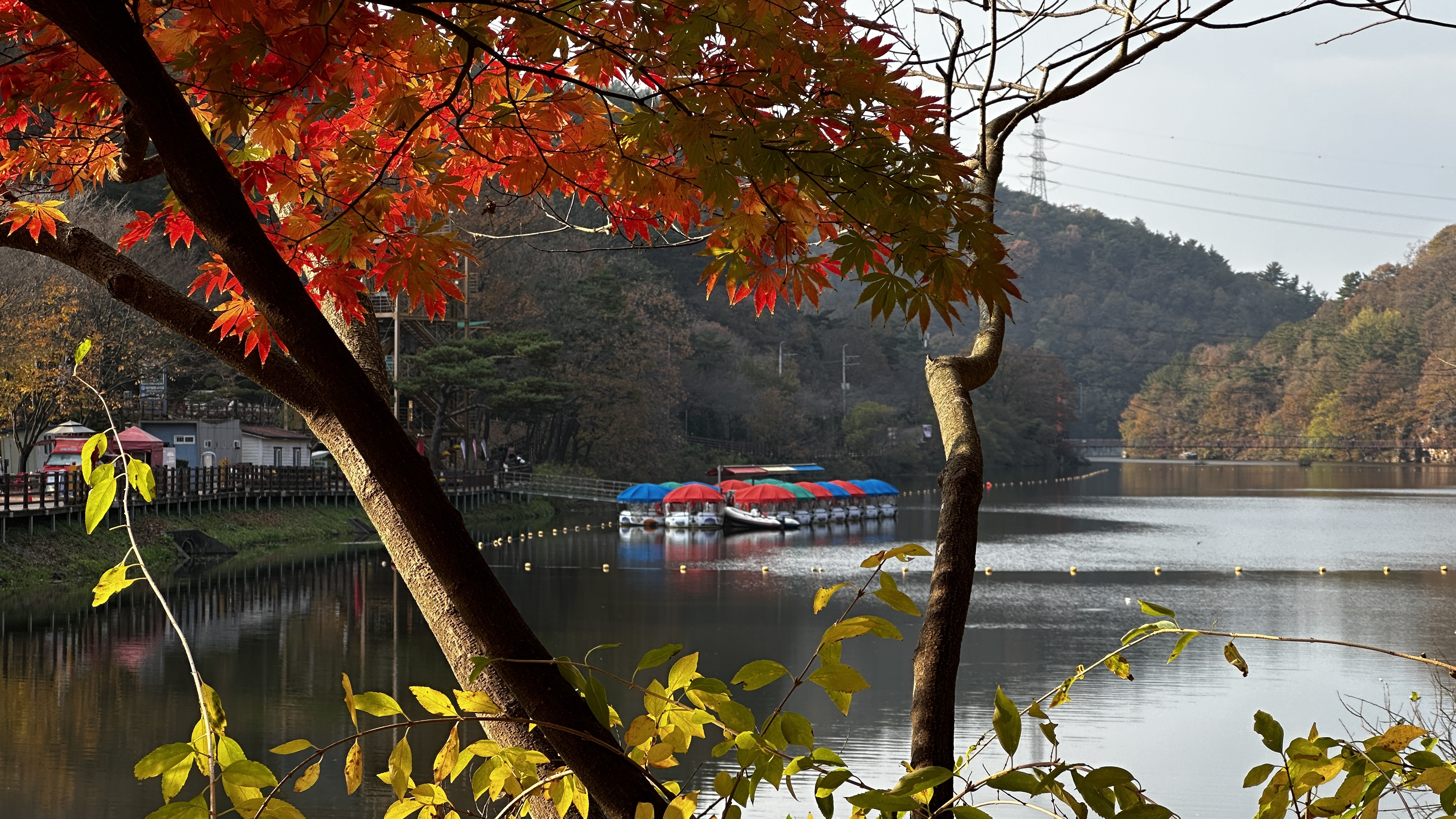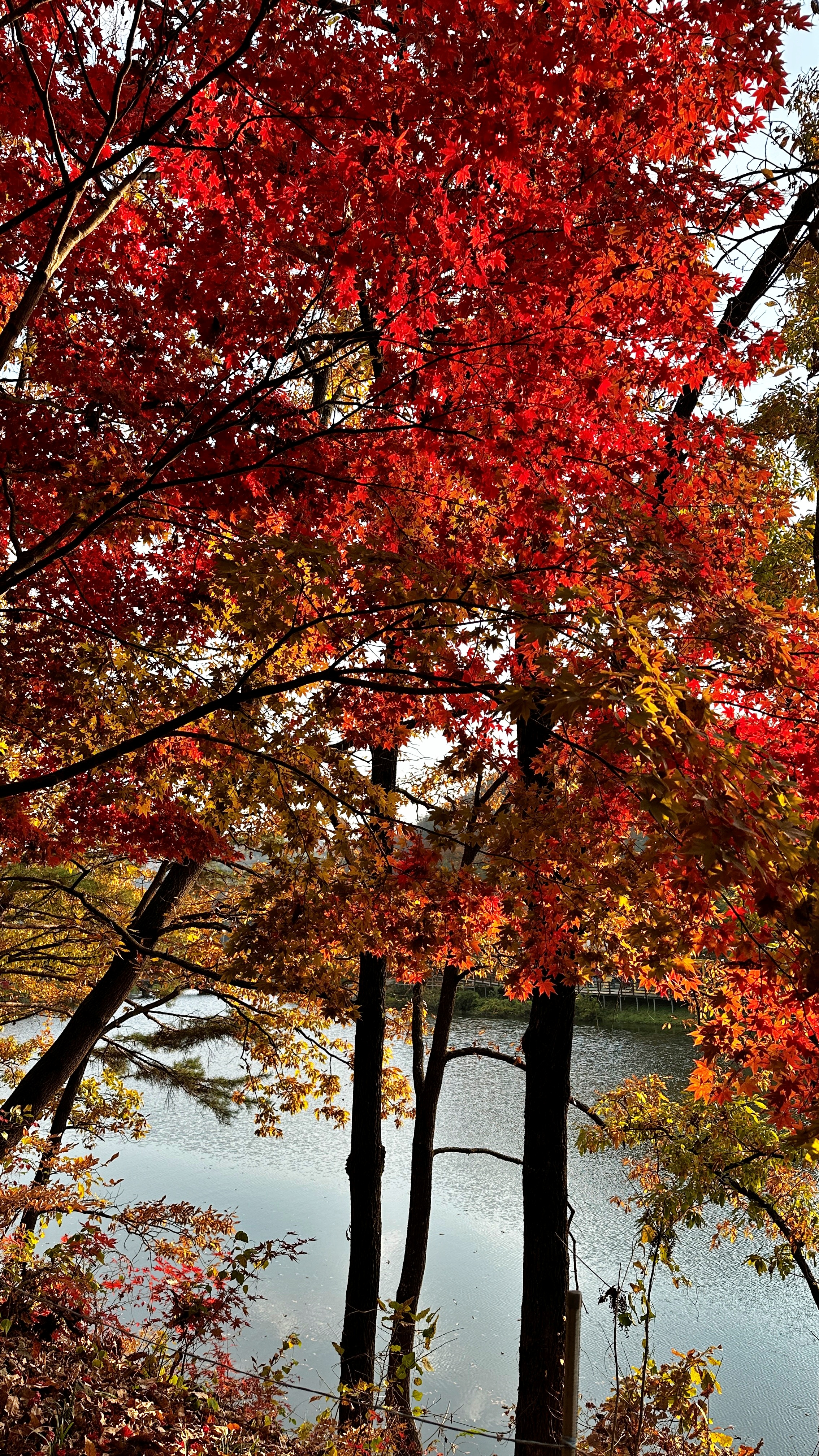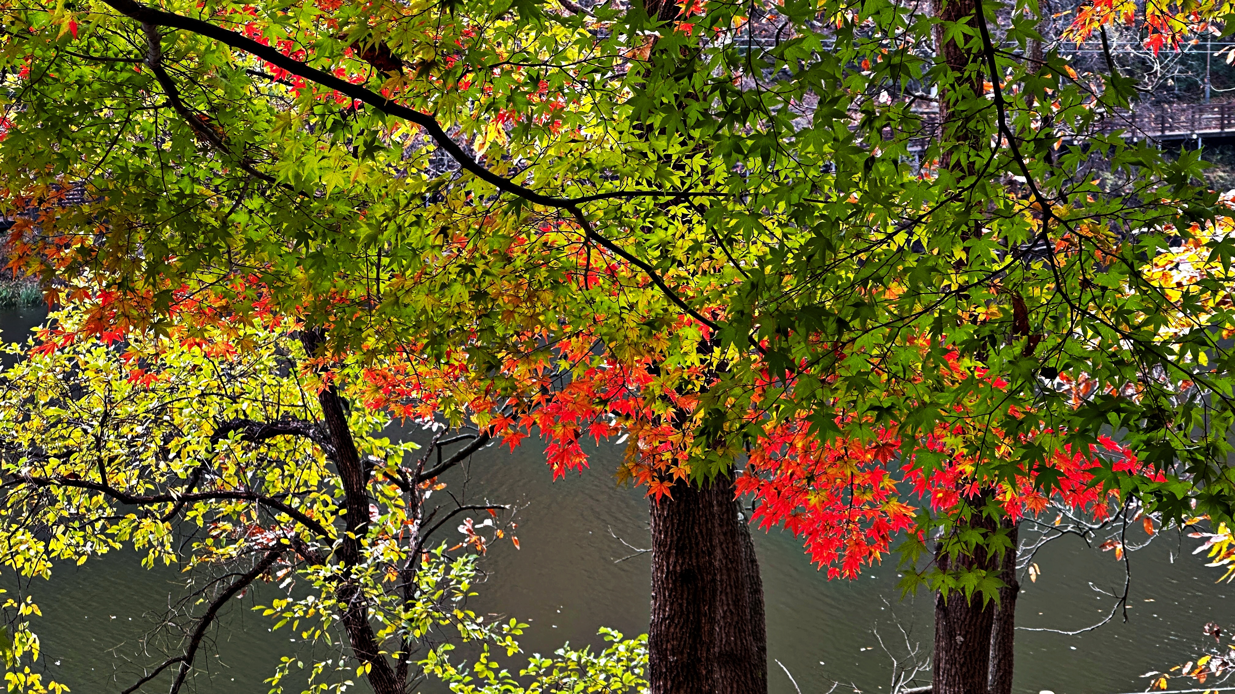 약간의 변화를 의아해하며 주차장에서 저수지 오른쪽으로 난 산책로로 접어들었는데, 작은 단풍 몇 그루가 초라하게 울긋불긋 색상을 뽐내느라 애를 쓰고 있던 연전의 기억을 완전히 갈아치우는 풍경이 눈앞에 펼쳐졌다.