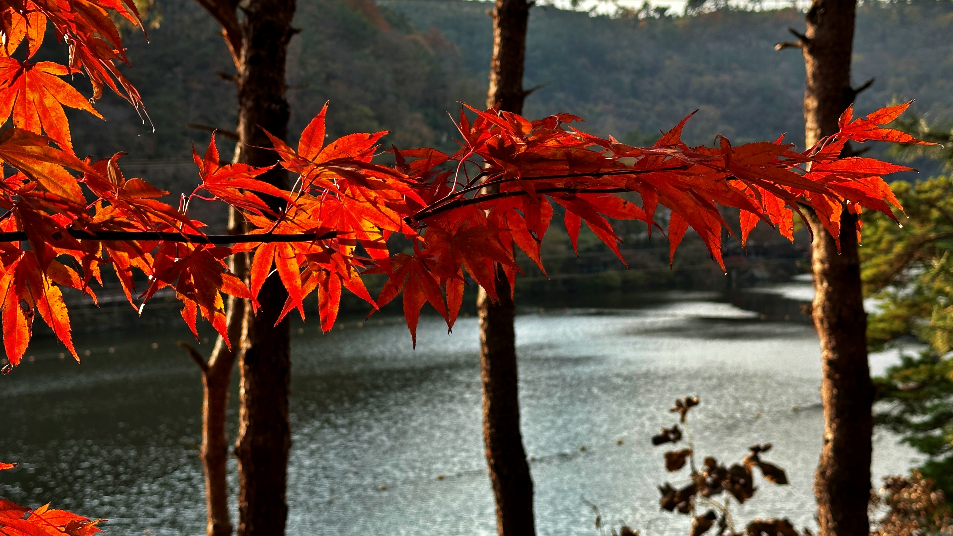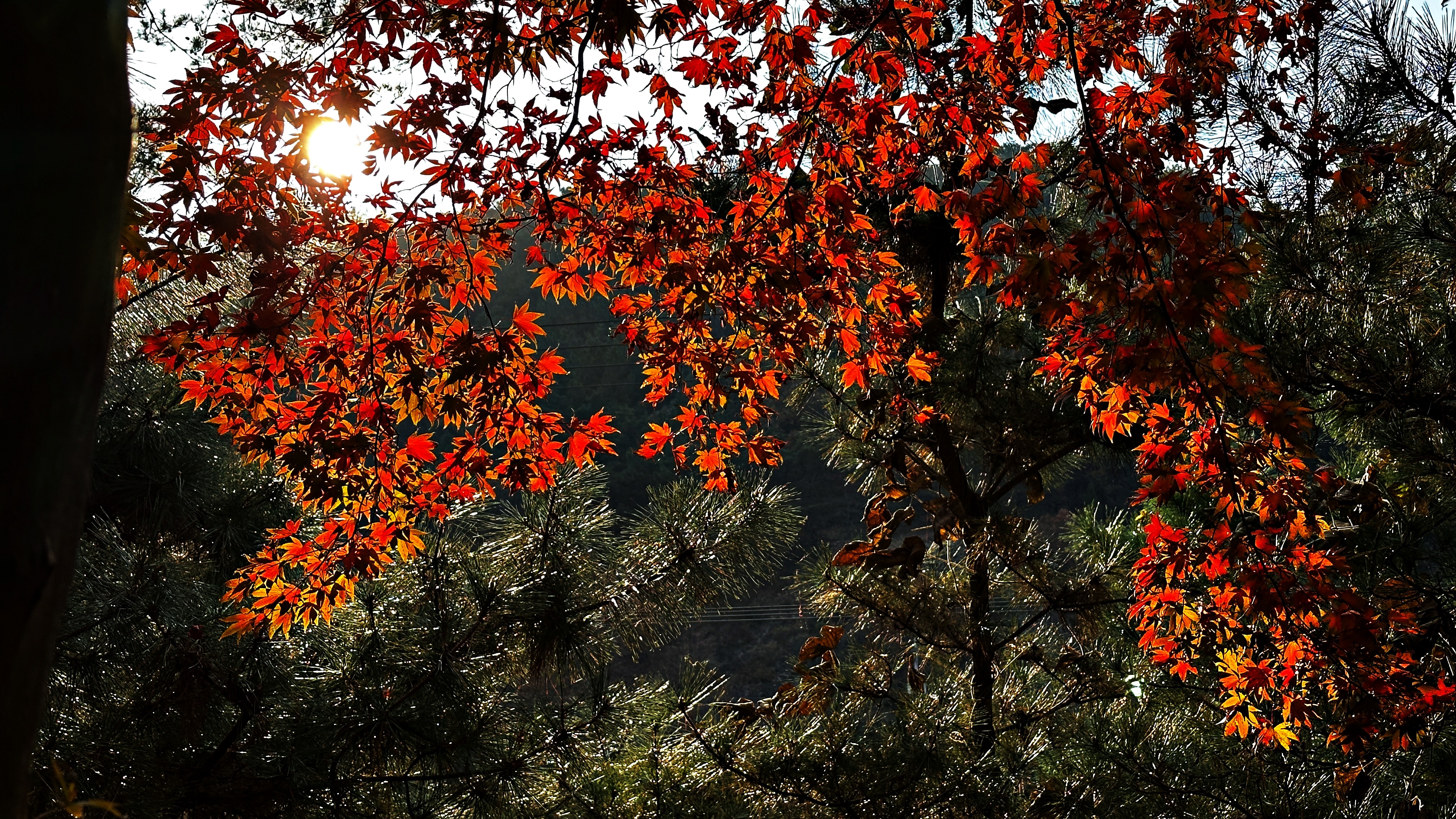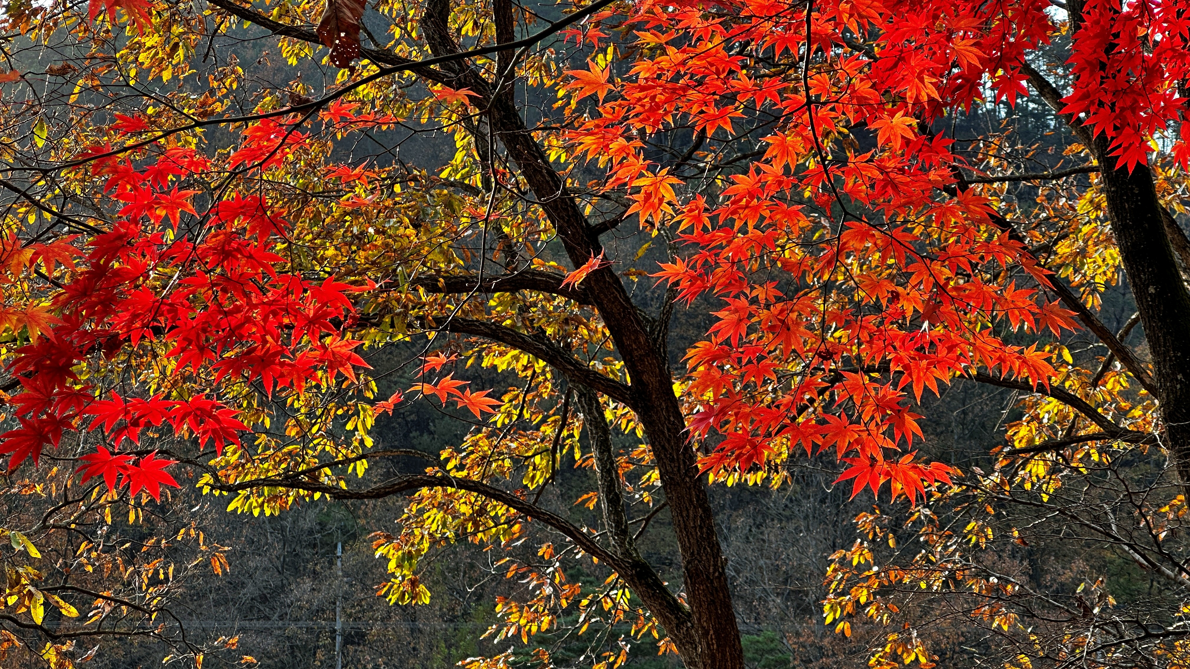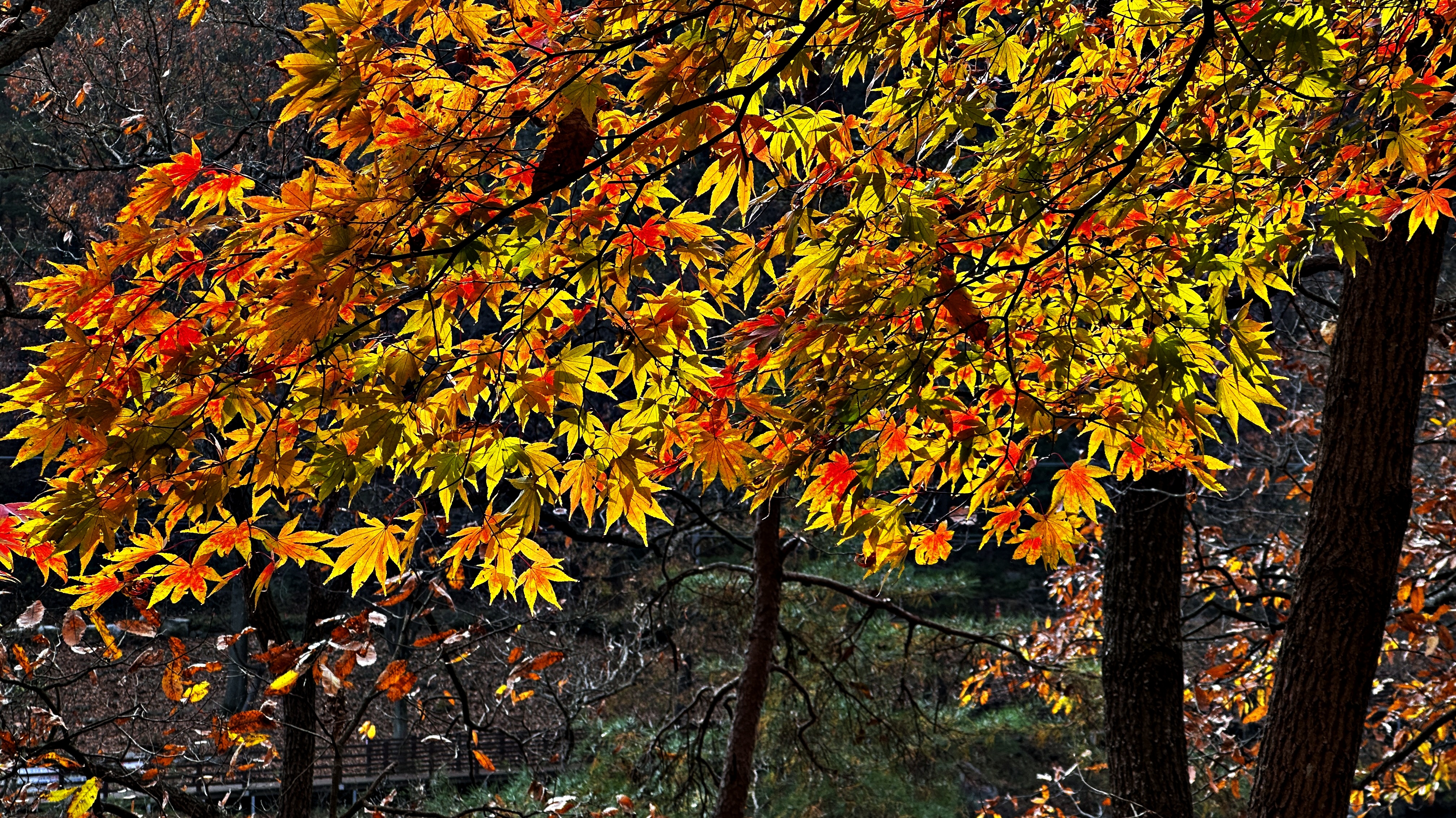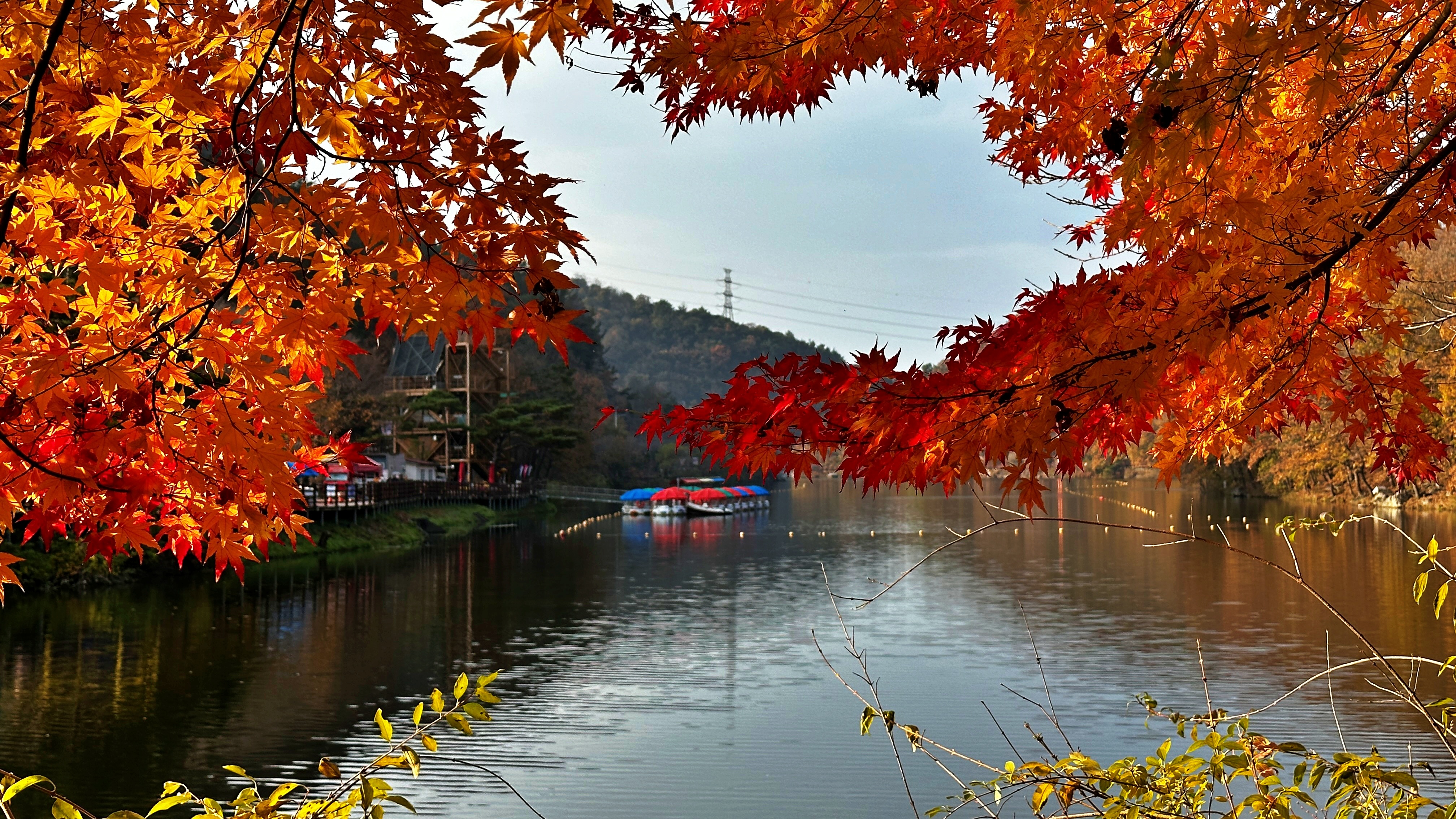 약간의 변화를 의아해하며 주차장에서 저수지 오른쪽으로 난 산책로로 접어들었는데, 작은 단풍 몇 그루가 초라하게 울긋불긋 색상을 뽐내느라 애를 쓰고 있던 연전의 기억을 완전히 갈아치우는 풍경이 눈앞에 펼쳐졌다.