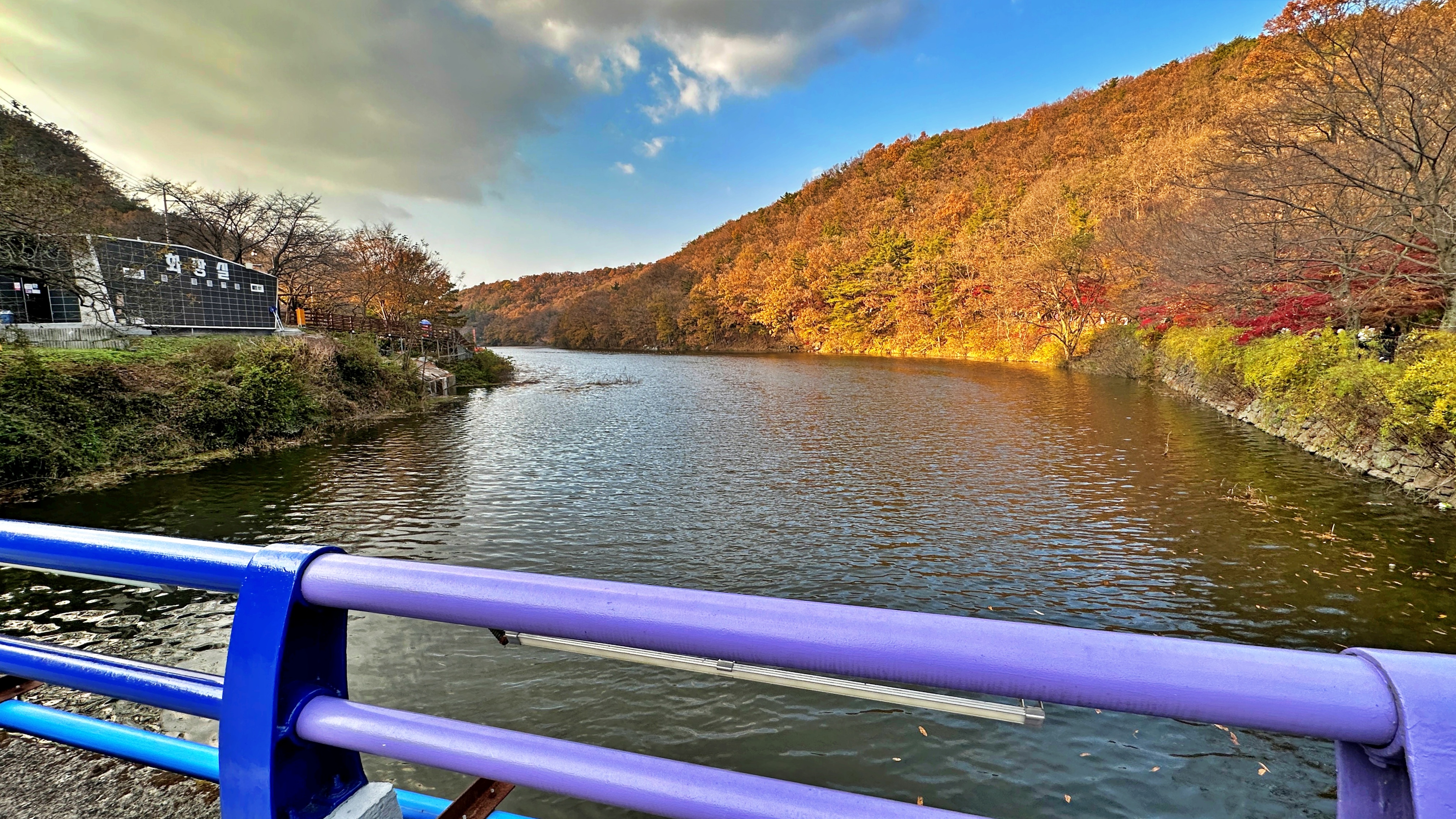 예전 다리는 차량 통행을 금지하고 있다. 다리 난간에 무지재 색을 입혀놓아서 저수지 양안의 단풍과 썩 잘 어울렸다.