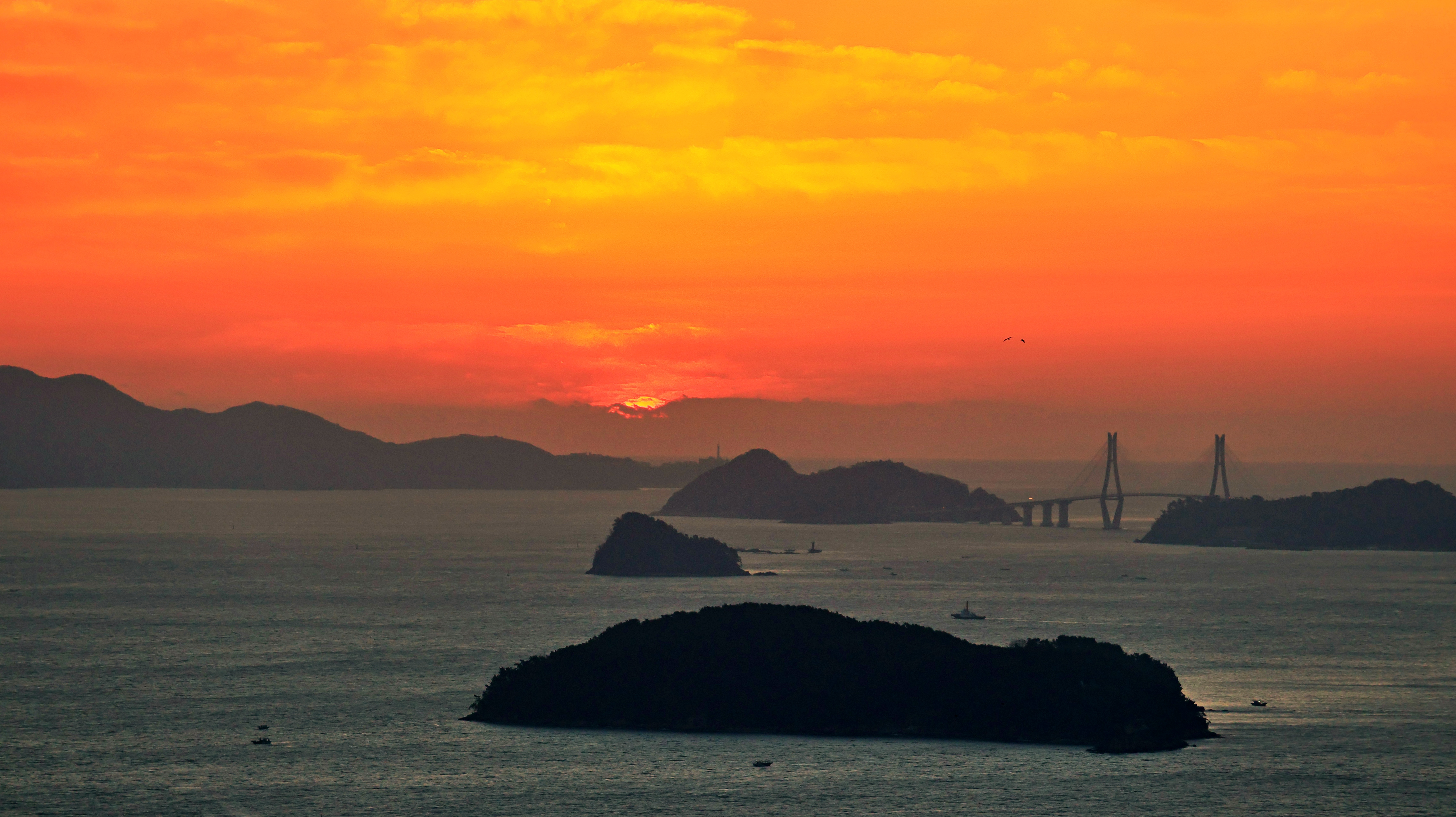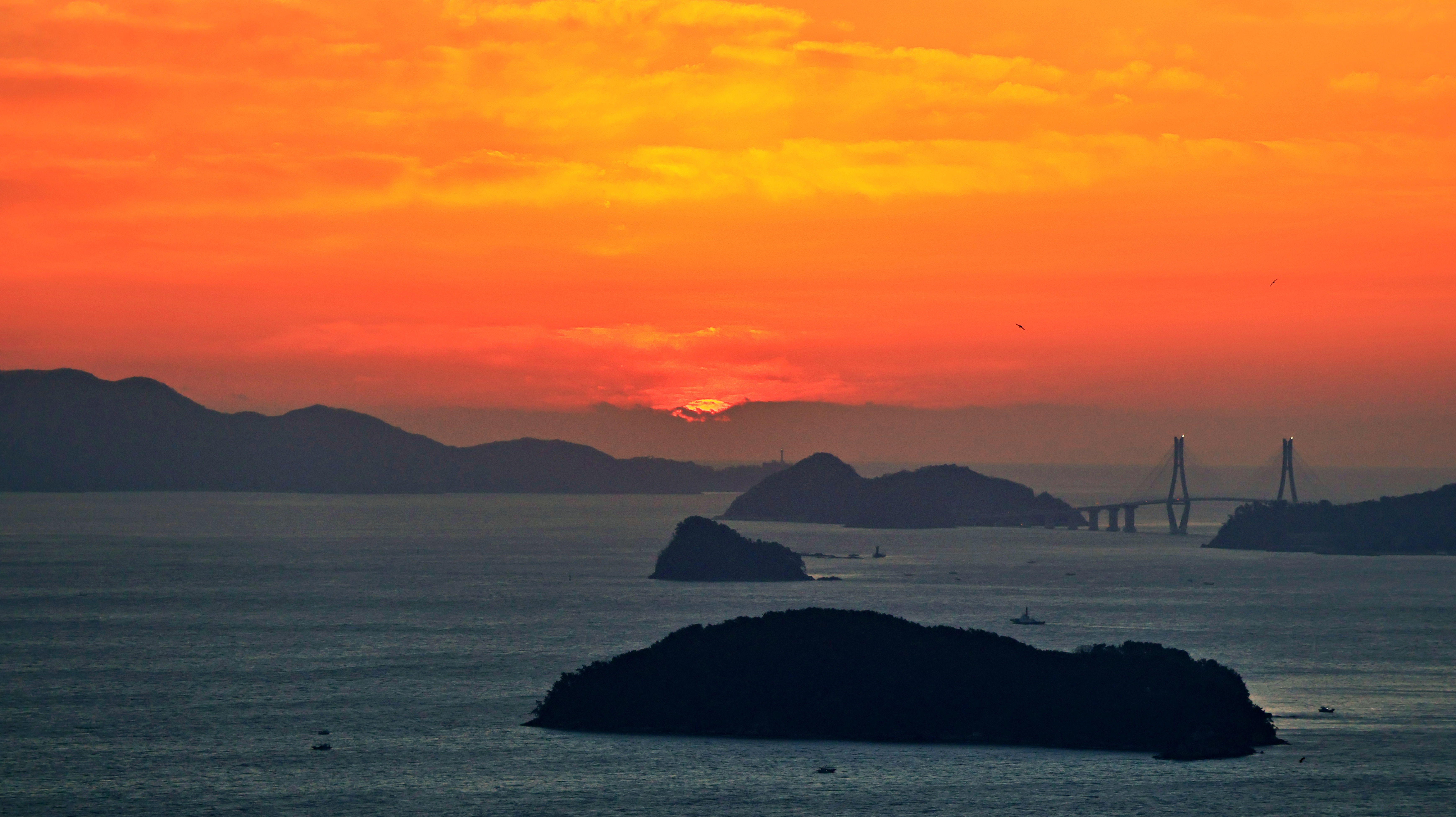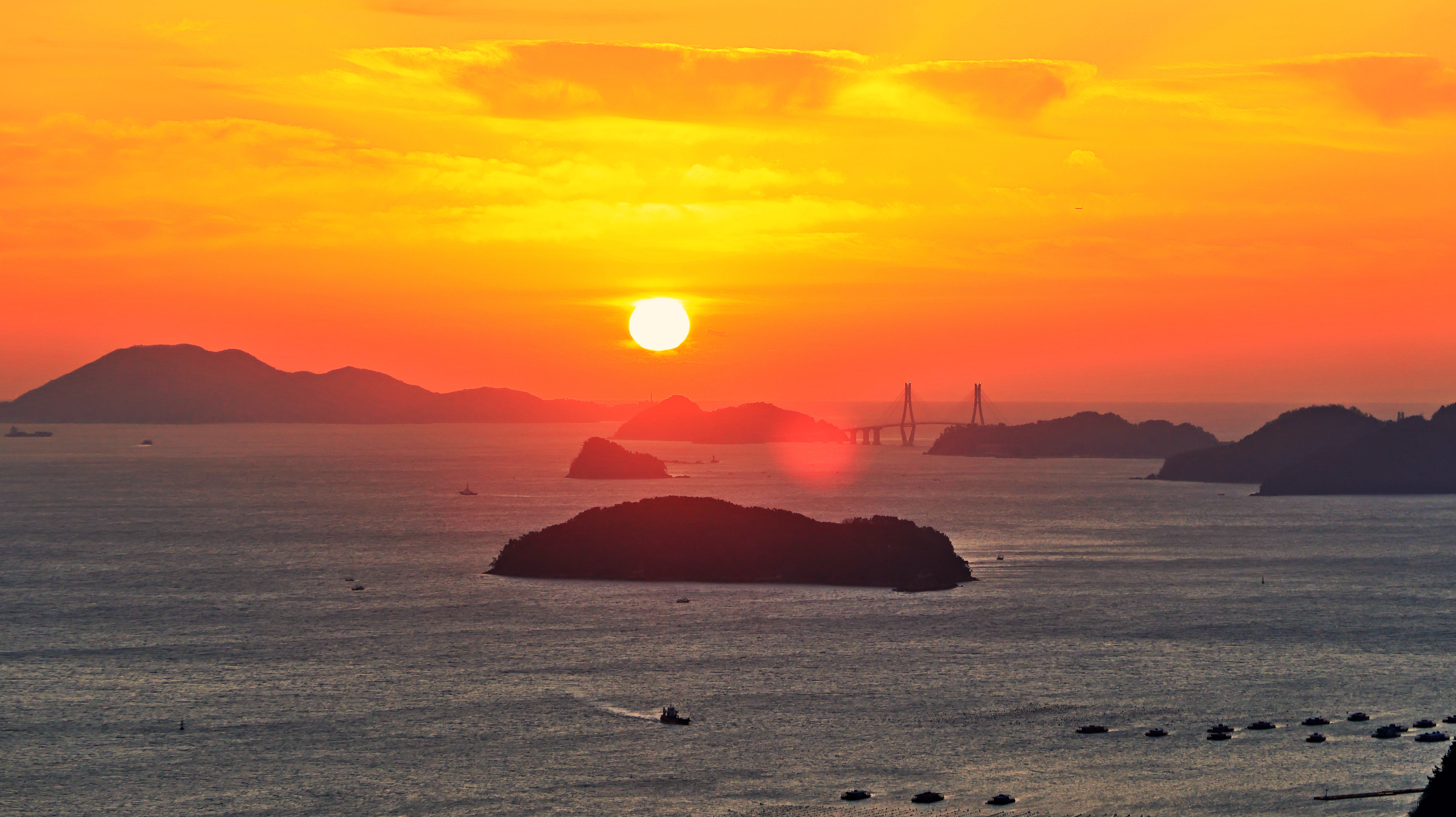 살짝 동북쪽 방향으로 돌려본다. 왼쪽 끝은 진해해군기지, 가운데로 부산항 신항과 가덕도, 가거대교, 오른쪽으로 거제도와 그 앞으로는 원전항과 낚시꾼을 위한 해상 방갈로가 뚜렷이 시야에 들어온다.