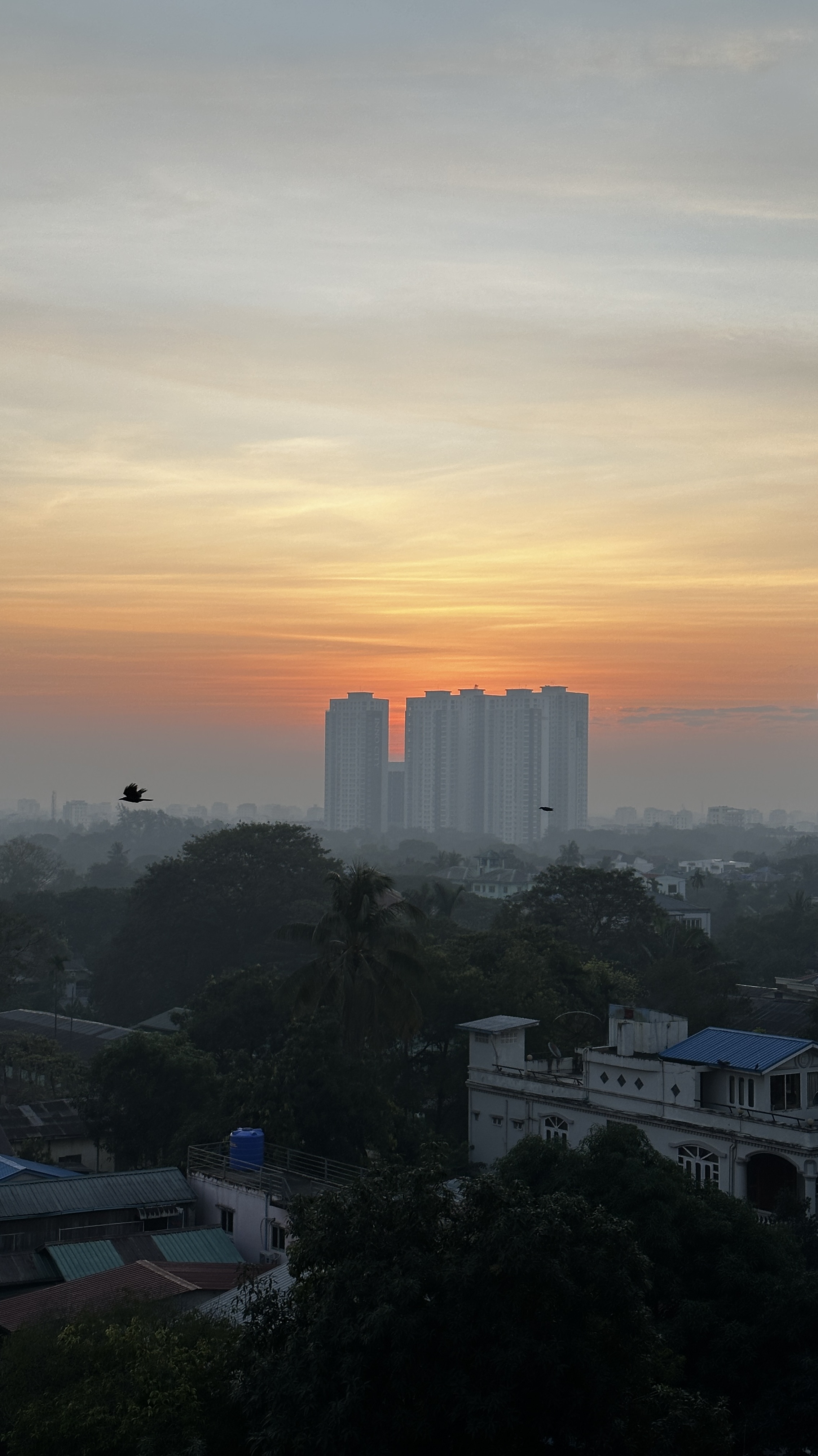해뜰 무렵, 아레카 호텔 방에서 내려다본 양곤의 모습은 뽀얀 연무로 덮여 있다. 분주한 양곤의 차들과 사람들이 일으킨 먼지와 찬공기가 섞여 그런 모습을 보이는가 보다.