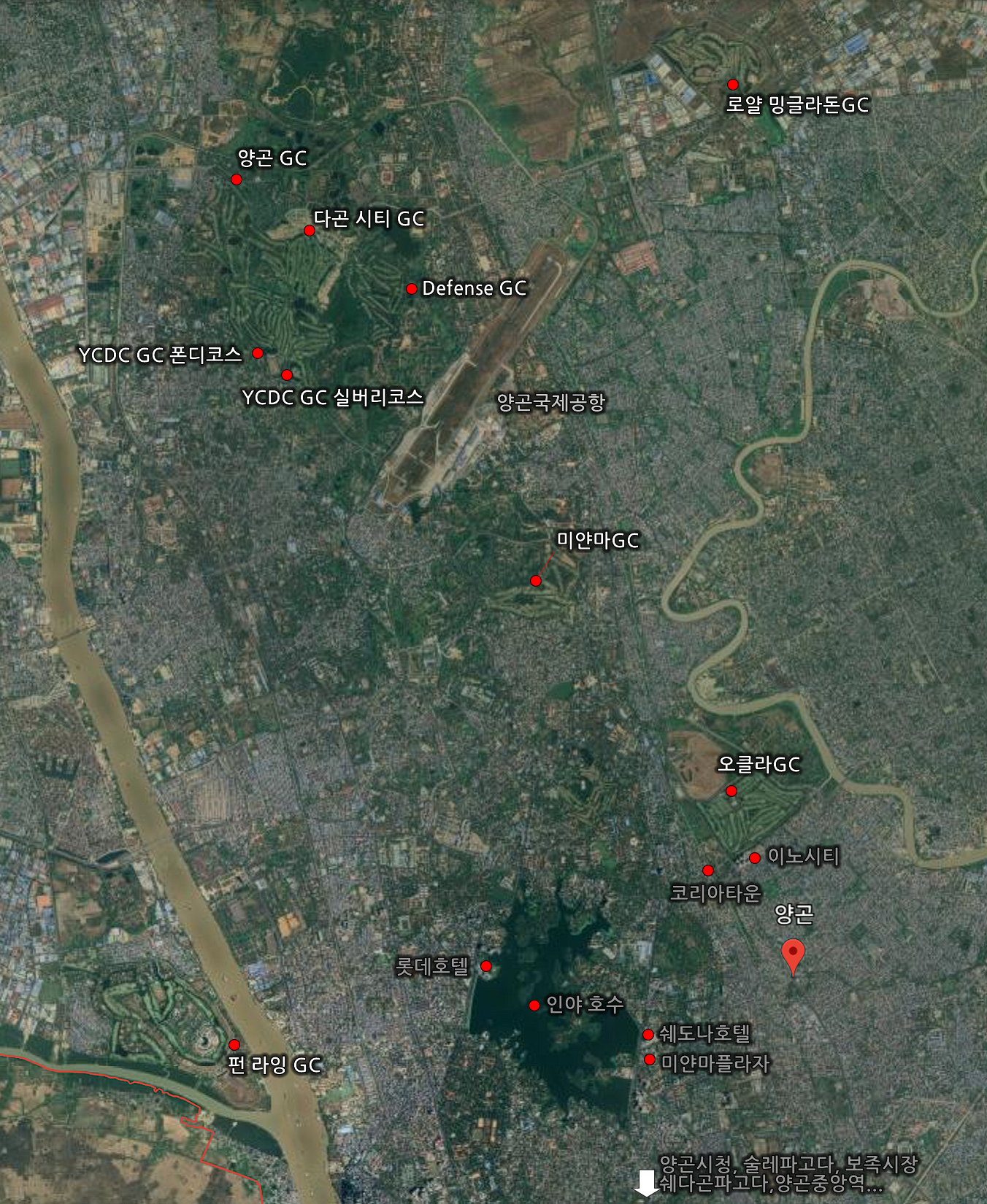 인야호수를 기점으로 로얄 밍글라돈GC까지는 차로 약 40분, 양곤, 다곤, YCDC까지는 약 30분, 미얀마GC는 20분, 오클라GC까지는 10분 내외면 도착할 수 있다. 가장 비싼 골프장인 펀라잉도 30여분이면 갈 수 있다.