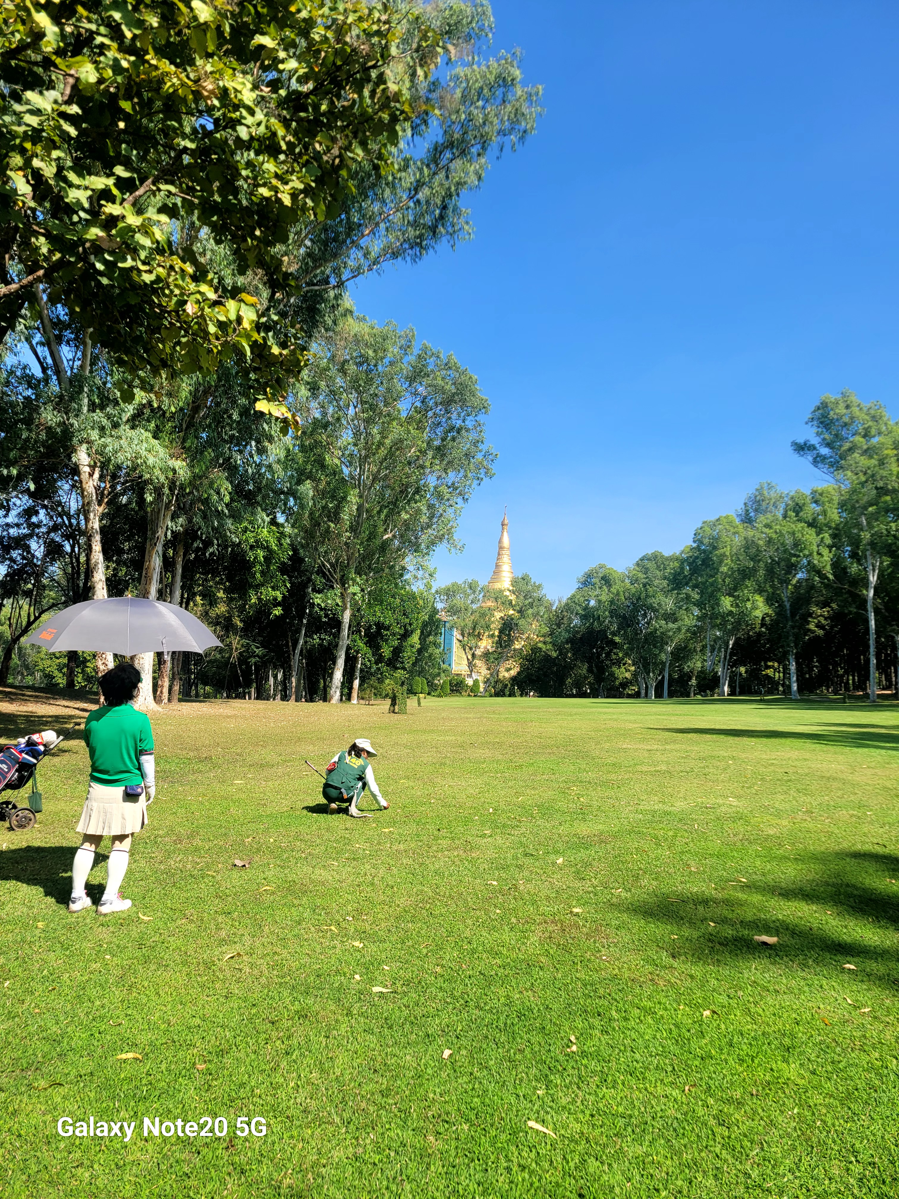 이전에 타던 차가 못 미더워 차종까지 지정해서 빌린 이번의 차도 말썽을 일으켰다. 계기판에 엔진 이상 경고등이 들어오는데 양곤에서는 그래도 별 무리없이 잘 달리더니 네피도에 와서는 오르막길을 차고 올라가지 못하는 증세가 나타나기 시작했다. 차고지가 네피도라 운전사 우쪼는 이곳에서 점검 및 수리를 시도했다. 네피도 이튿날 핀마나 쪽의 카센터에서 점검을 받았는데 엔진 경고등이 사라졌다. 그런데 그 다음날 또 등이 켜졌다. 이날은 오전에 골프를 하고 오후에는 핀우린으로 갈 예정이었다. 그런데 시티골프코스(City Golf Course)에 도착해보니 마침 휴장일이었다. 골프장으로 가지 전에 일행 중에서 환전이 필요하다는 이가 있어 에뚜조에게 연락을 했다. 그는 미얀마 돈을 가지고 골프장까지 와주었다. 그리고 휴장하기 않은 엡야골프장으로 안내를 해주었다. 이 엡야골프장은 양곤의 쉐다곤 파고다를 그대로 베낀 우파타산티 파고다 주변에 있다. 아래 사진을 보면 저 멀리로 보이는 그 탑이다.