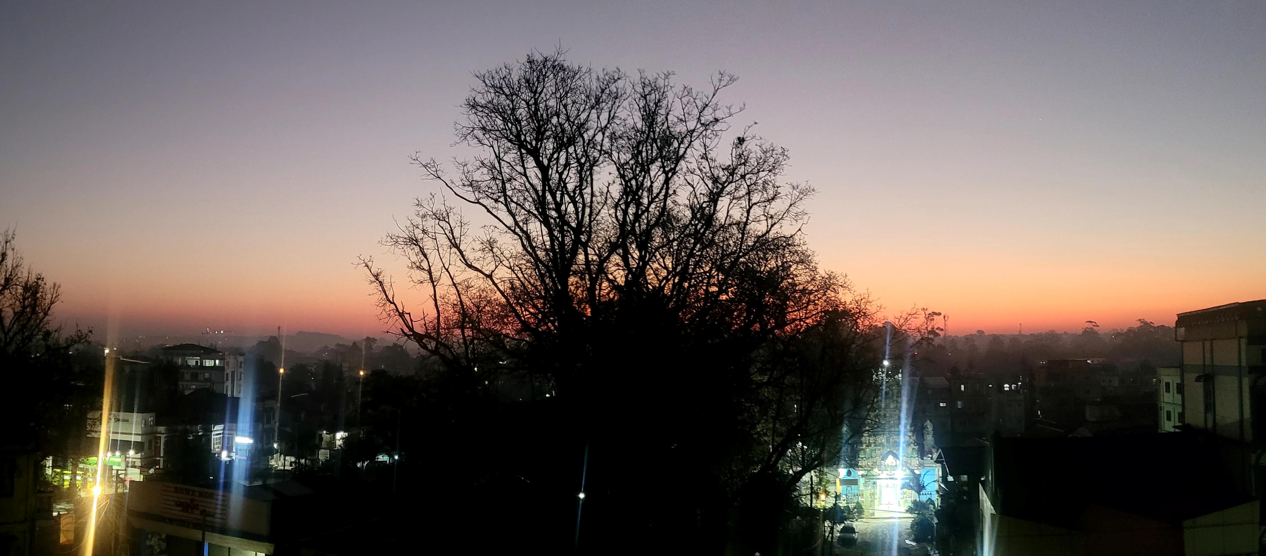 호텔에서 본 핀우린 시내의 동틀 무렵. 나무 오른쪽으로 불을 밝힌 힌두교 사원이 보인다.