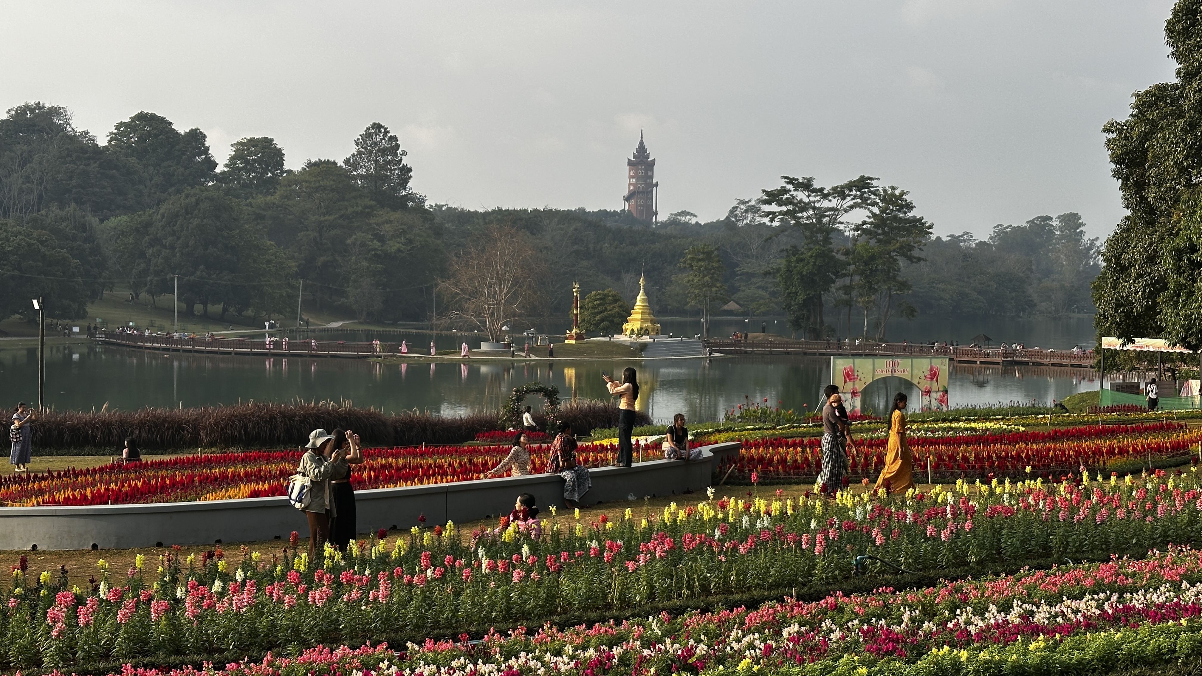 내셔널 깐도지 정원 National KhaDawGyi Garden은 이름에서 알 수 있듯이 국립 정원이다. 나라에서 만들었다는 건데 그 나라는 바로 영국이고 현재는 미얀마 정부에서 관리하고 있다. 영국식 정원인데 시내를 조망할 수 있는 타워, 그 아래에는 나비박물관과 난원이 있다. 깐도지 호수를 주변으로 울창한 숲과 잔디 광장, 꽃밭이 조성되어 있고 호수에는 백조와 흑조가 유유자적하게 놀고 있다. 미얀마인은 무료 입장, 외국인은 1만 짯의 입장료를 내야한다. 많은 미얀마인들이 내방하는 명소이다. 때마침 한 달 여 동안 개장 100주년 기념 플라워 페스티발이 열리고 있어 공원은 예쁜 꽃들로 단장되어 있었고, 잔디 광장에는 젊은이들의 락 페스티발로 북새통을 이룬 가운데 로제의 'APT'에 맞춰 신나는 댄스파티가 펼쳐지고 있었다.