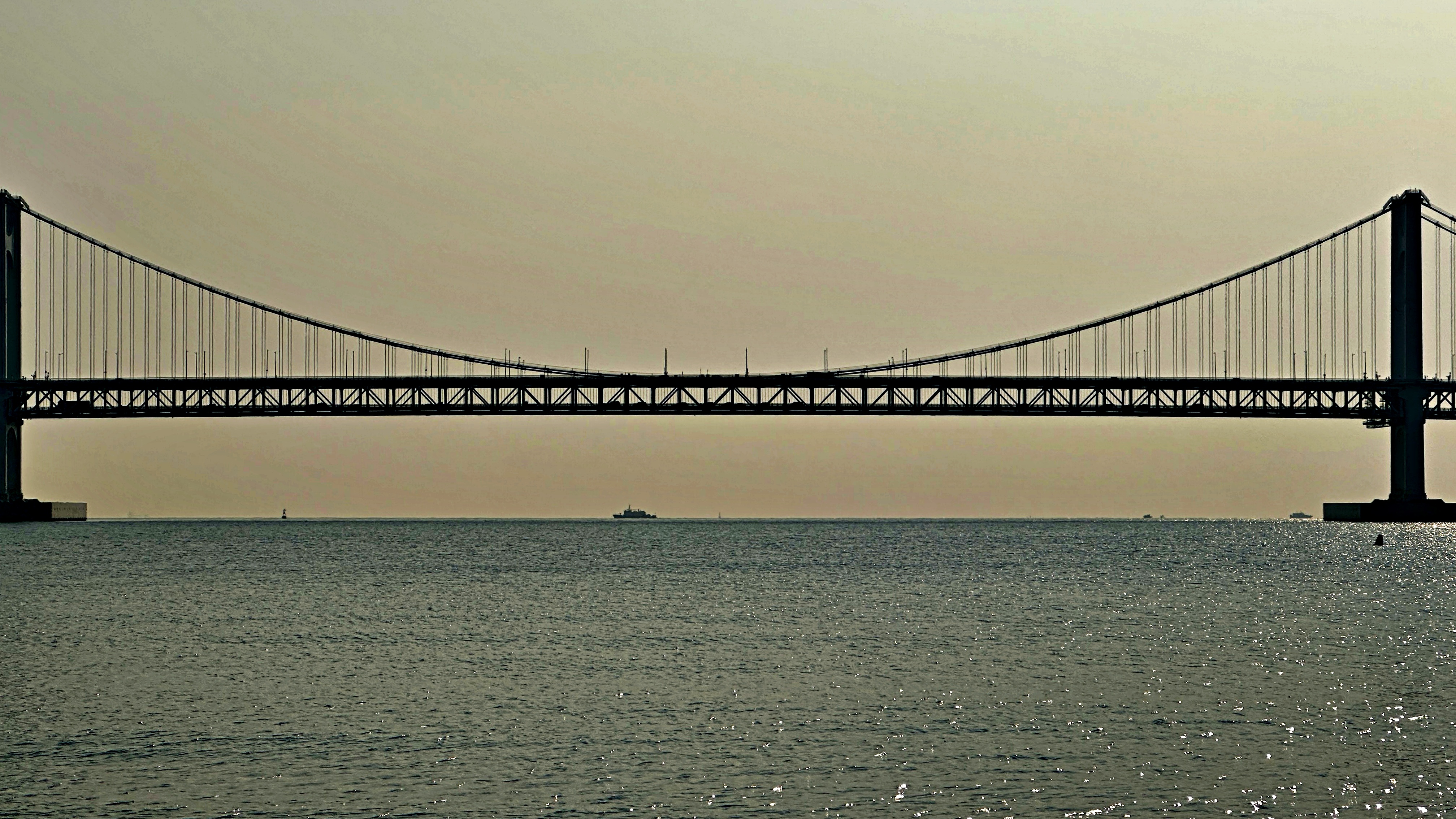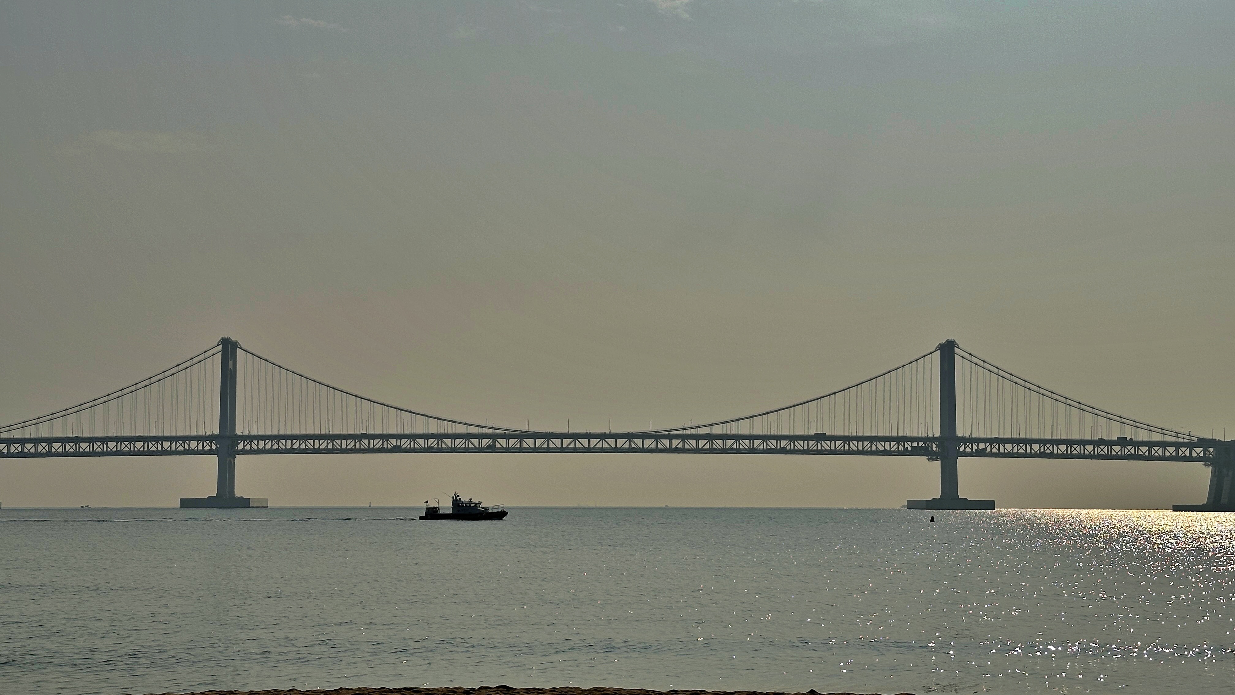 광안대교 복층다리에는 차들이 쉼없이 달리고 있고, 바다 위로 배들이 가끔 지나간다.
