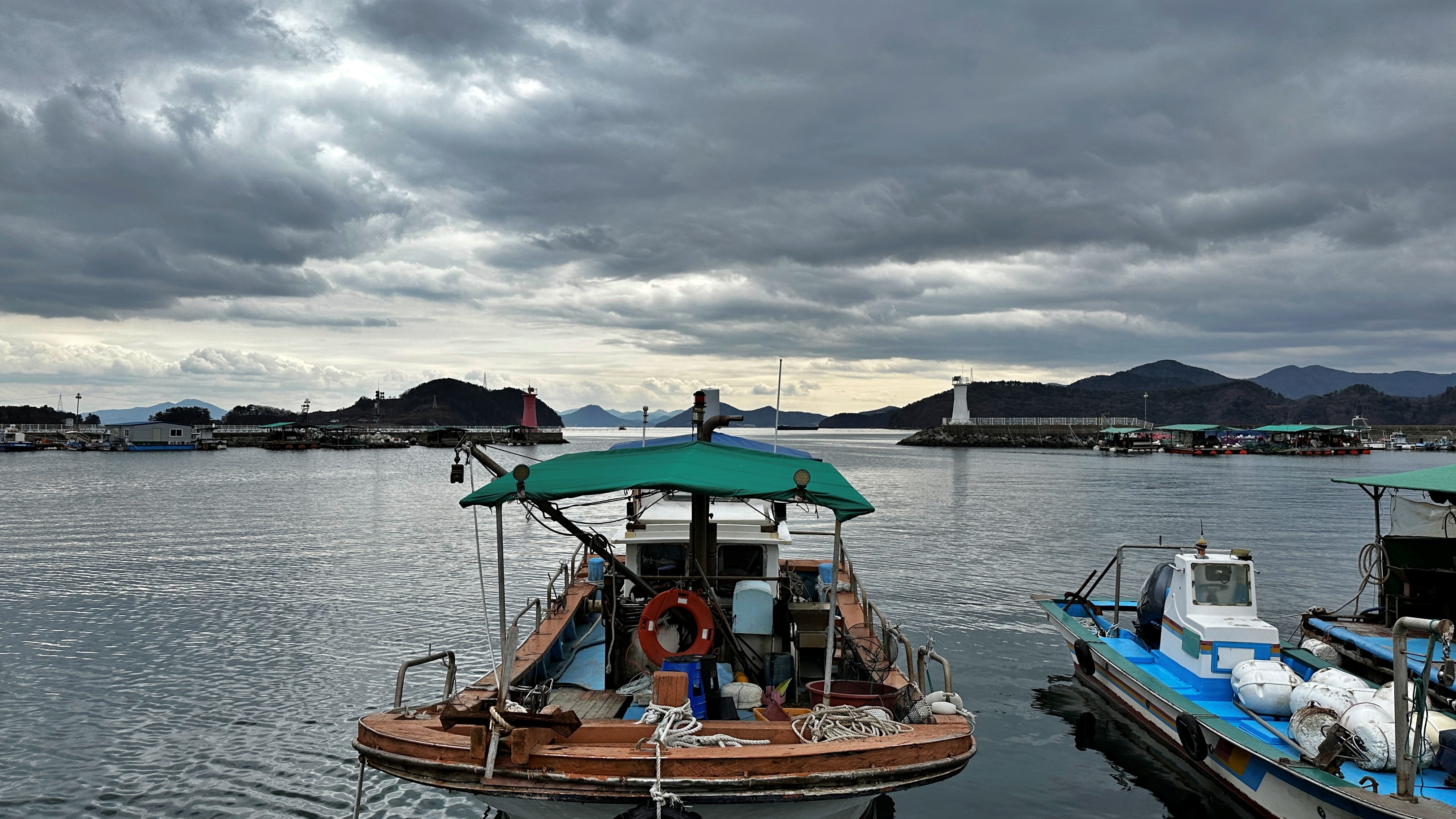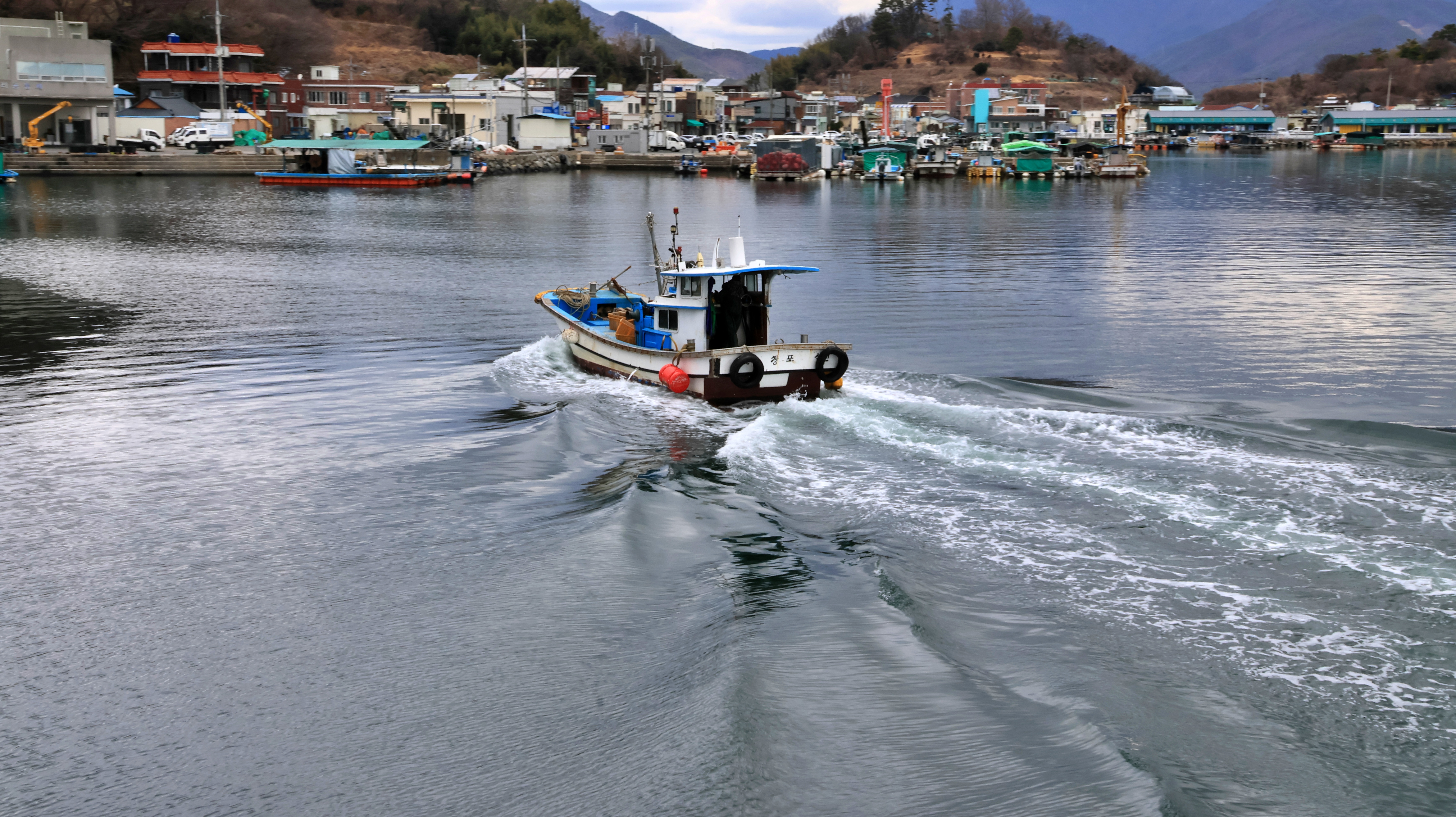 항구에는 지붕을 얹은 바지선들이 꽤 많은데 이들은 대부분 미더덕 작업장이었다. 이곳에서 직접 판매한다는 안내문도 더러 걸려 있었다. 양식장을 오가는 배가 한 척 들어오고 있다.