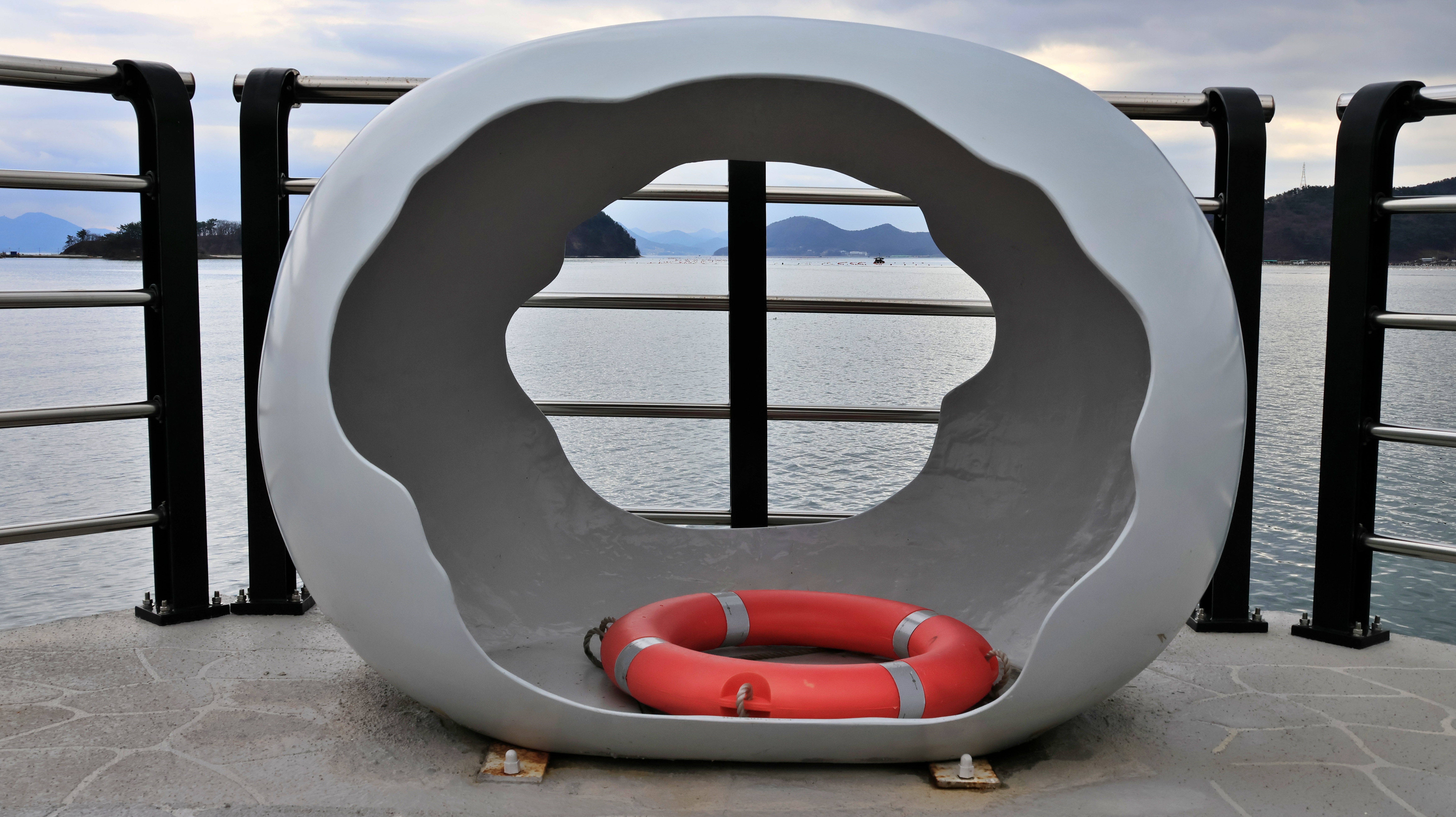 공룡 화석이 있는 동네라 조형물도 특이하다. 이건 공룡알을 형상화한 것으로 보이는데, 생뚱맞게 공룡 새깨 대신 구명대가 들어앉아 있다.